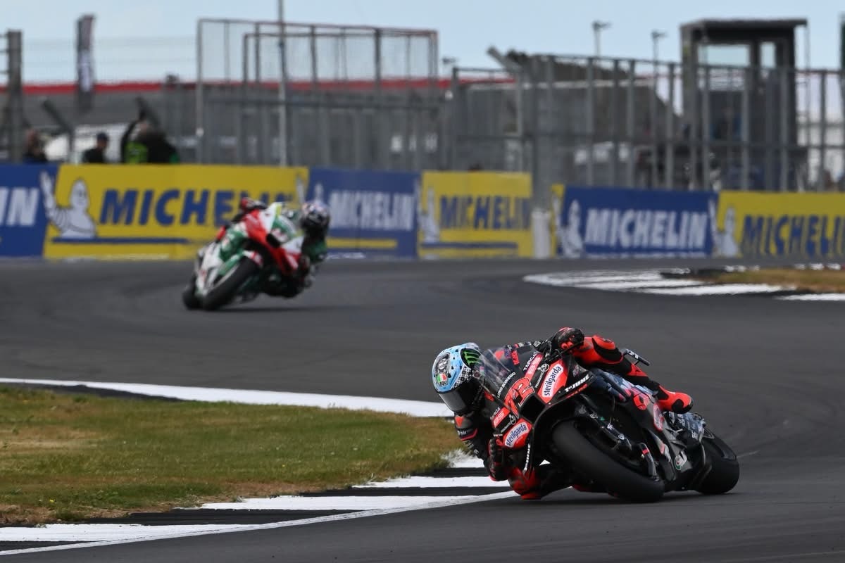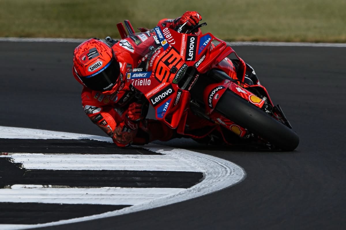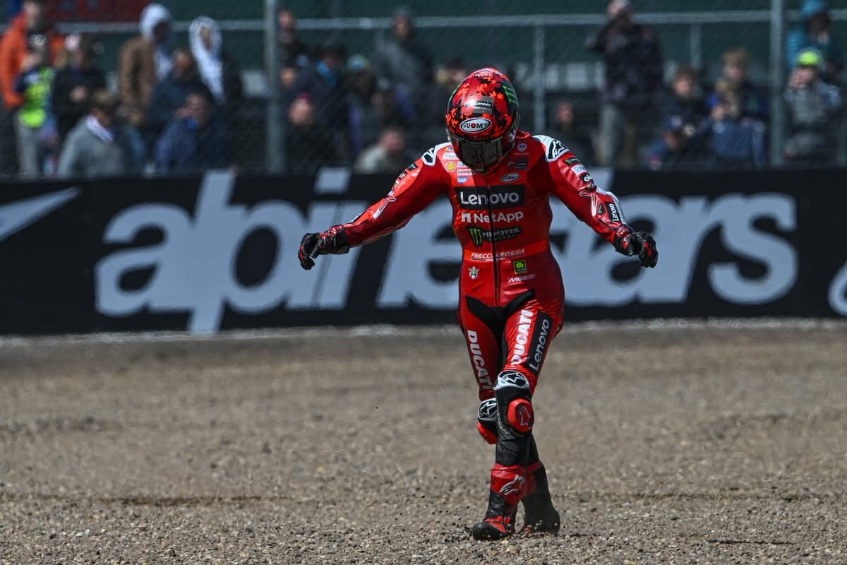 Dimanche, la Grande-Bretagne ne déçoit pas. Dès les premiers instants, Alex Márquez (Ducati Gresini) brillant vainqueur du Sprint, rate son freinage et chute dès le premier virage. Franco Morbidelli (Ducati VR46) subit le même sort quelques secondes plus tard. Profitant de cette confusion, Marc Márquez (Ducati) prend la tête devant Fabio Quartararo (Yamaha) qui espère enfin transformer sa pole en victoire. Mais alors qu’il mène la course, Marc Márquez se manque dans les „S“et chute à son tour.