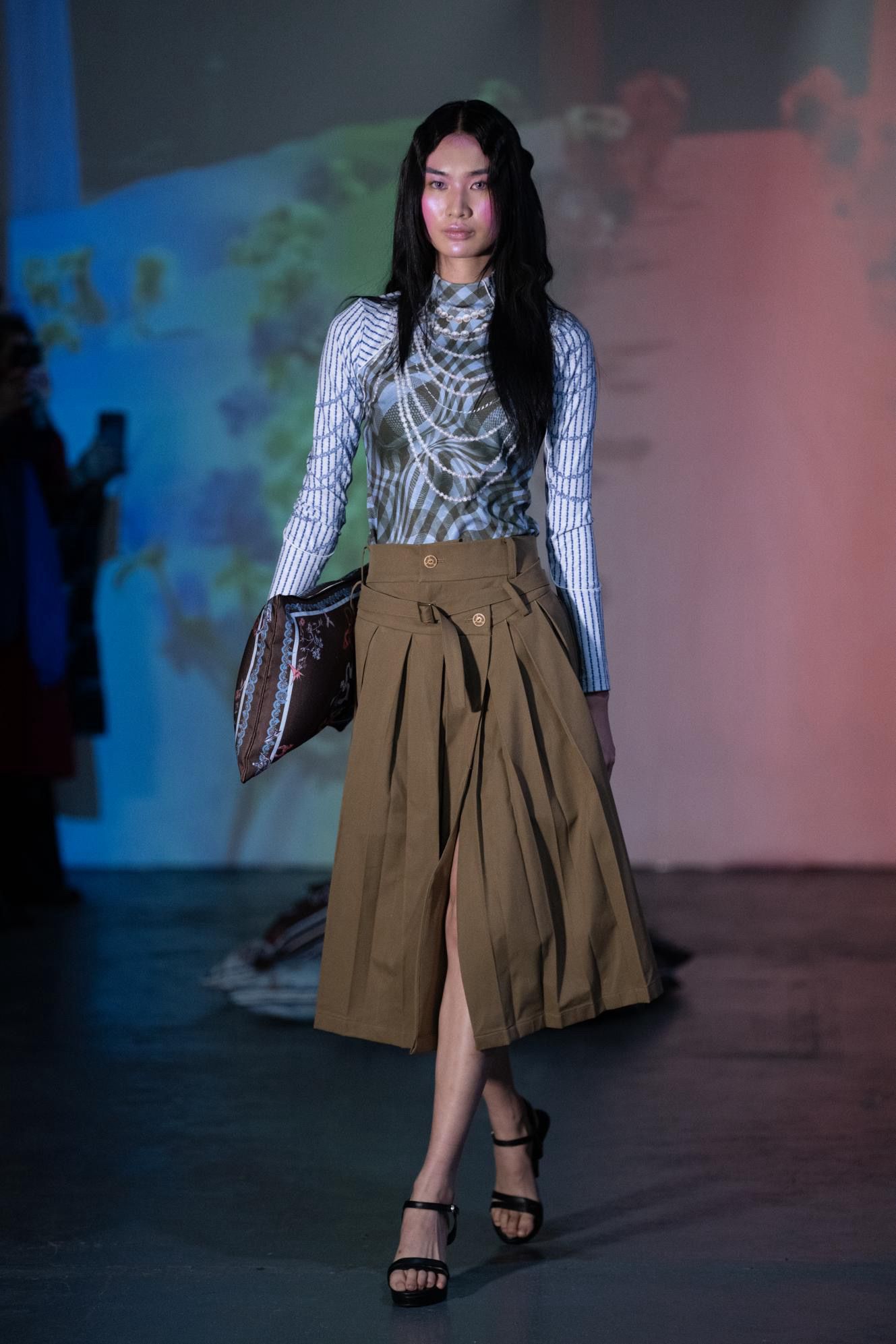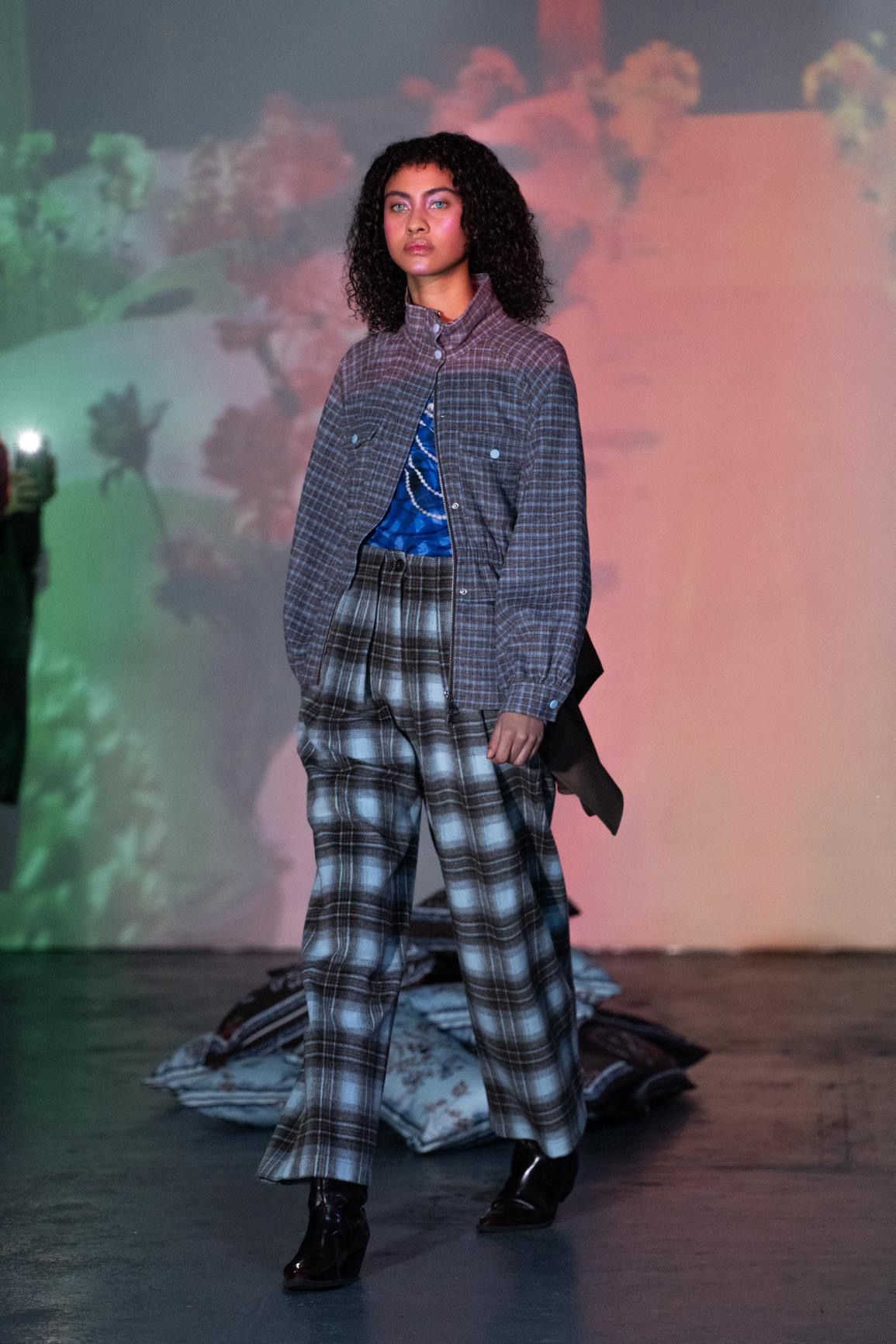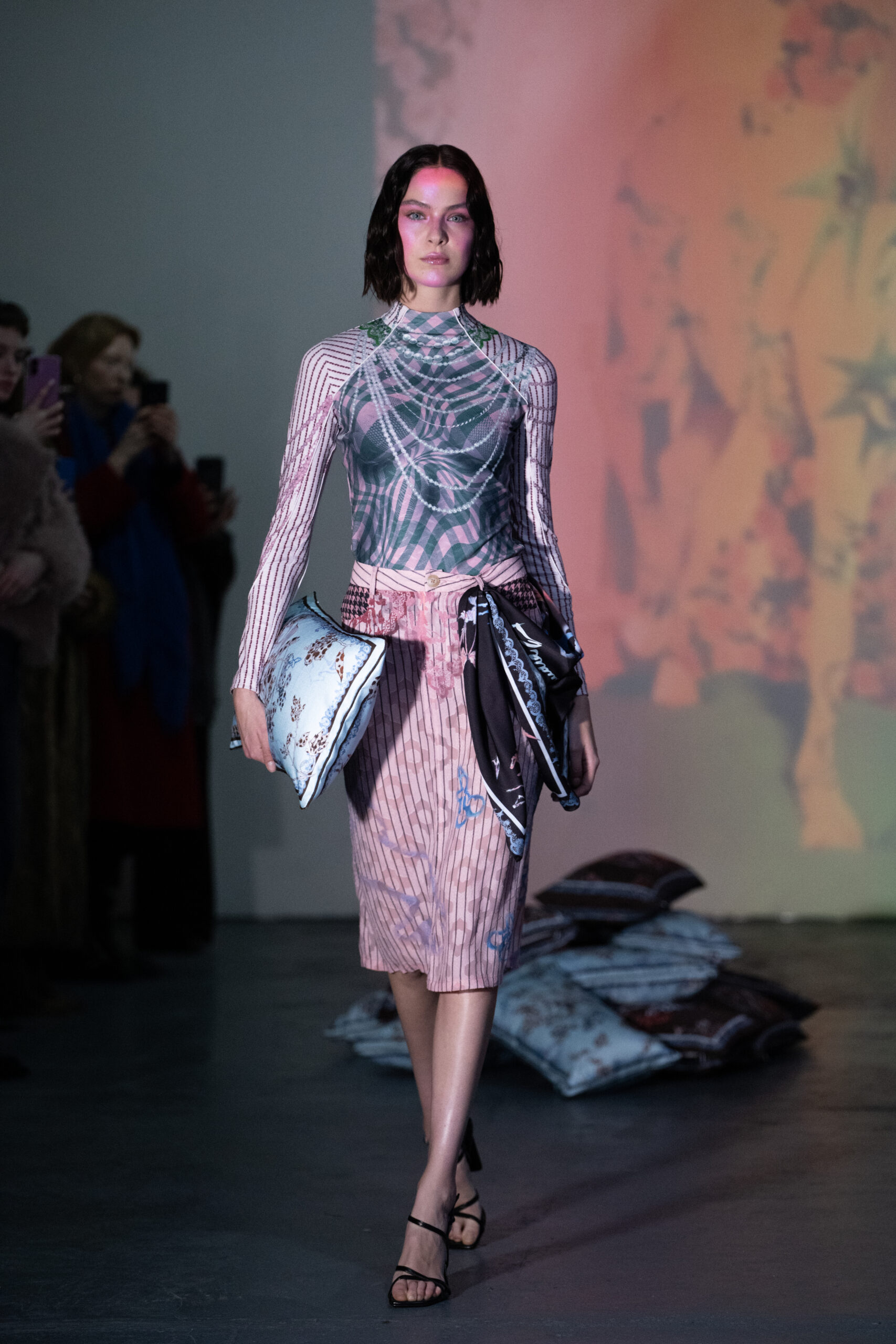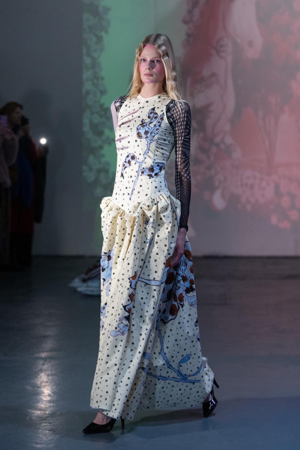 Wang’s presentation unfolds like a living fairytale, where every look is a chapter in a story of unbridled femininity. The models emerge amidst an ethereal landscape of plush pillow mounds, each one wrapped in the collection’s delicate custom prints – burring the line between a dream state and the runway.