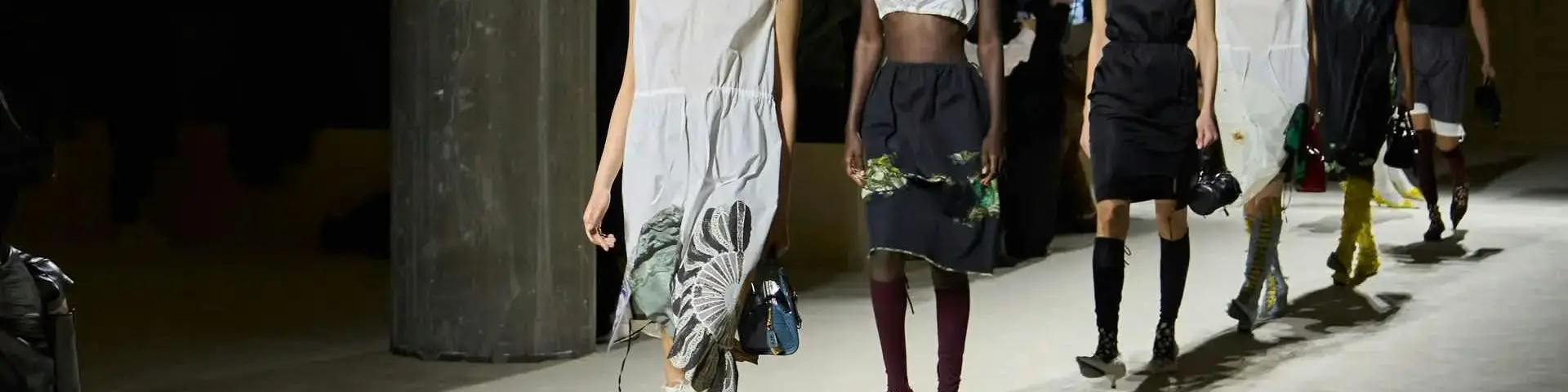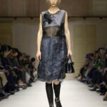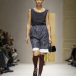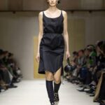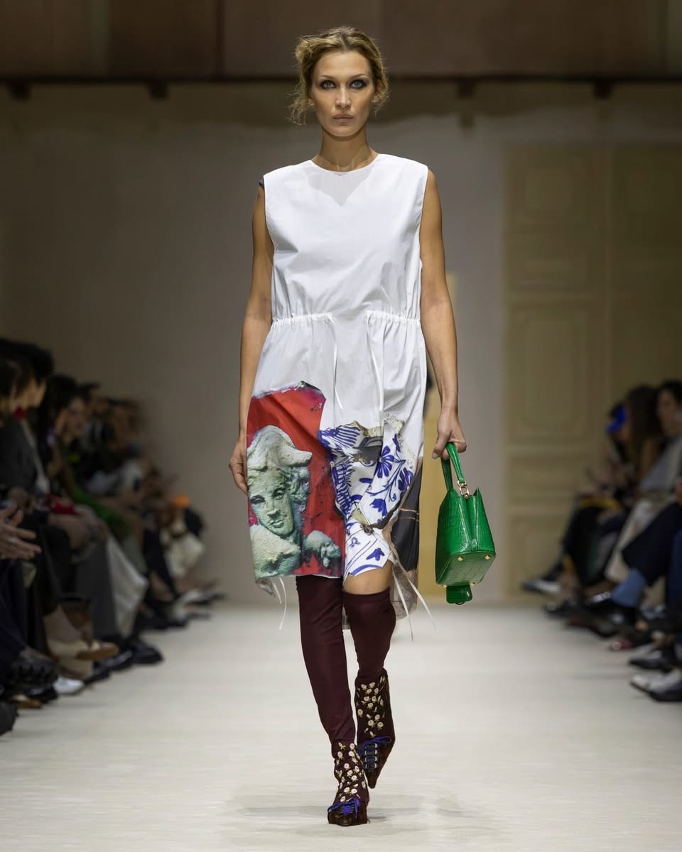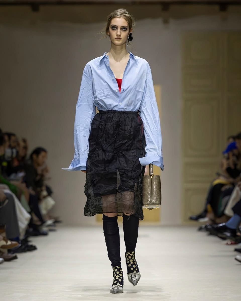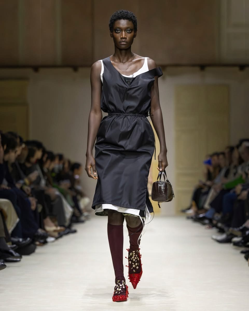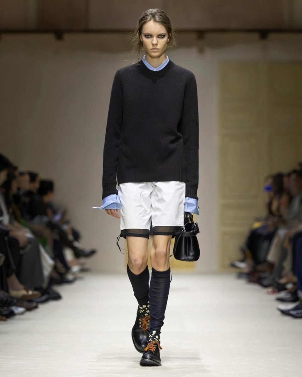 Ailleurs, des robes inspirées des années 50 se retrouvaient traversées par une fermeture éclair plongeante, héritage du style sportif de Raf Simons. Les chemises s’ouvraient largement. Les shorts et crop tops révélaient des couches transparentes. Tout semblait dire : rien n’est figé, tout peut se transformer au fil de la journée. Prada décrit cette collection comme le reflet des réalités multiples des femmes. Une mode qui accompagne, qui s’adapte, qui raconte. Une mode qui ne cherche pas la perfection, mais la vérité.
