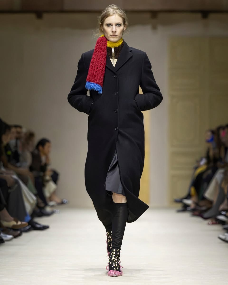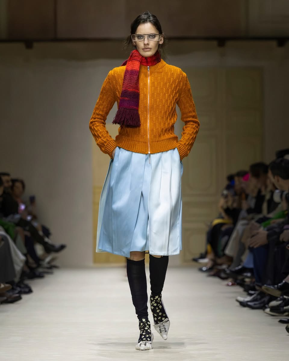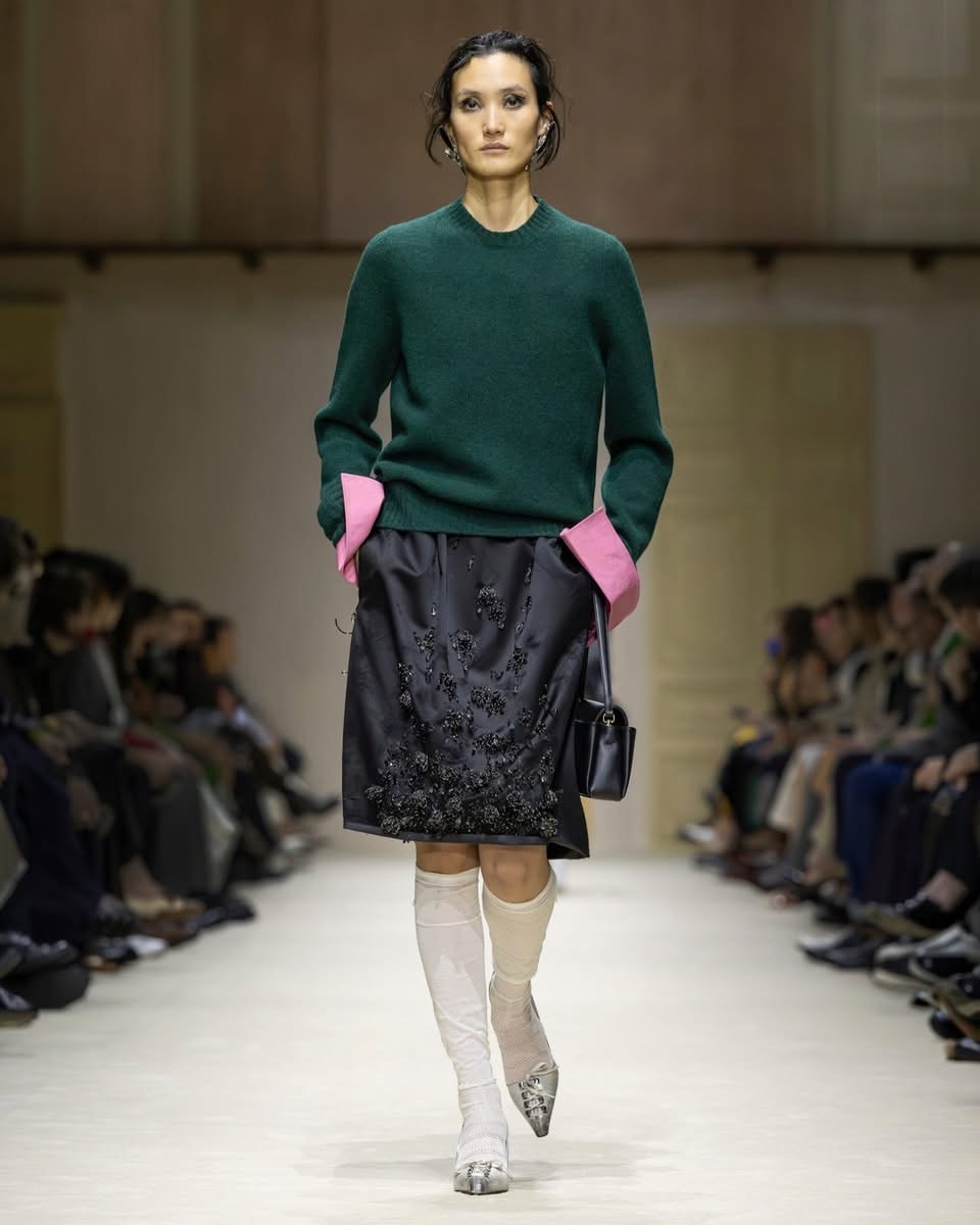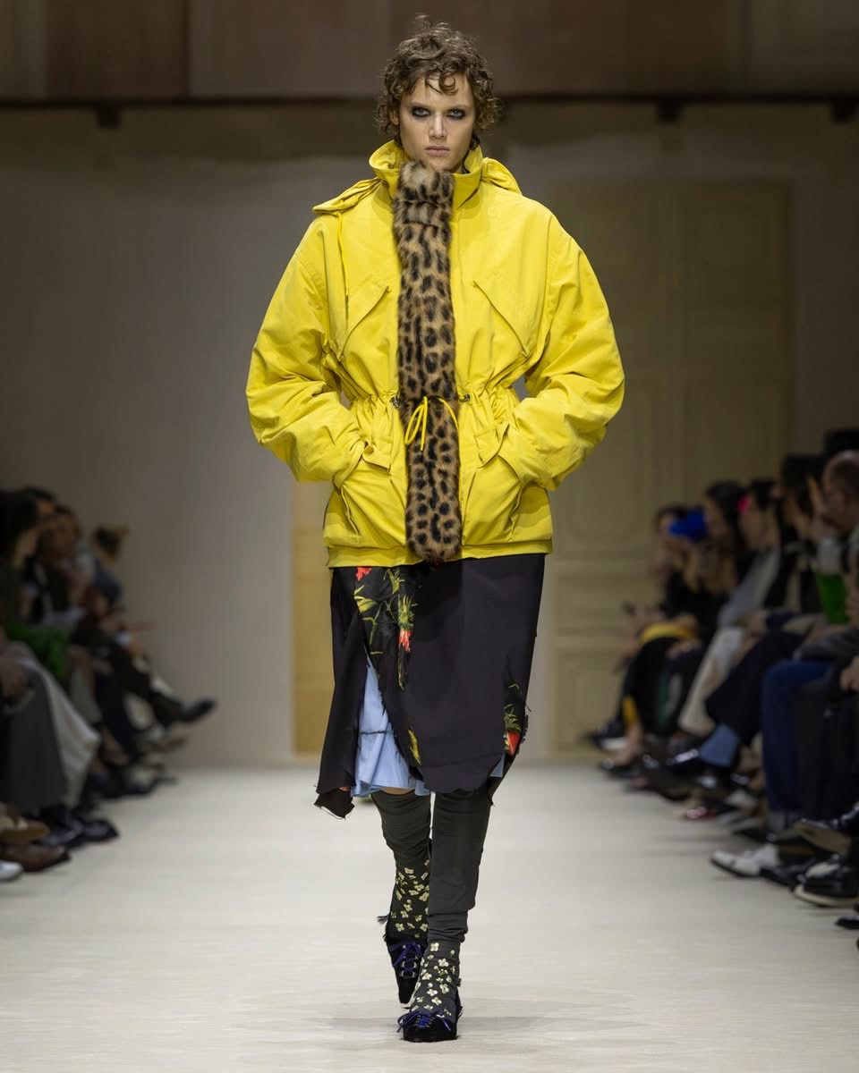 Le show s’ouvre sur une série de manteaux cintrés, légèrement raccourcis, portés avec des foulards arc-en-ciel, des poignets XXL, des cravates en fausse fourrure. Un manteau se superpose à une parka jaune vif, presque comme un gilet de sauvetage. Clin d’œil à Miuccia Prada, plusieurs mannequins ferment leur manteau d’une seule main, ce geste devenu signature. L’uniforme fétiche de la créatrice, le duo pull et jupe midi, revient lui aussi, mais twisté, bousculé, réinventé. Aux pieds, des escarpins pastel à petits talons, incrustés de mini-cristaux façon lustre, portés avec des chaussettes tout aussi décorées. Une audace tranquille, presque insolente.