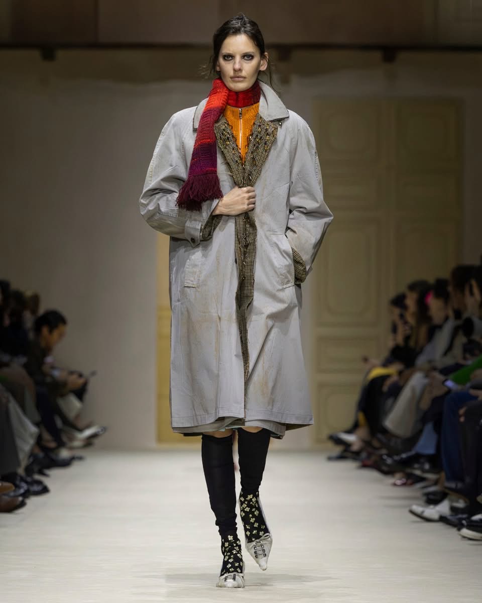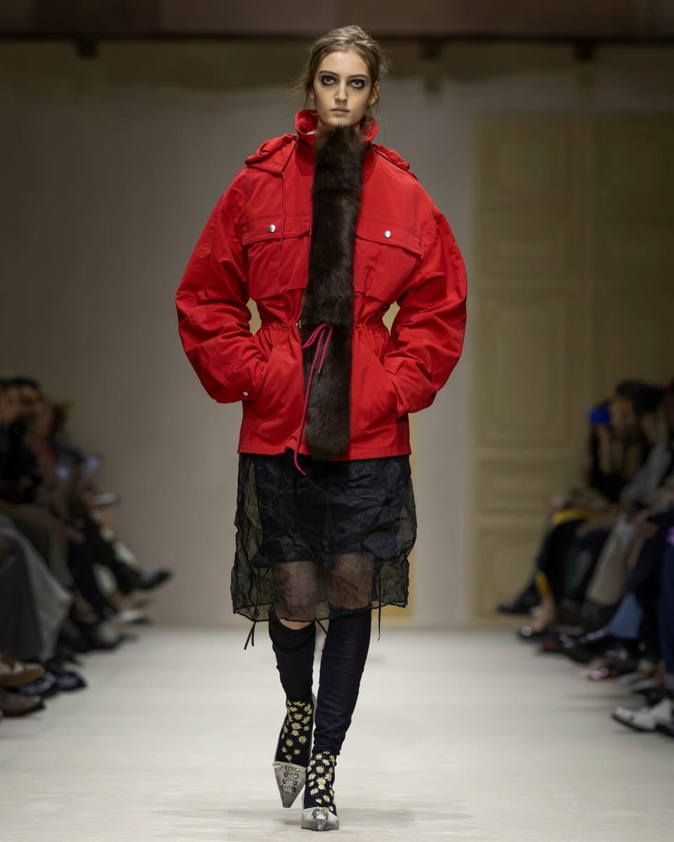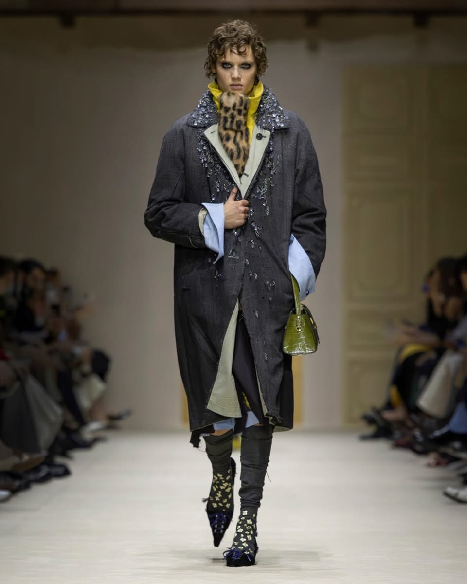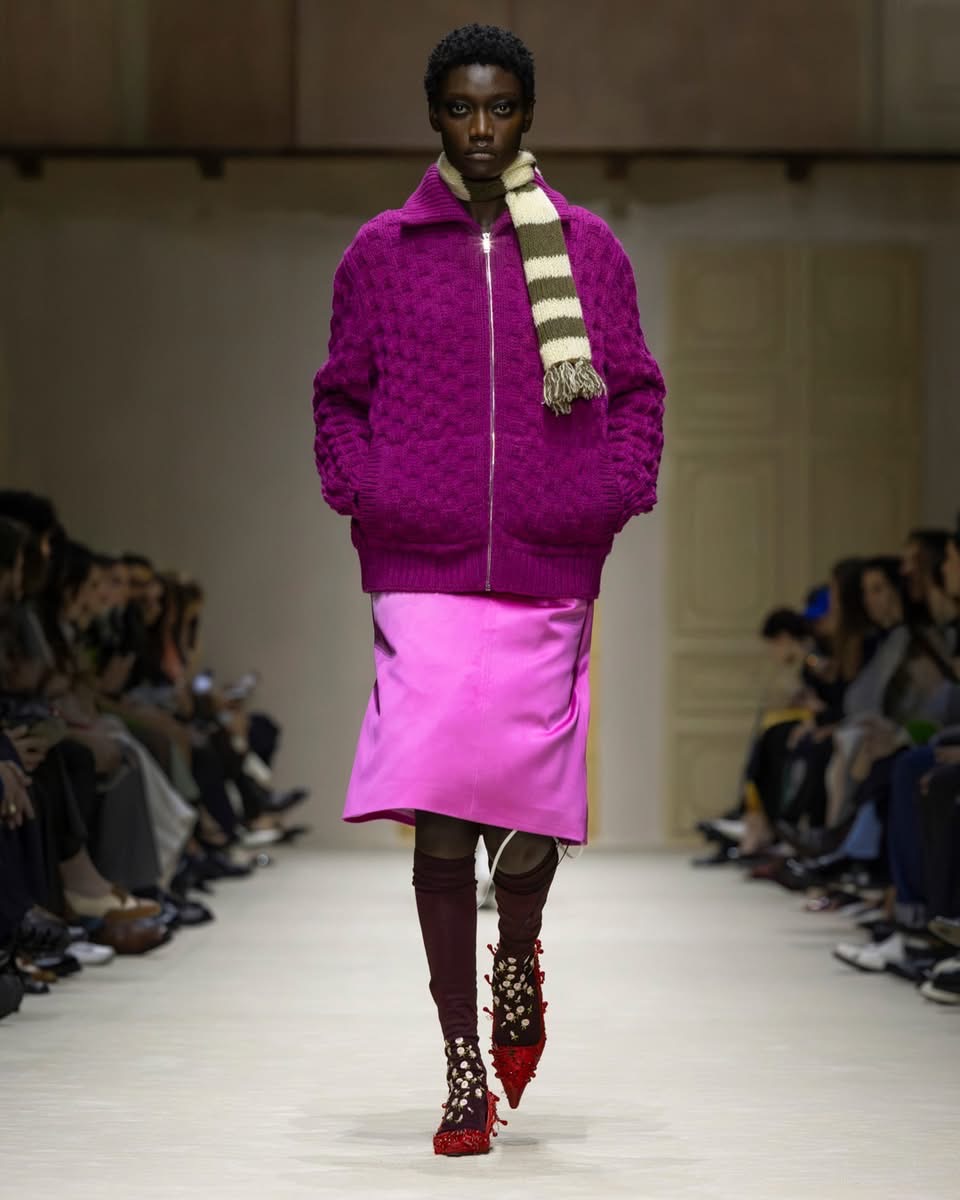 Le show s’ouvre sur une série de manteaux cintrés, légèrement raccourcis, portés avec des foulards arc-en-ciel, des poignets XXL, des cravates en fausse fourrure. Un manteau se superpose à une parka jaune vif, presque comme un gilet de sauvetage. Clin d’œil à Miuccia Prada, plusieurs mannequins ferment leur manteau d’une seule main, ce geste devenu signature. L’uniforme fétiche de la créatrice, le duo pull et jupe midi, revient lui aussi, mais twisté, bousculé, réinventé. Aux pieds, des escarpins pastel à petits talons, incrustés de mini-cristaux façon lustre, portés avec des chaussettes tout aussi décorées. Une audace tranquille, presque insolente.