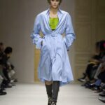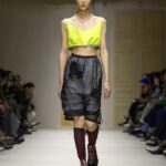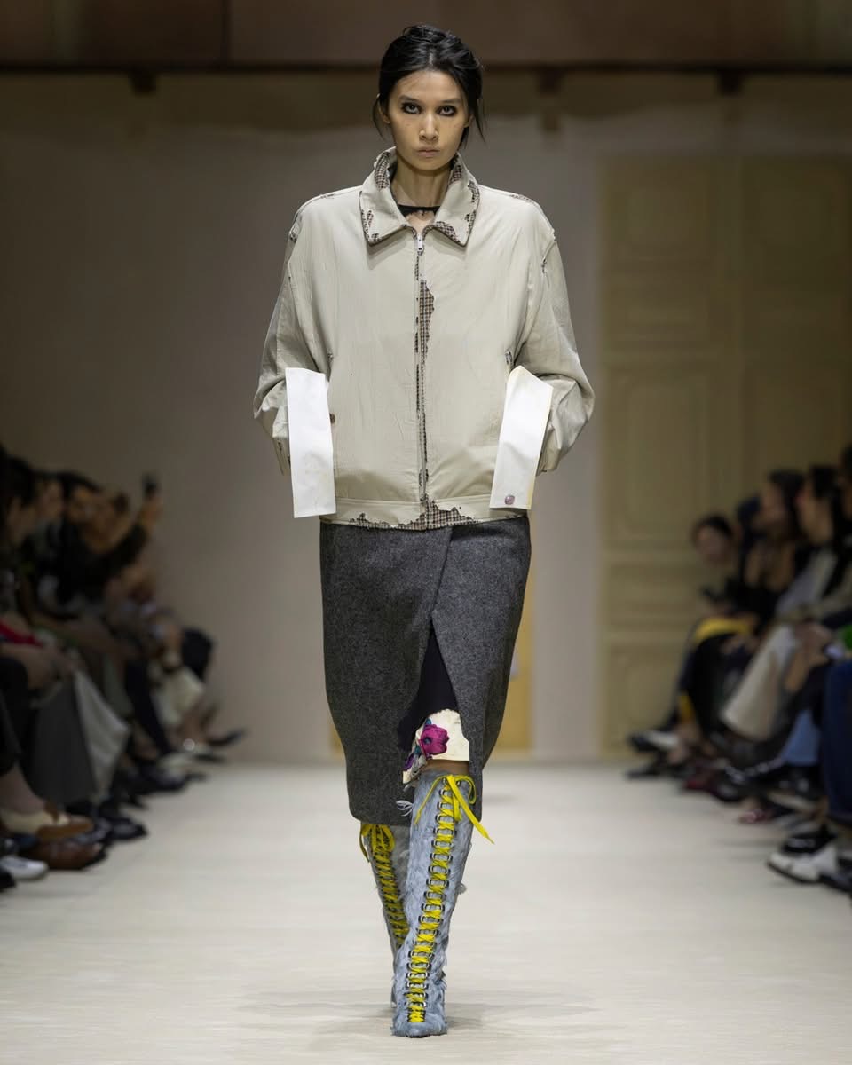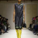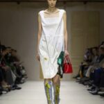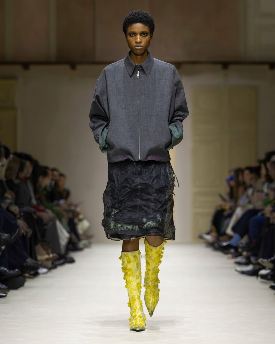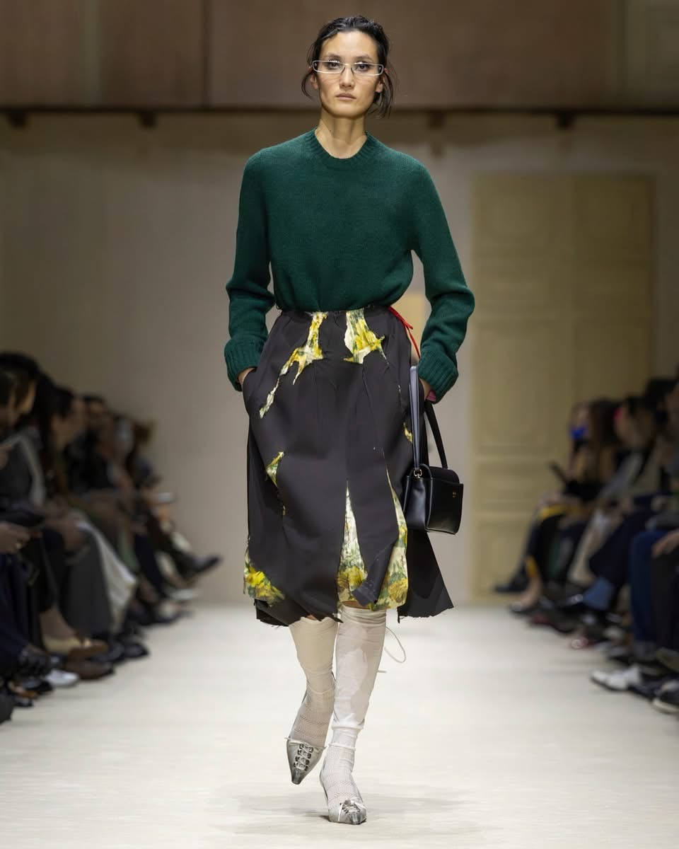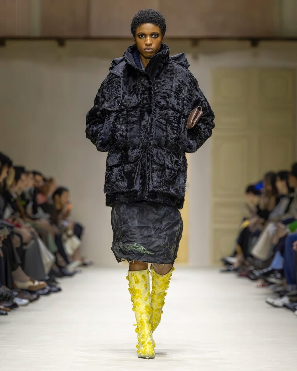 Le show s’ouvre sur une série de manteaux cintrés, légèrement raccourcis, portés avec des foulards arc-en-ciel, des poignets XXL, des cravates en fausse fourrure. Un manteau se superpose à une parka jaune vif, presque comme un gilet de sauvetage. Clin d’œil à Miuccia Prada, plusieurs mannequins ferment leur manteau d’une seule main, ce geste devenu signature. L’uniforme fétiche de la créatrice, le duo pull et jupe midi, revient lui aussi, mais twisté, bousculé, réinventé. Aux pieds, des escarpins pastel à petits talons, incrustés de mini-cristaux façon lustre, portés avec des chaussettes tout aussi décorées. Une audace tranquille, presque insolente.