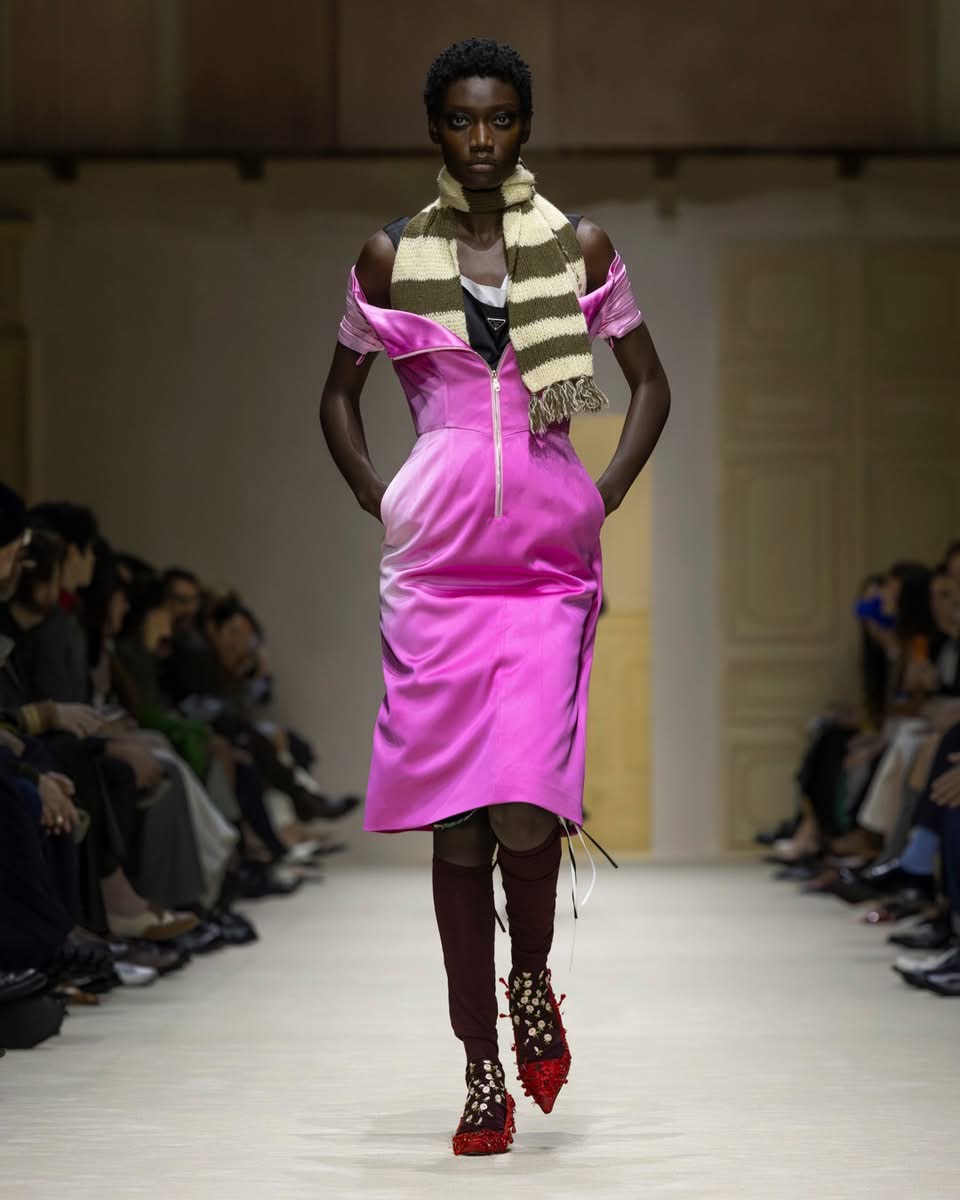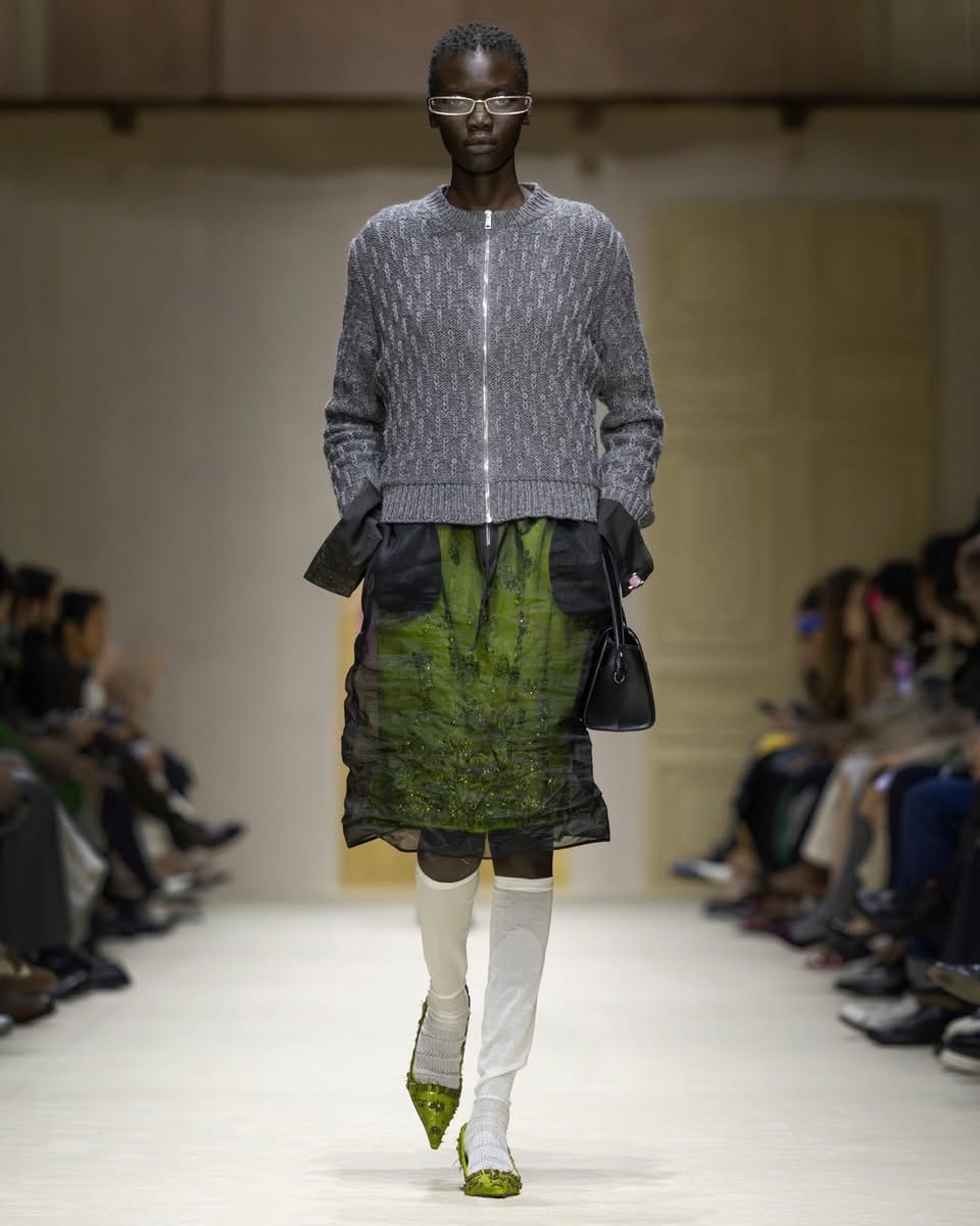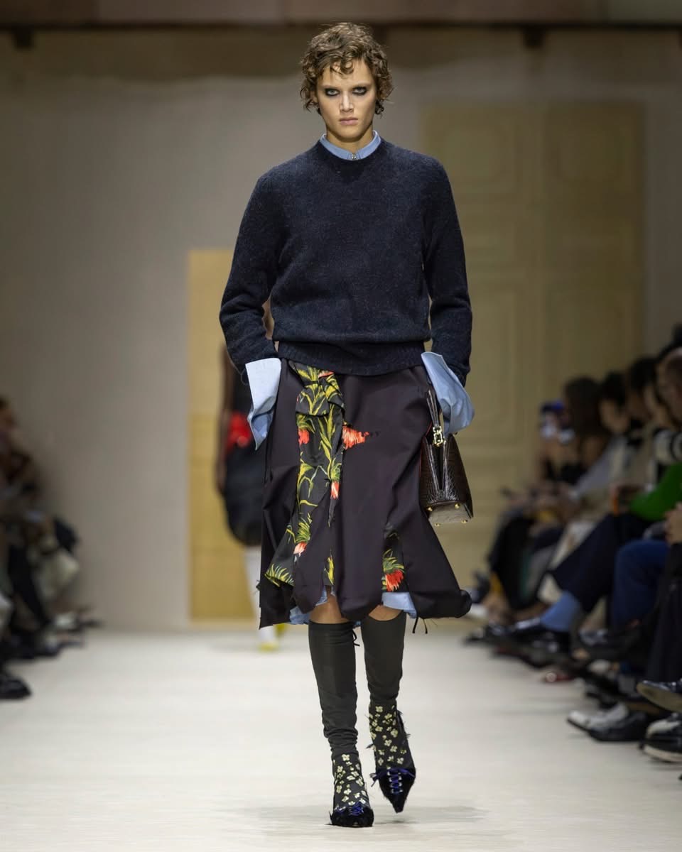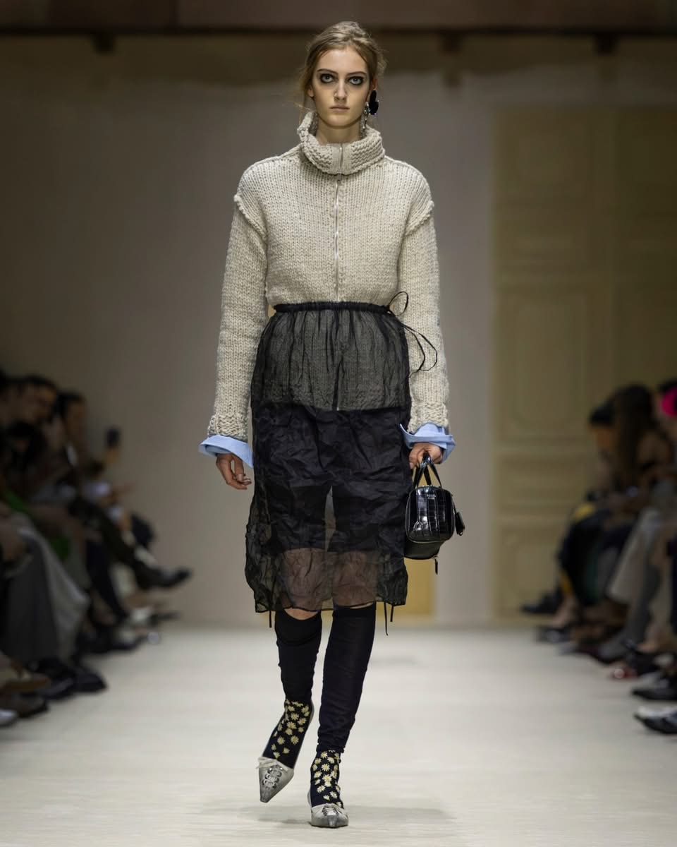 Cette saison, Prada ne raconte pas une femme. Elle en raconte mille. Celles qui courent, qui jonglent, qui pensent trop vite, qui vivent trop fort. Celles qui superposent un pull sur une robe parce qu’il fait froid, ou parce que ça leur plaît. Celles qui n’ont pas peur d’être contradictoires. Dans le défilé milanais, cette complexité prend forme dans des silhouettes qui semblent construites par couches successives, comme si la vie elle-même avait posé les vêtements un par un. Des cuirs épais côtoient des jupes transparentes. Des pulls massifs se glissent sous des robes délicates. Des trenchs classiques s’ouvrent sur des doublures bijoux. Rien n’est lisse. Tout est vivant.