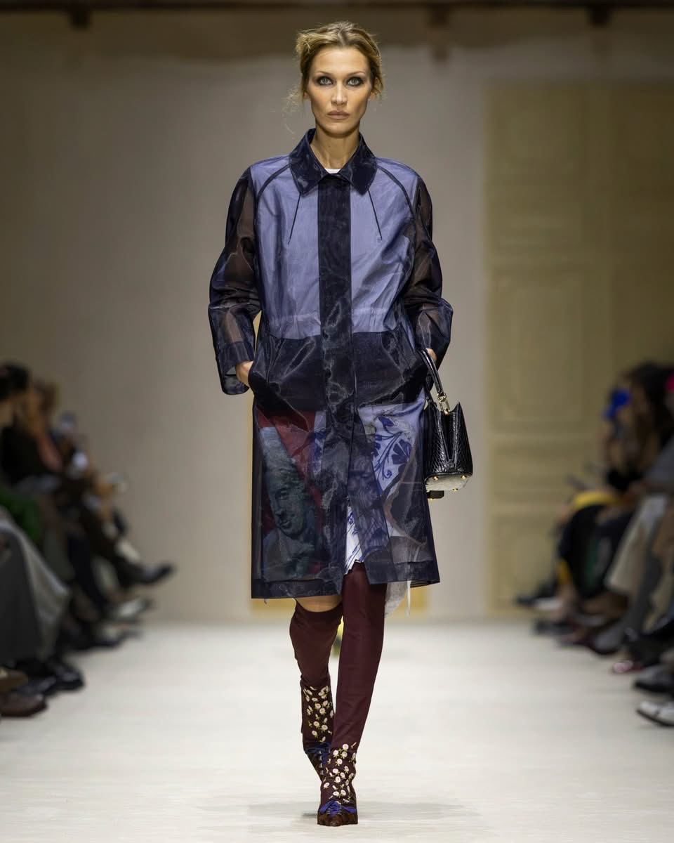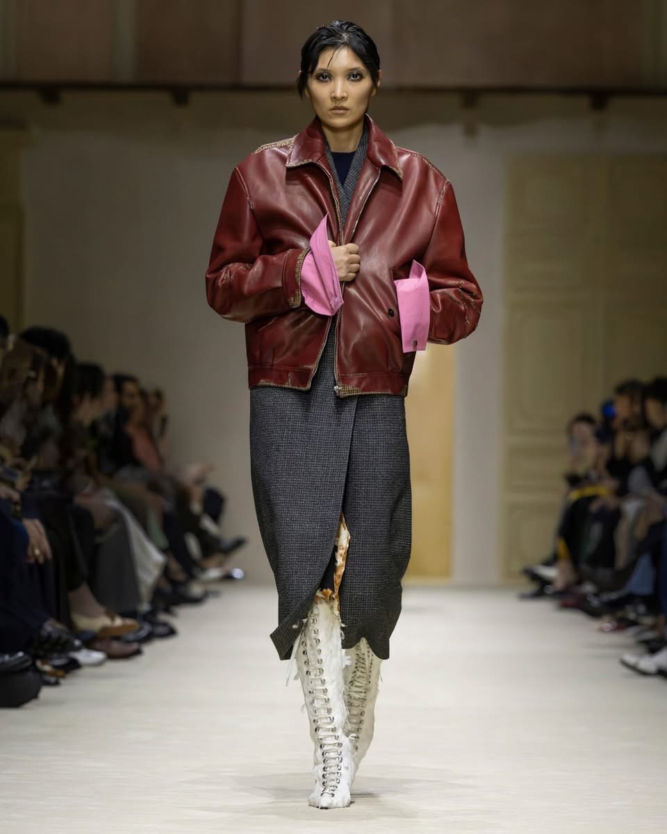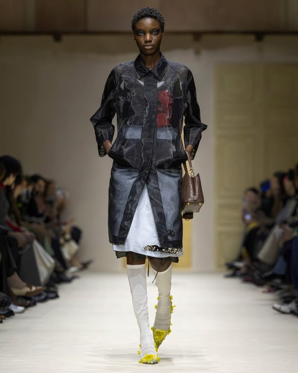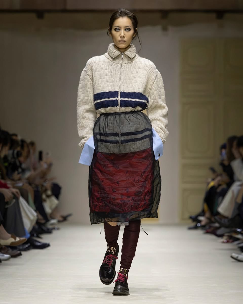 Cette saison, Prada ne raconte pas une femme. Elle en raconte mille. Celles qui courent, qui jonglent, qui pensent trop vite, qui vivent trop fort. Celles qui superposent un pull sur une robe parce qu’il fait froid, ou parce que ça leur plaît. Celles qui n’ont pas peur d’être contradictoires. Dans le défilé milanais, cette complexité prend forme dans des silhouettes qui semblent construites par couches successives, comme si la vie elle-même avait posé les vêtements un par un. Des cuirs épais côtoient des jupes transparentes. Des pulls massifs se glissent sous des robes délicates. Des trenchs classiques s’ouvrent sur des doublures bijoux. Rien n’est lisse. Tout est vivant.