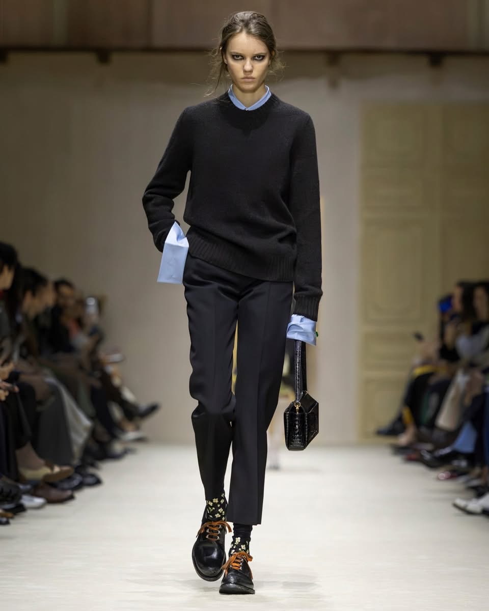À l’heure où l’intelligence artificielle façonne des images impeccables, Prada prend le contre-pied. La maison revendique l’imperfection, l’accident, le geste humain. Ces superpositions chaotiques, ces plis volontaires, ces associations improbables sont autant de preuves d’une créativité qui refuse les algorithmes. La collection automne 2026 de Prada célèbre ce que seule la main humaine peut produire : des erreurs magnifiques, des contrastes inattendus, des émotions brutes. Une mode qui respire, qui trébuche, qui s’élève.