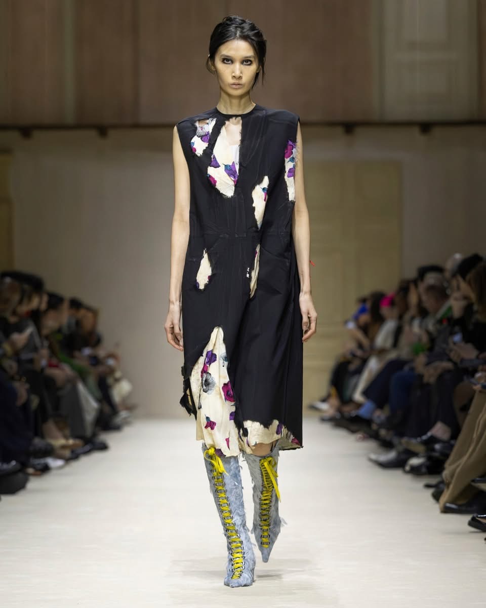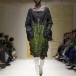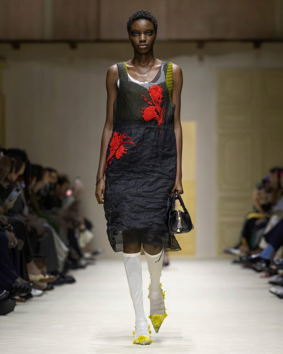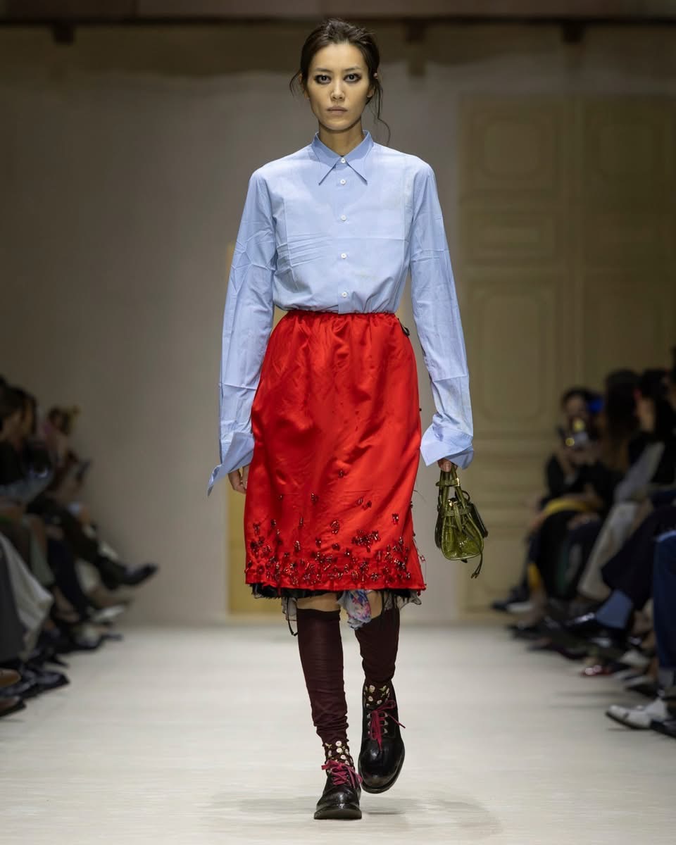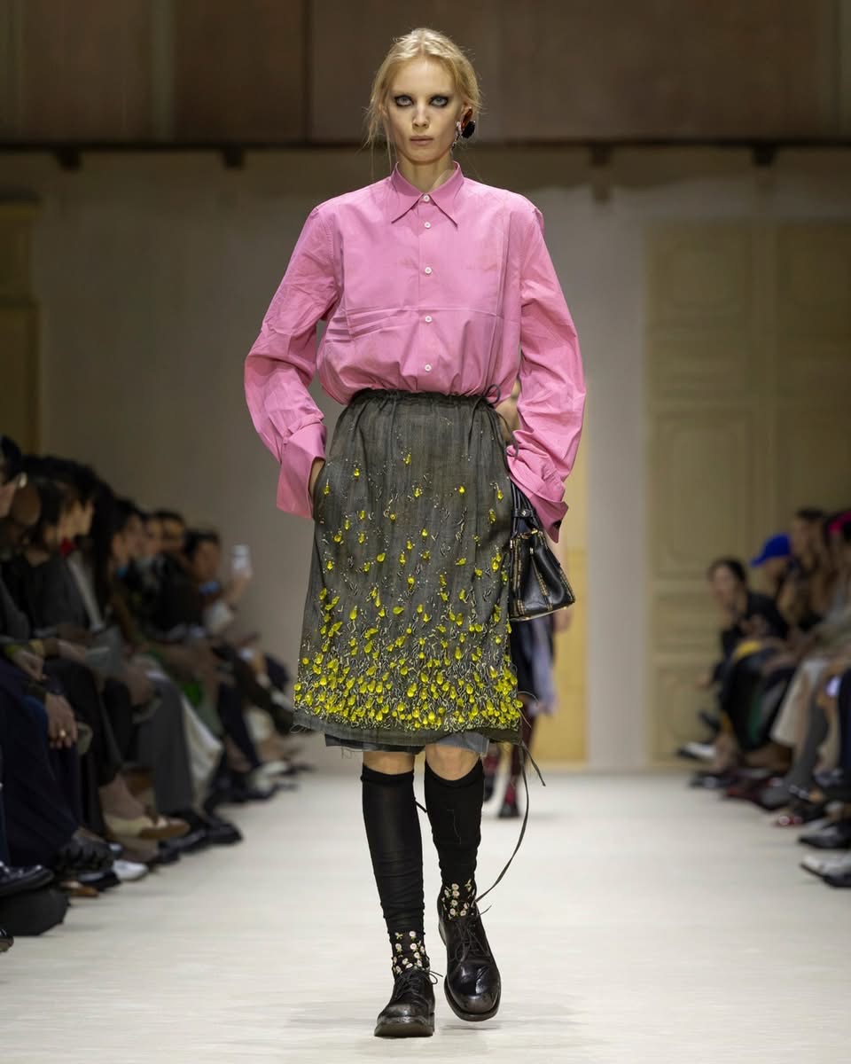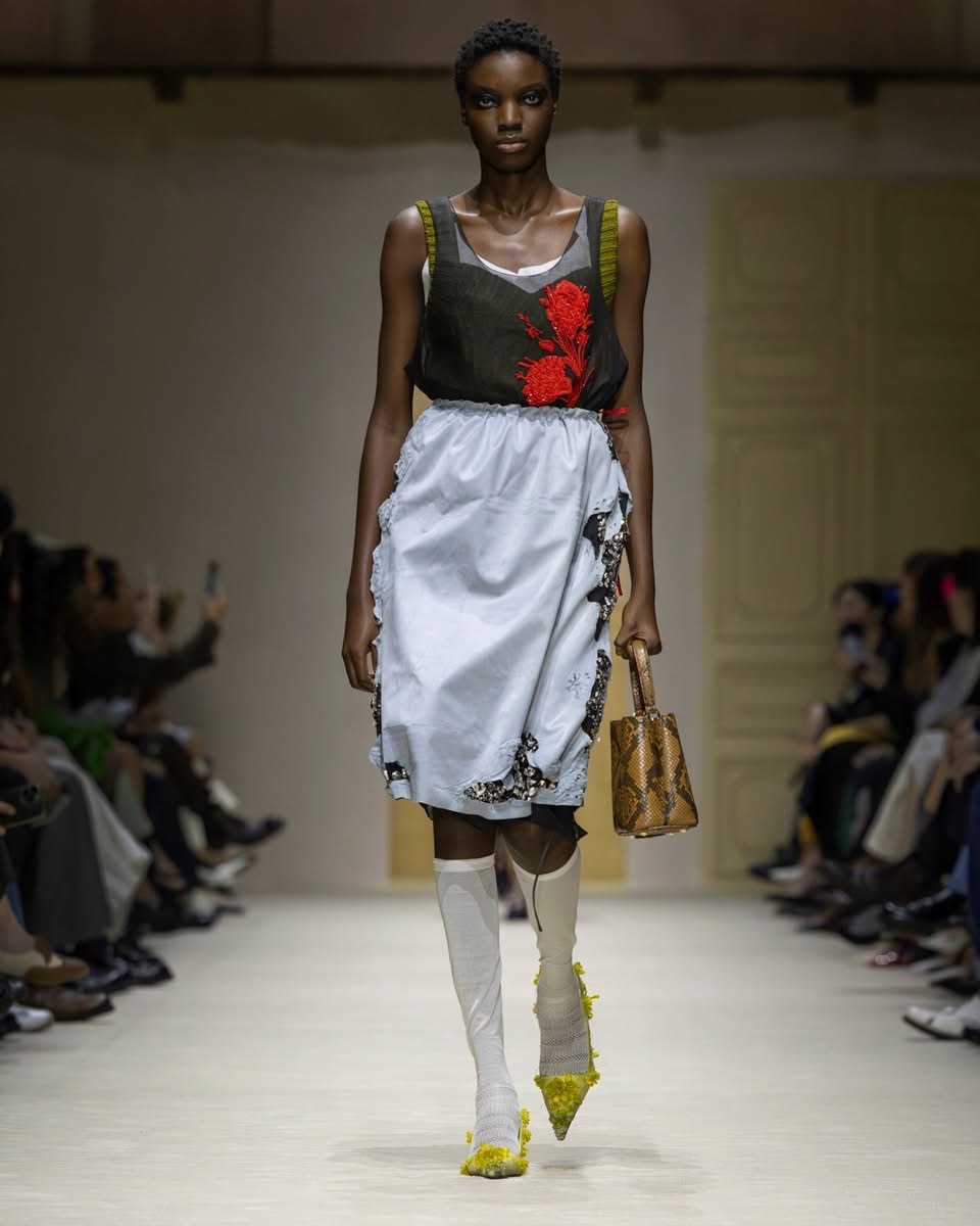 Pour comprendre cette collection, il fallait regarder les couches. Les accumulations. Les collisions. Les vêtements semblaient raconter une urgence, une spontanéité, un besoin de dire beaucoup en même temps. Une robe rose délicatement décollée laissait apparaître une écharpe rayée XXL. Des plis volontaires, des déchirures assumées, des pans de tissu qui s’échappent comme des pensées trop rapides. La déconstruction n’était jamais froide. Elle était ponctuée de fantaisie : imprimés floraux transparents, jupes perlées superposées, éclats de couleurs inattendus. Et pour couronner le tout, une coiffure décoiffée, signature Prada, comme si les mannequins sortaient d’une journée trop pleine, trop belle, trop intense.