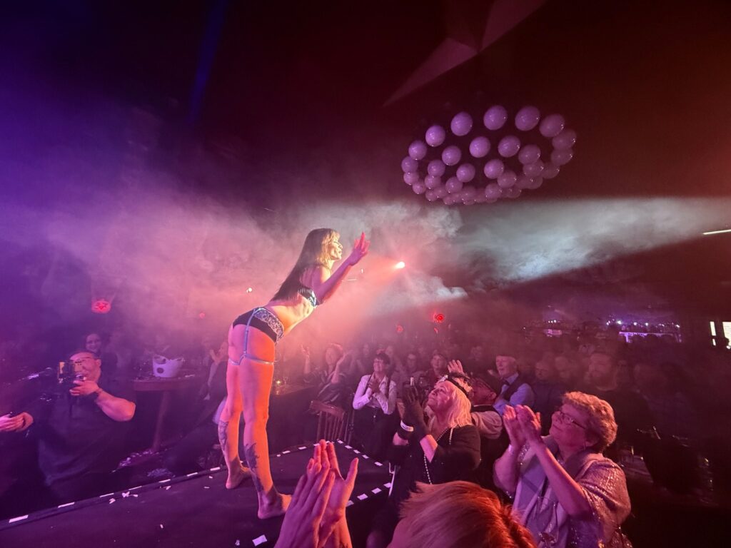 Le final a été un souffle. La mariée est apparue comme une apparition, vêtue d’une nuisette beige rosé, brodée de pierres et ourlée de dentelle. Une traîne aérienne flottait derrière elle, si légère qu’on aurait cru qu’elle respirait. Sur sa tête, une couronne de pierres précieuses, évoquant des épines dorées. Un contraste saisissant entre douceur et danger, innocence et pouvoir. Elle avançait comme une héroïne antique, une figure née d’un mythe oublié. Le maquillage minimaliste, les cheveux légèrement décoiffés, l’absence de bijoux ostentatoires donnaient à l’ensemble une sensualité discrète. Une manière de rappeler que la vraie opulence n’a pas besoin de crier.