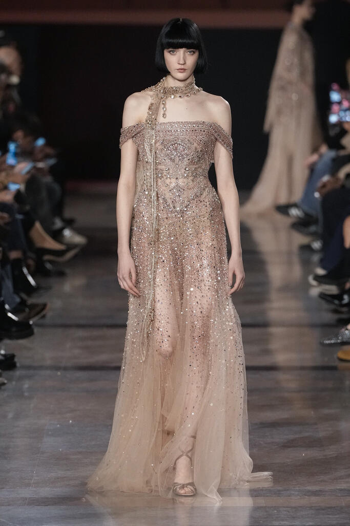 Le podium baignait dans une lumière de lune artificielle, presque liquide. Les teintes blush, bronze et sable du désert glissaient sur les silhouettes comme des ombres chaudes. On aurait dit un coucher de soleil qui refusait de mourir. Ces couleurs, déjà omniprésentes cette semaine à Paris, trouvaient ici une profondeur nouvelle, comme si Elie Saab les avait trempées dans ses propres souvenirs.