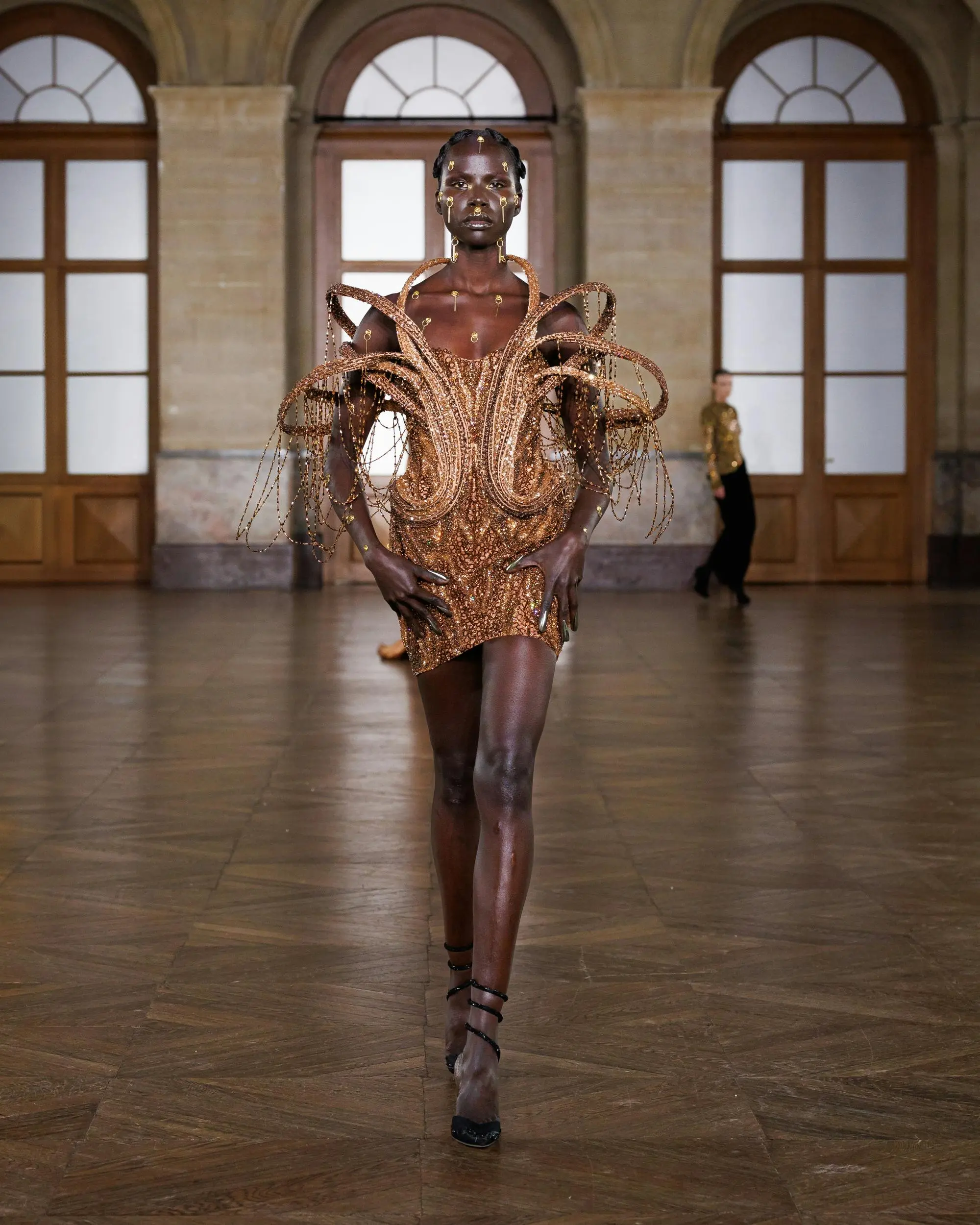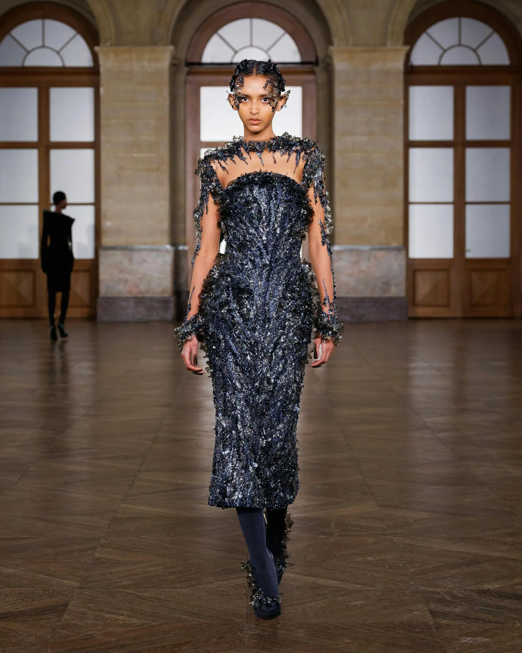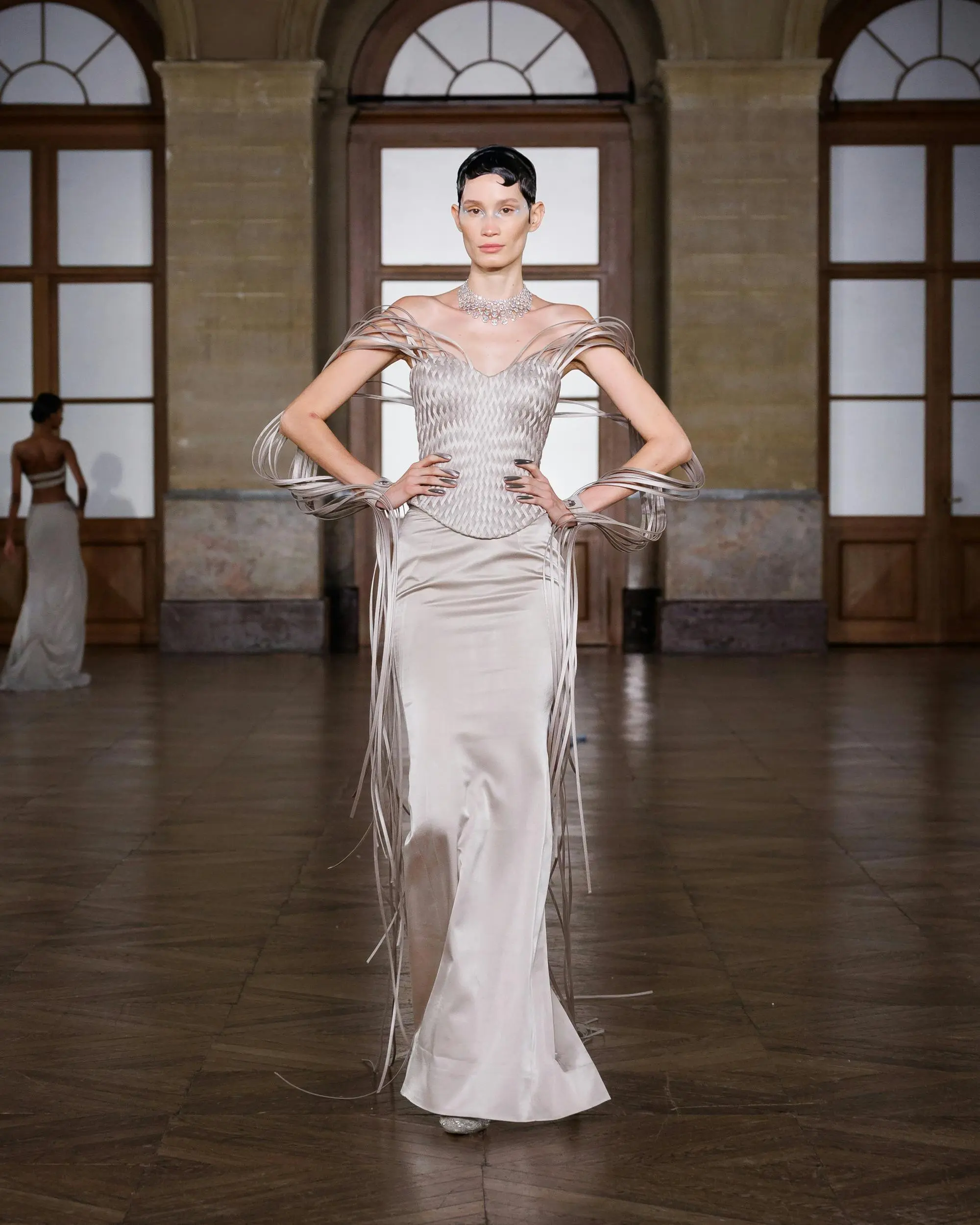 Le dernier mouvement faisait éclater la chronologie. Des mécanismes d’horlogerie déconstruits, des réseaux orbitaux, plus de 30 000 cristaux Preciosa qui vibraient comme des particules en suspension. Le temps n’était plus une ligne, mais une pulsation. Au centre de cette constellation, un corset monumental inspiré des statues de temple. Figé, mais traversé d’une énergie presque respirante. Une pièce qui semblait hésiter entre l’immobilité sacrée et le mouvement cosmique.