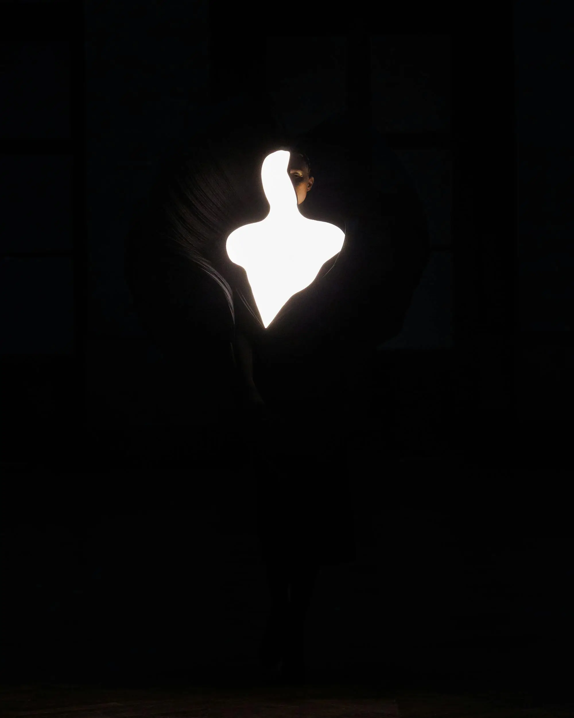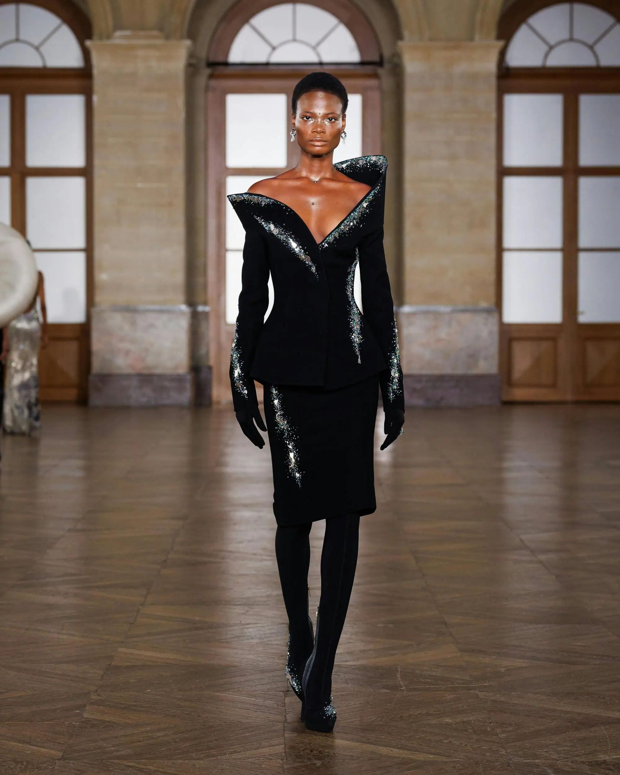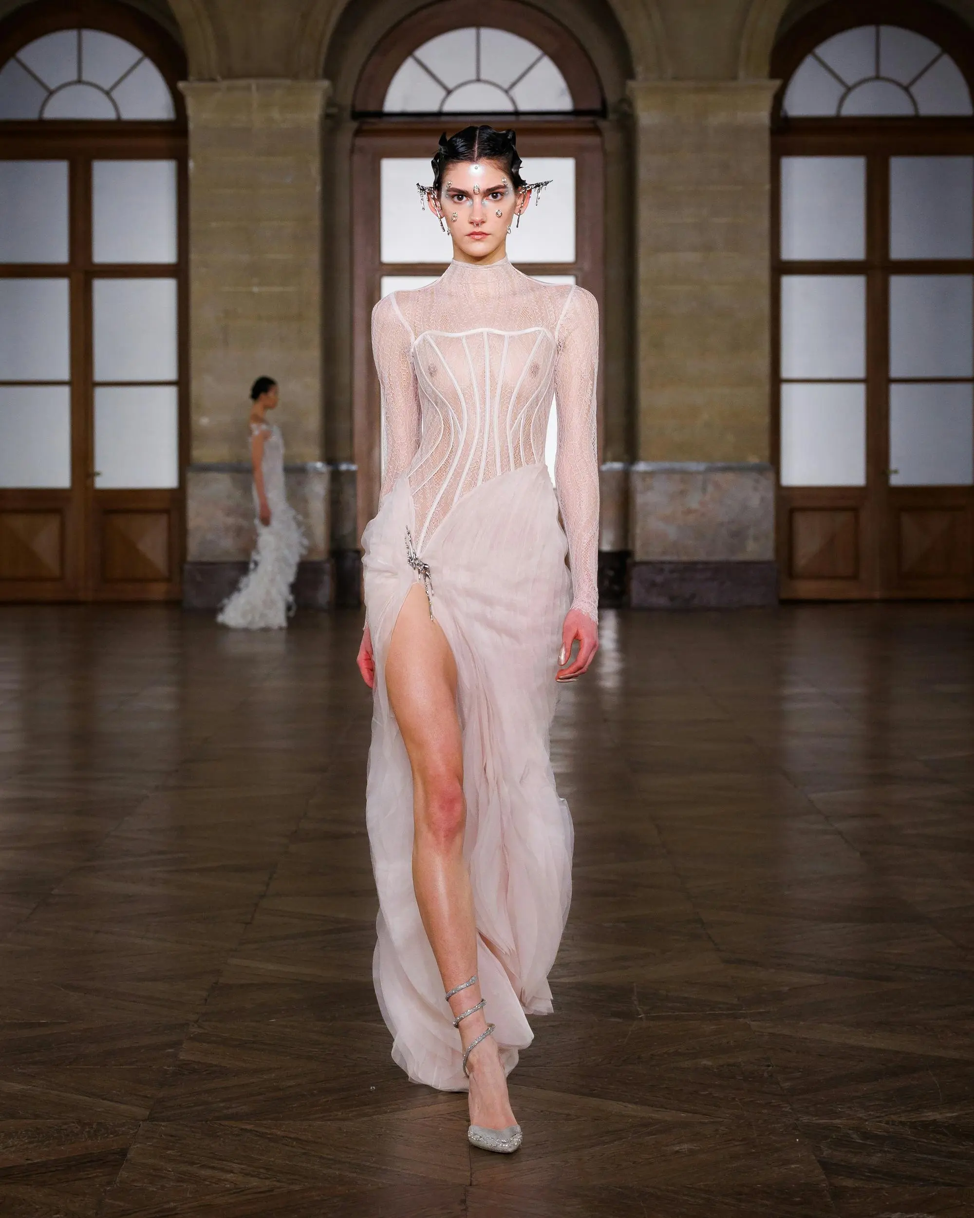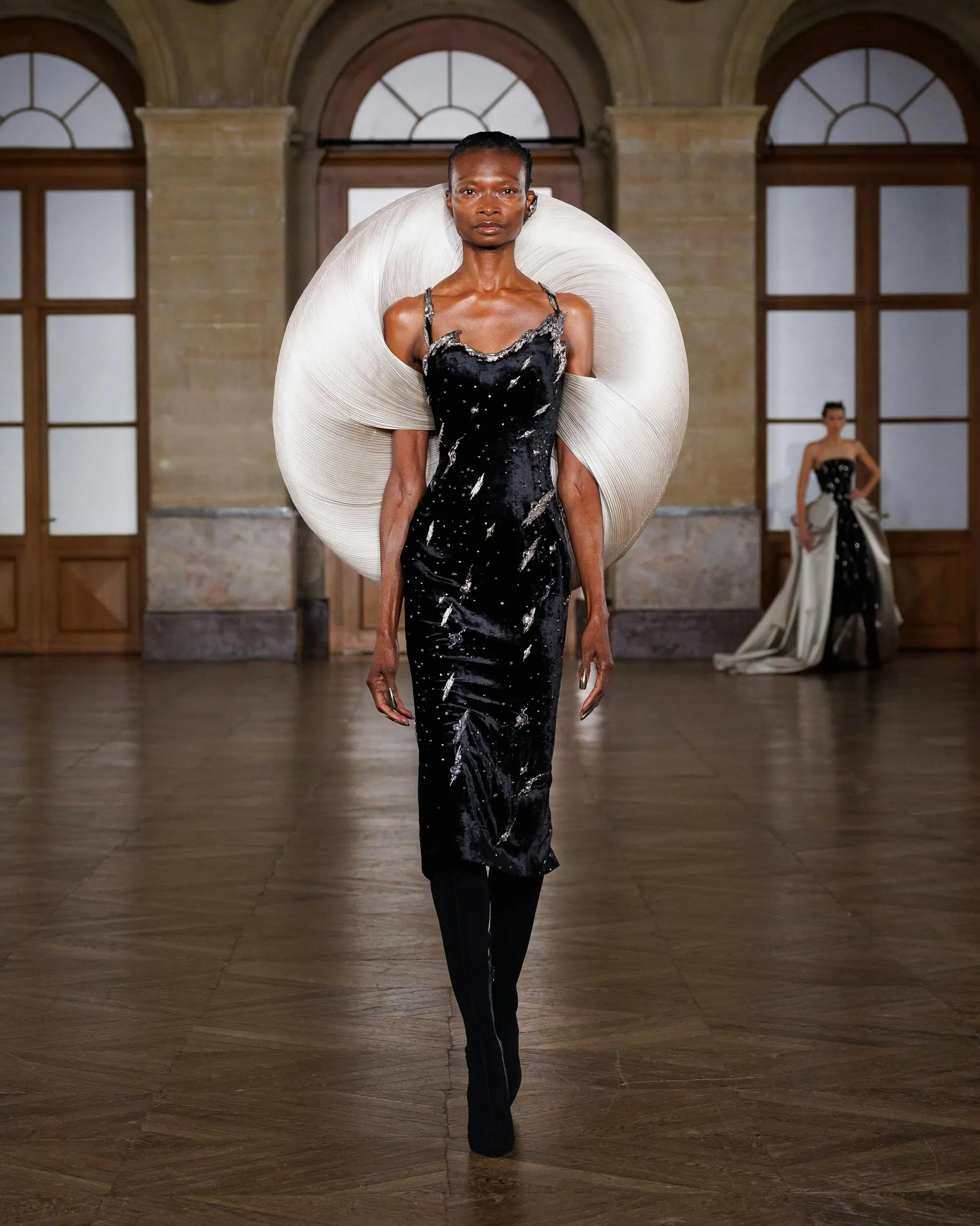 Le dernier mouvement faisait éclater la chronologie. Des mécanismes d’horlogerie déconstruits, des réseaux orbitaux, plus de 30 000 cristaux Preciosa qui vibraient comme des particules en suspension. Le temps n’était plus une ligne, mais une pulsation. Au centre de cette constellation, un corset monumental inspiré des statues de temple. Figé, mais traversé d’une énergie presque respirante. Une pièce qui semblait hésiter entre l’immobilité sacrée et le mouvement cosmique.
