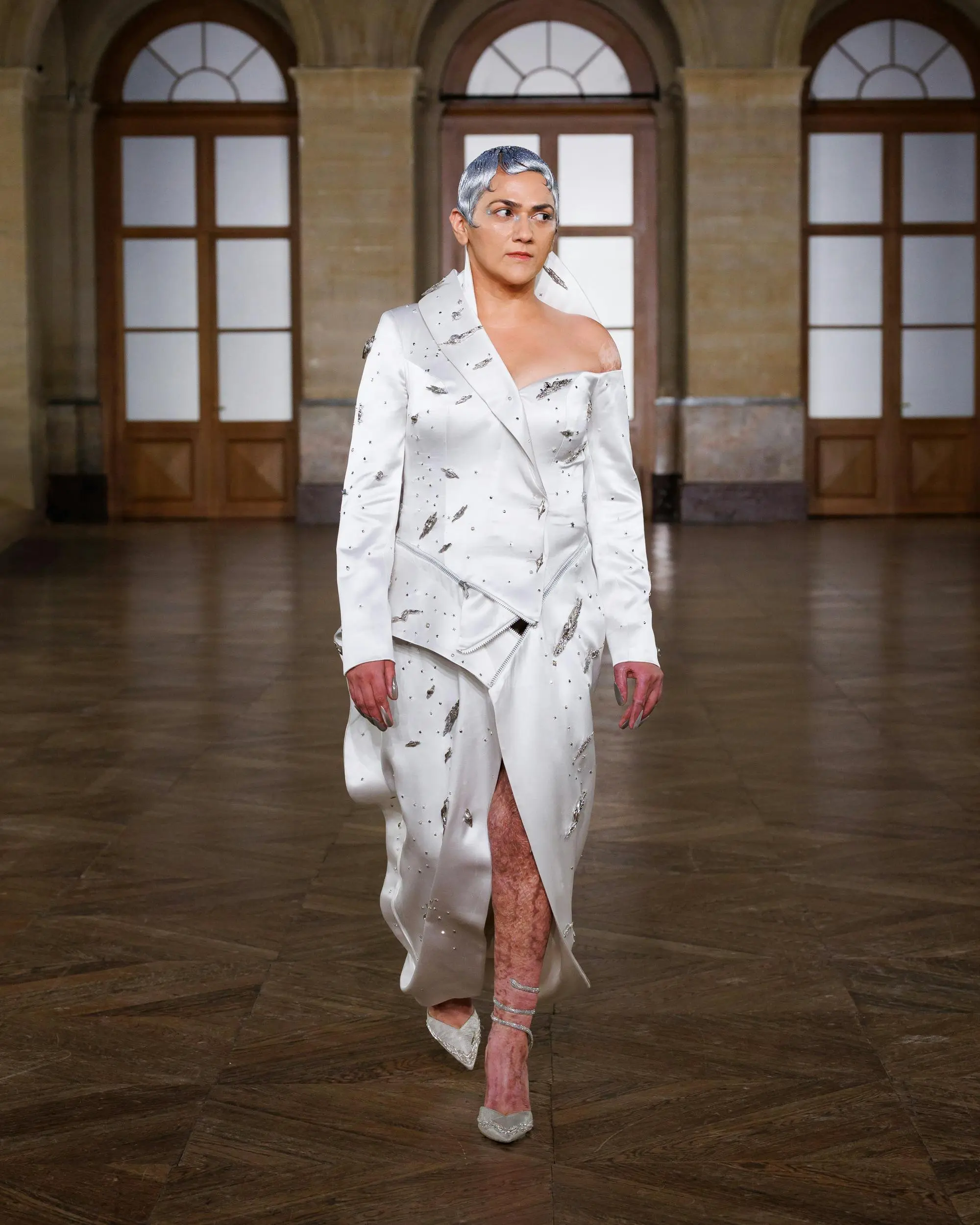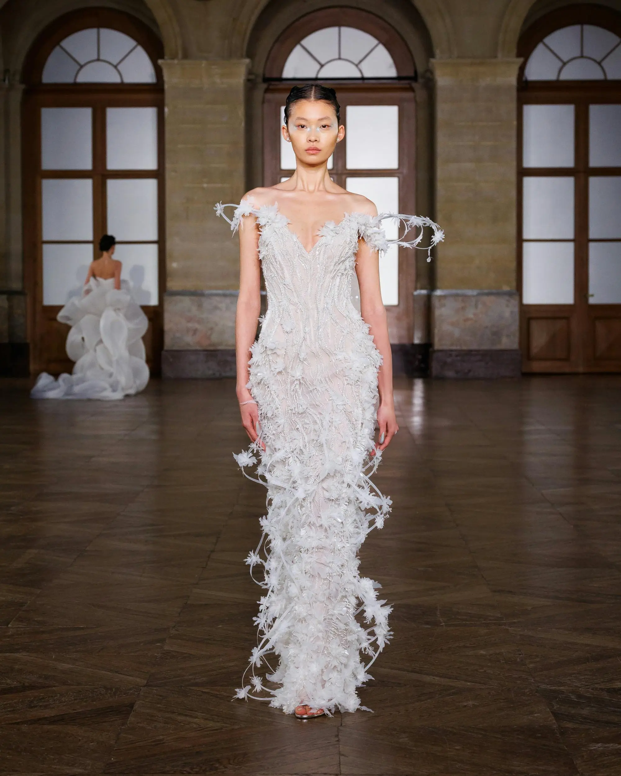 Puis la collection glissait vers une forêt rêvée. Une forêt où la vie et la mort cohabitent sans hiérarchie. Le mogra, jasmin sacré, apparaissait comme une structure organique dans des robes de mariée sculpturales. Ici, la mariée n’était plus une figure sociale, mais un symbole de renaissance. Une métamorphose intime. Plus loin, Gaurav Gupta remontait aux origines. Des surfaces extraterrestres, des résines hybrides, une robe cosmique composée de plus de 2 000 fragments irisés. On avait l’impression de voir une nébuleuse prendre forme, comme si la couture tentait de saisir l’instant où la matière décide d’exister.