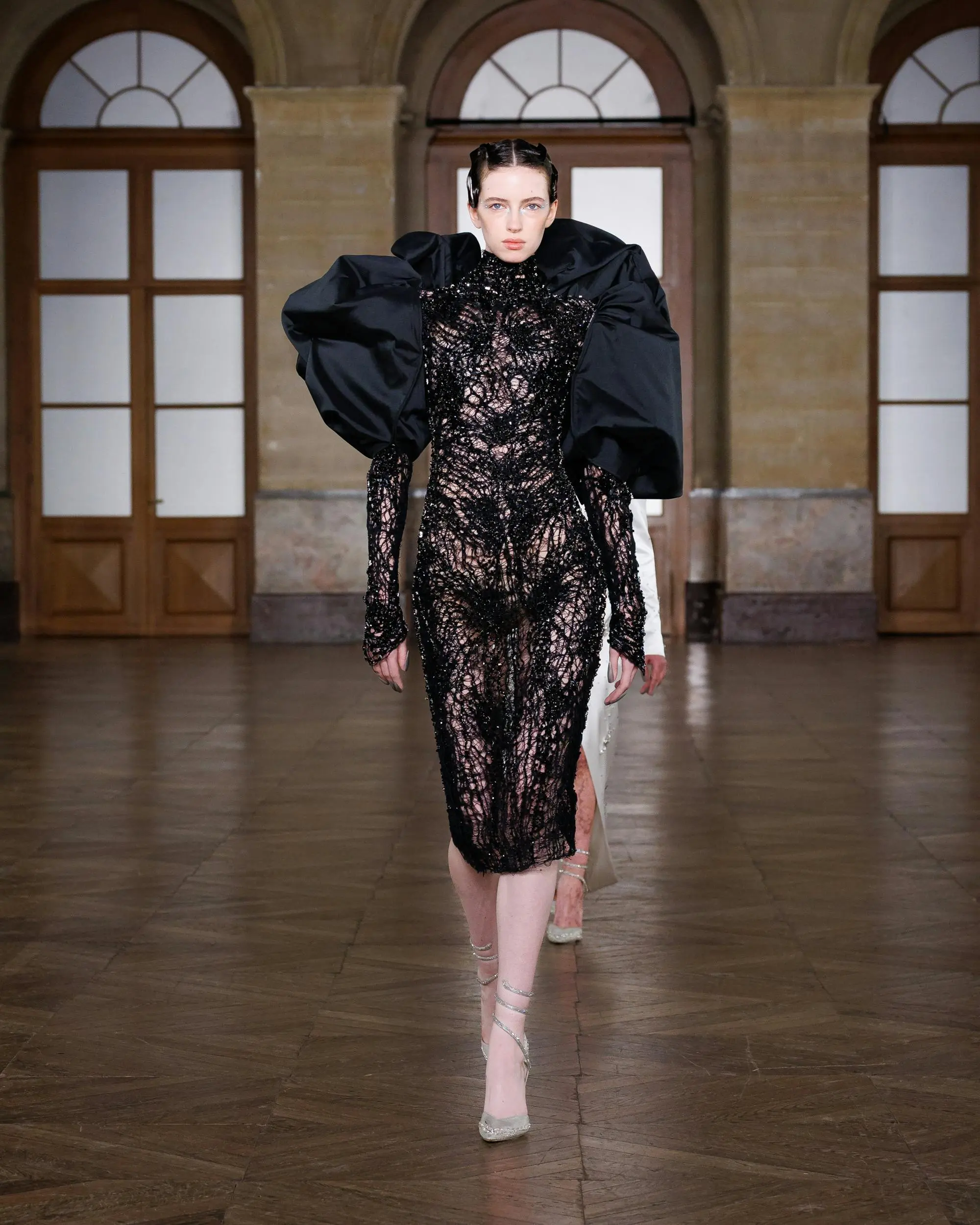 Tout est né d’une confusion. La presse avait décrit son compagnon comme une “femme”. Au lieu de rectifier, Gupta a choisi de s’interroger. Pourquoi ce besoin de nommer, de trancher, de ranger ? Pourquoi cette obsession de la frontière ? Sa réflexion l’a ramené à l’Advaita, cette philosophie indienne qui affirme que tout est un, que les oppositions ne sont que des illusions. Sur le podium, cette pensée prenait forme. Les silhouettes s’enroulaient comme des spirales vivantes. Certaines se dédoublaient. D’autres se reliaient. Deux mannequins avançaient enlacés par une dentelle nerveuse, comme deux consciences qui se reconnaissent. Des robes noires dessinaient des réseaux internes, cartographiant un système nerveux imaginaire. Le vêtement devenait une extension du corps, une peau supplémentaire, une pensée matérialisée.