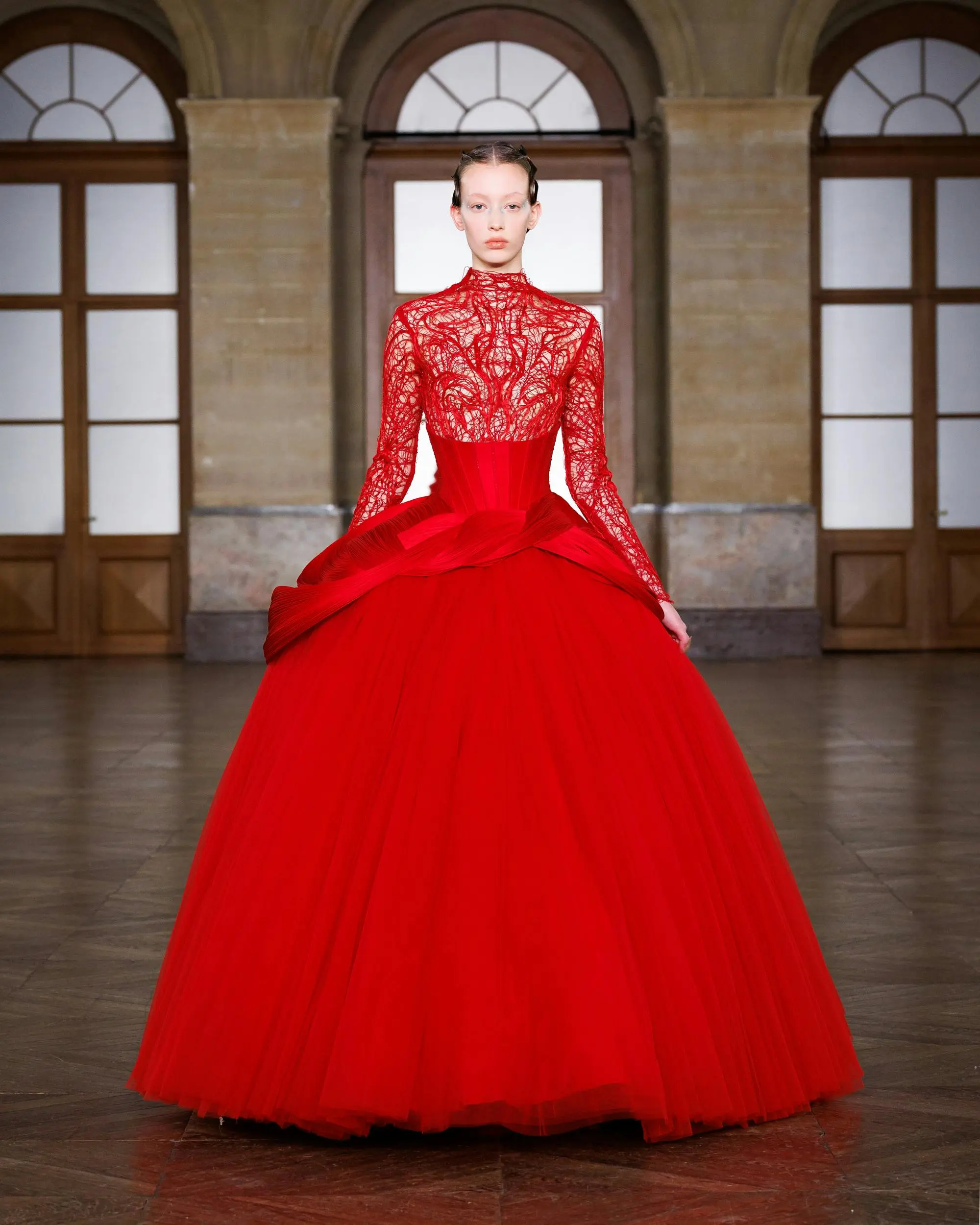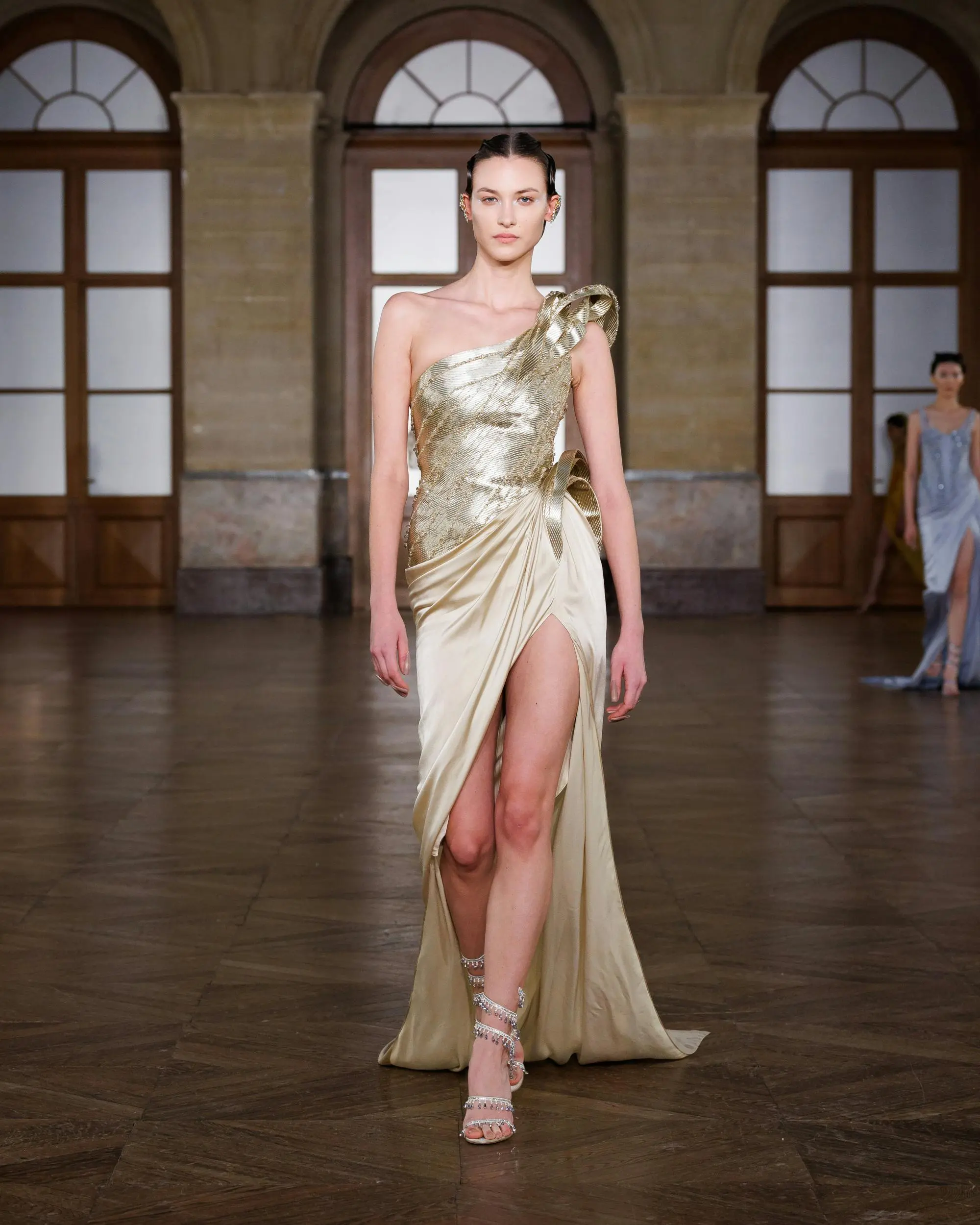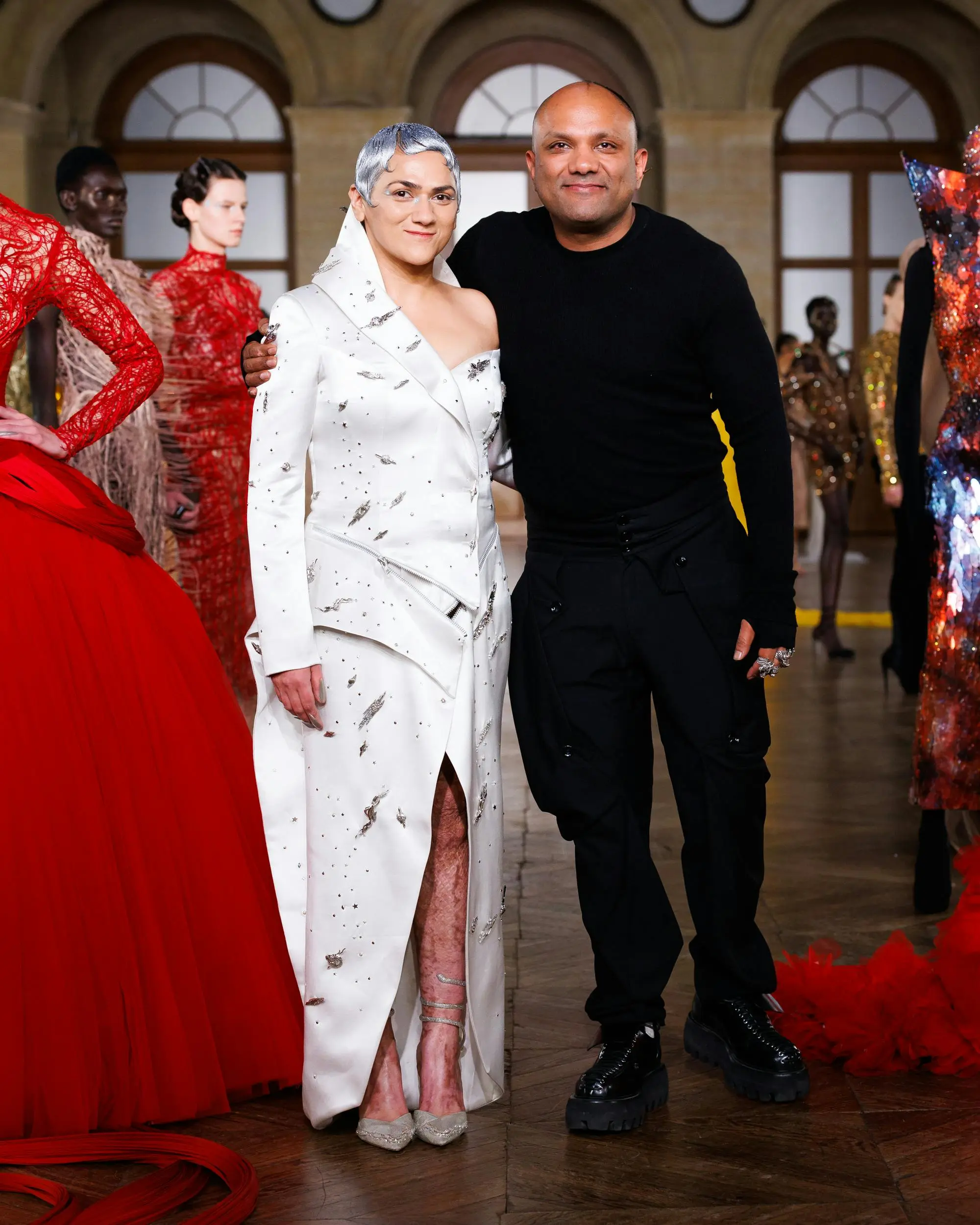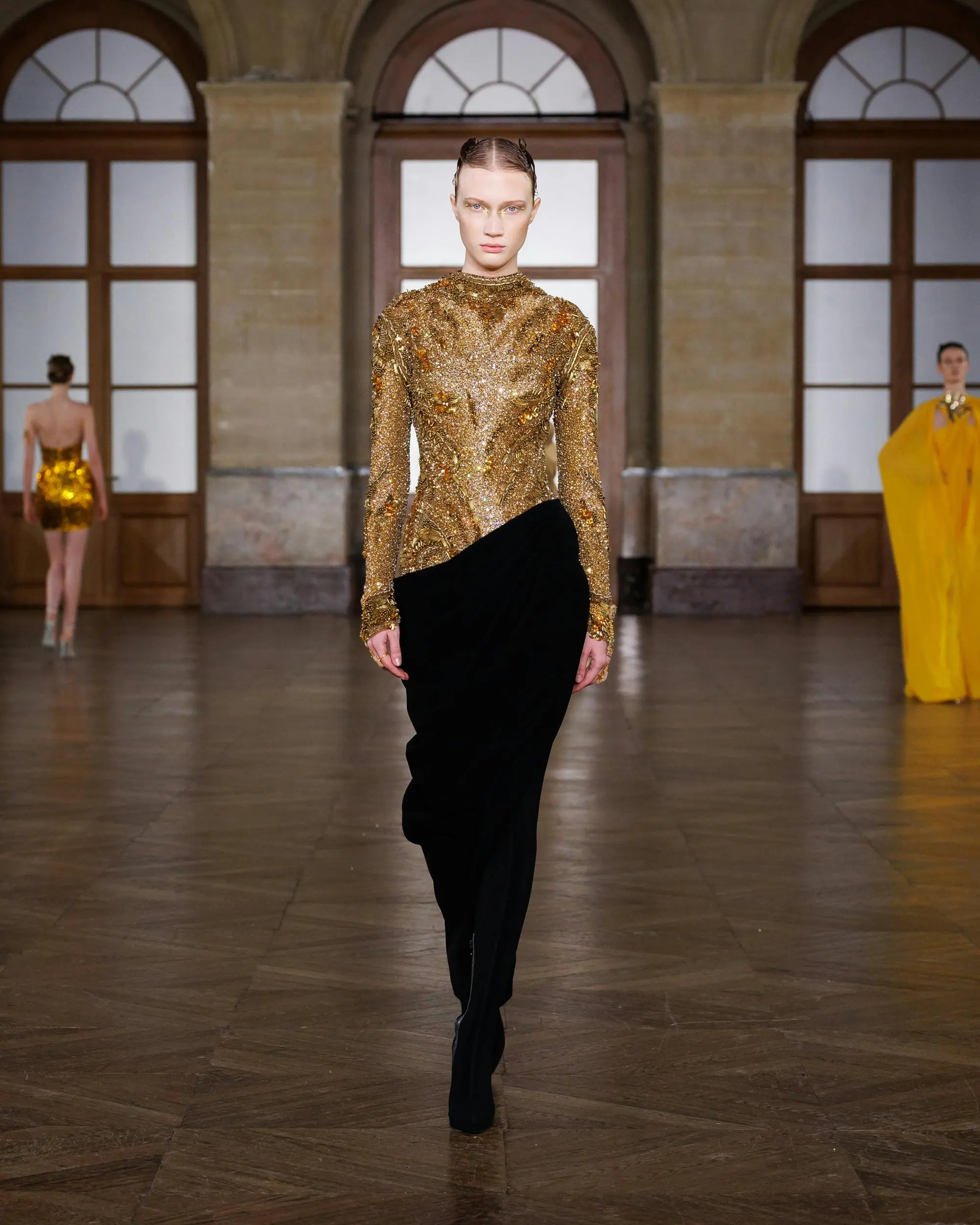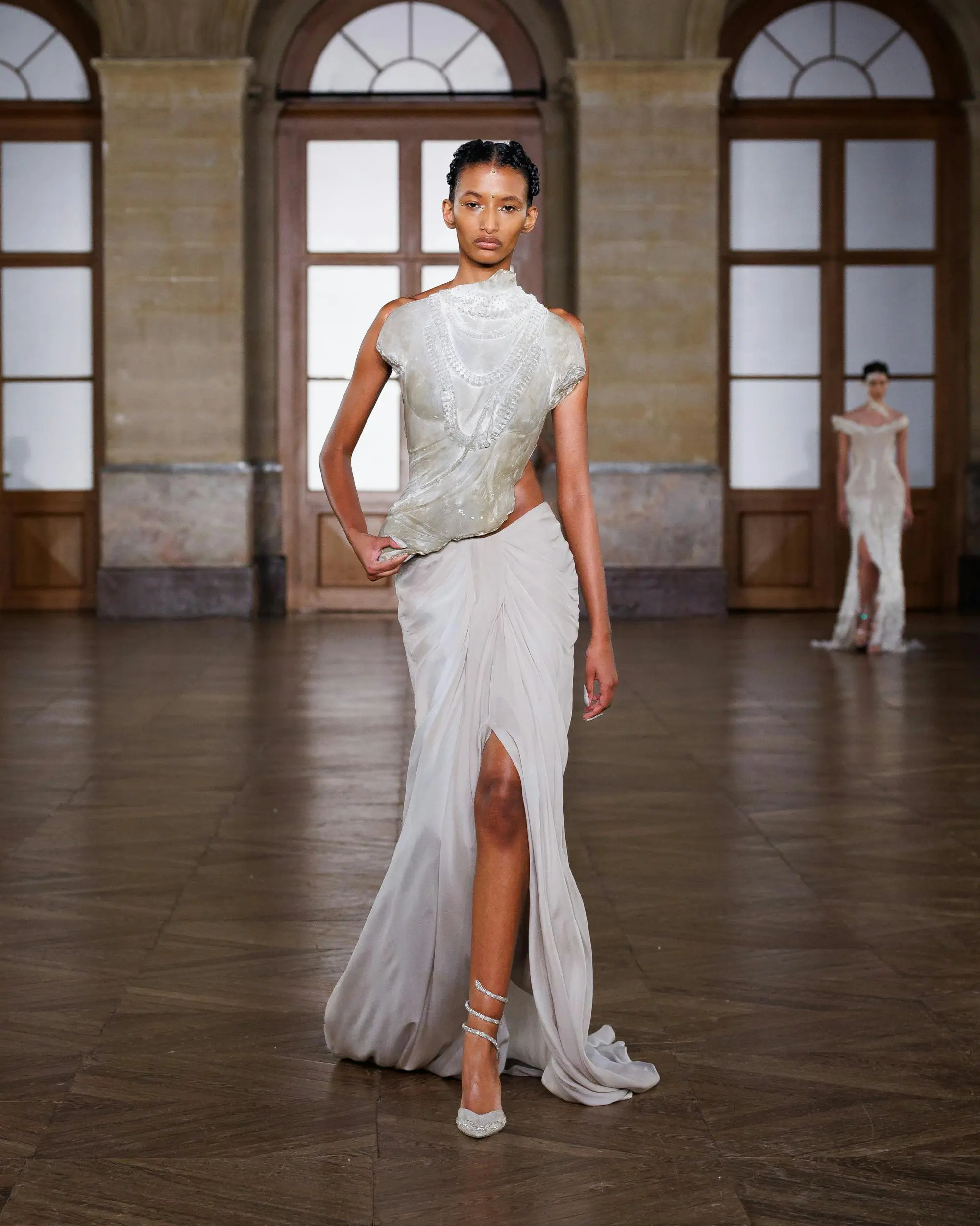 Avec „The Divine Androgyne“, Gaurav Gupta signe une collection qui refuse les certitudes. Une couture consciente, mouvante, qui ne fige rien. Chez lui, tout est en devenir. Tout glisse, tout se transforme, tout se relie. Sa beauté ne tient pas seulement à la virtuosité technique, mais à cette sensation rare que le vêtement peut devenir un état de conscience. Une manière de dire que la non‑dualité n’est pas un concept abstrait, mais une expérience à vivre. Et sur ce podium, elle respirait.