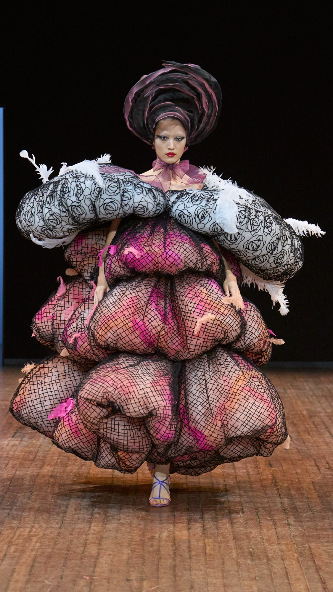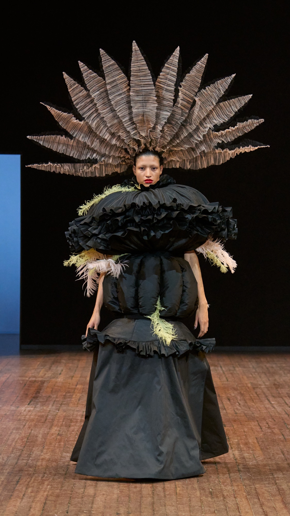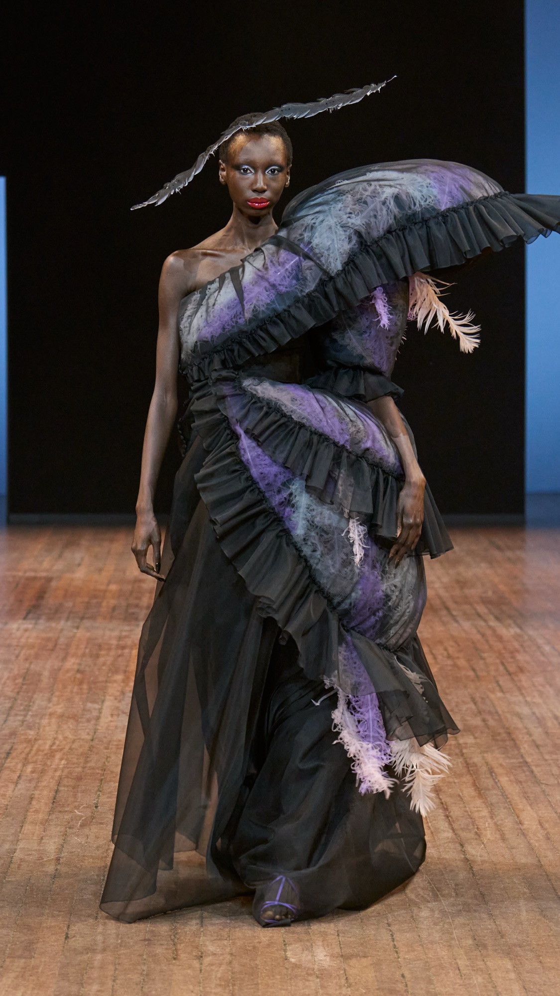 Angry Birds ne hurle pas, elle chuchote avec humour et conscience. Car ici, la plume est un fantasme cousu main. Les ornements d’apparat, réalisés par le chapelier Stephen Jones, ont été conçus à partir de tissu. Une prouesse artisanale pensée pour honorer les métiers de la plumasserie : Lemarié, Février, Légeron, Marcy, sans tomber dans l’extraction animale. C’est un hommage sans cruauté, une pirouette esthétique et technique qui fait dialoguer l’art et le vivant.