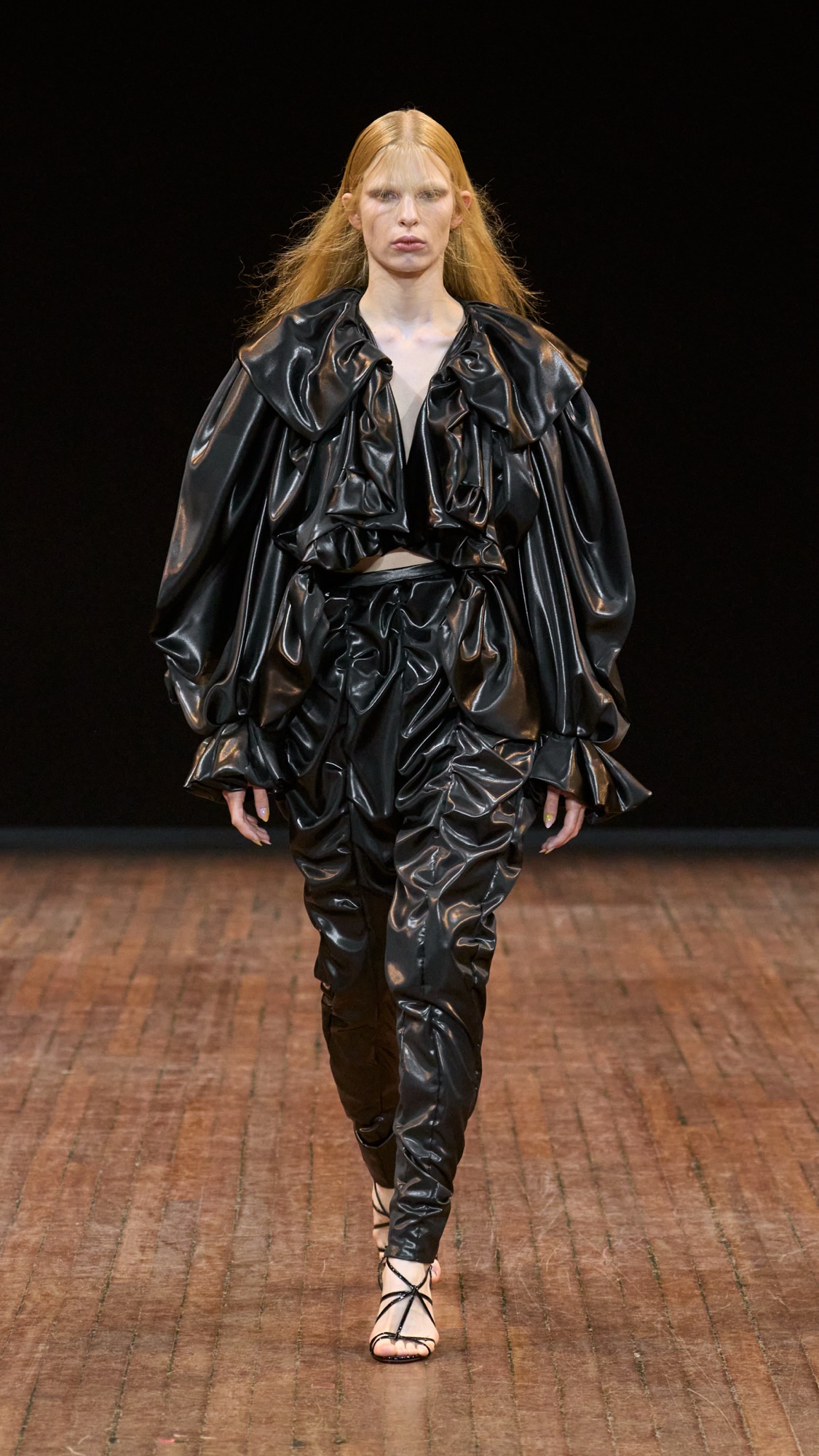 Chaque passage était un chapitre d’un conte de transformation. Les robes rondes évoquaient l’époque victorienne, parfois un cocon prêt à éclore, parfois une carapace sur le fil. Cette collection ne parle pas seulement de dualité, elle parle d’évolution. Elle souffle le vent d’un changement intime, le moment précis où l’on décide de se muer en autre chose, en autre soi.