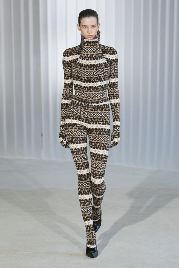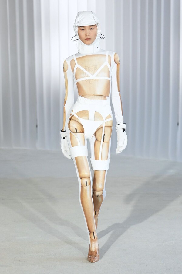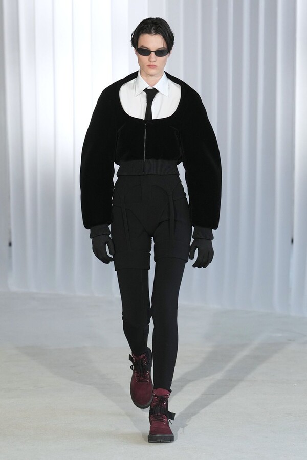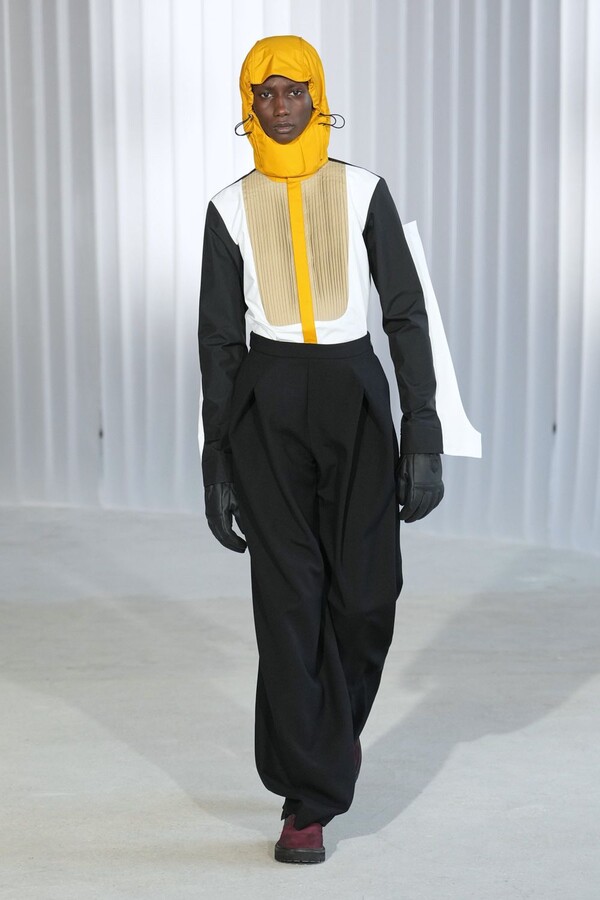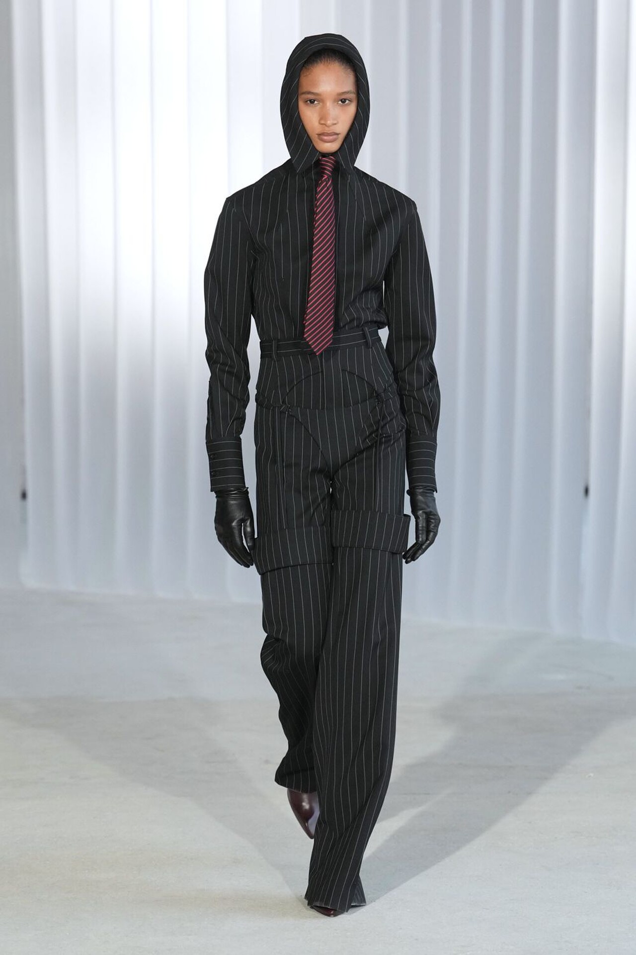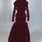 Duran Lantink adoucit son expérimentation pour la rapprocher du réel. Les bodys sculpturaux, les tailleurs affûtés, les robes aux proportions décalées se mêlent à des pièces plus sages, presque familières. Comme si la haute couture acceptait, l’espace d’un instant, de descendre dans la rue sans perdre son mystère. La collection devient un vestiaire hybride, où l’audace se glisse dans les plis du quotidien.