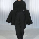 Chez le designer néerlandais, les vêtements ne se contentent pas d’habiller. Ils chuchotent, se dédoublent, se dérobent. Une robe devient sculpture, un tailleur se transforme en architecture mouvante. Les volumes se gonflent, se creusent, se replient, comme si chaque pièce possédait une vie intérieure. On croit voir une silhouette, puis une autre apparaît, selon l’angle, la lumière, le pas du mannequin. Cette mode-là n’est pas figée. Elle respire.