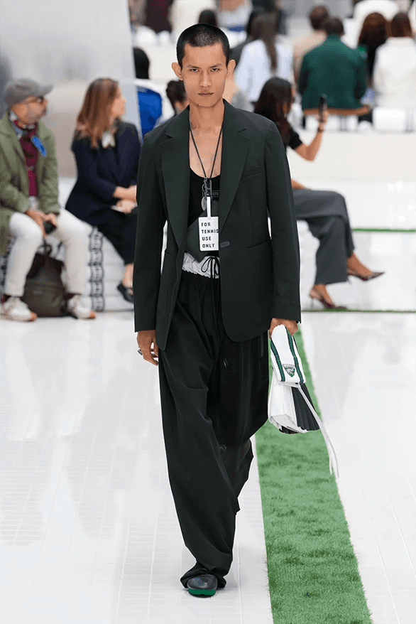 Le grand auditorium de l’école s’est transformé en arène feutrée, garnie de serviettes roulées et d’une tension palpable. Dans les gradins, Adrien Brody, Gavin Casalegno et une foule de fidèles venus assister à ce match de mode. Sur le podium, les silhouettes s’élancent comme des athlètes en pleine course : manteaux brillants jetés sur des ensembles structurés, polos oversize associés à des jupes-serviettes, et costumes fluides qui glissent comme des foulées bien maîtrisées.