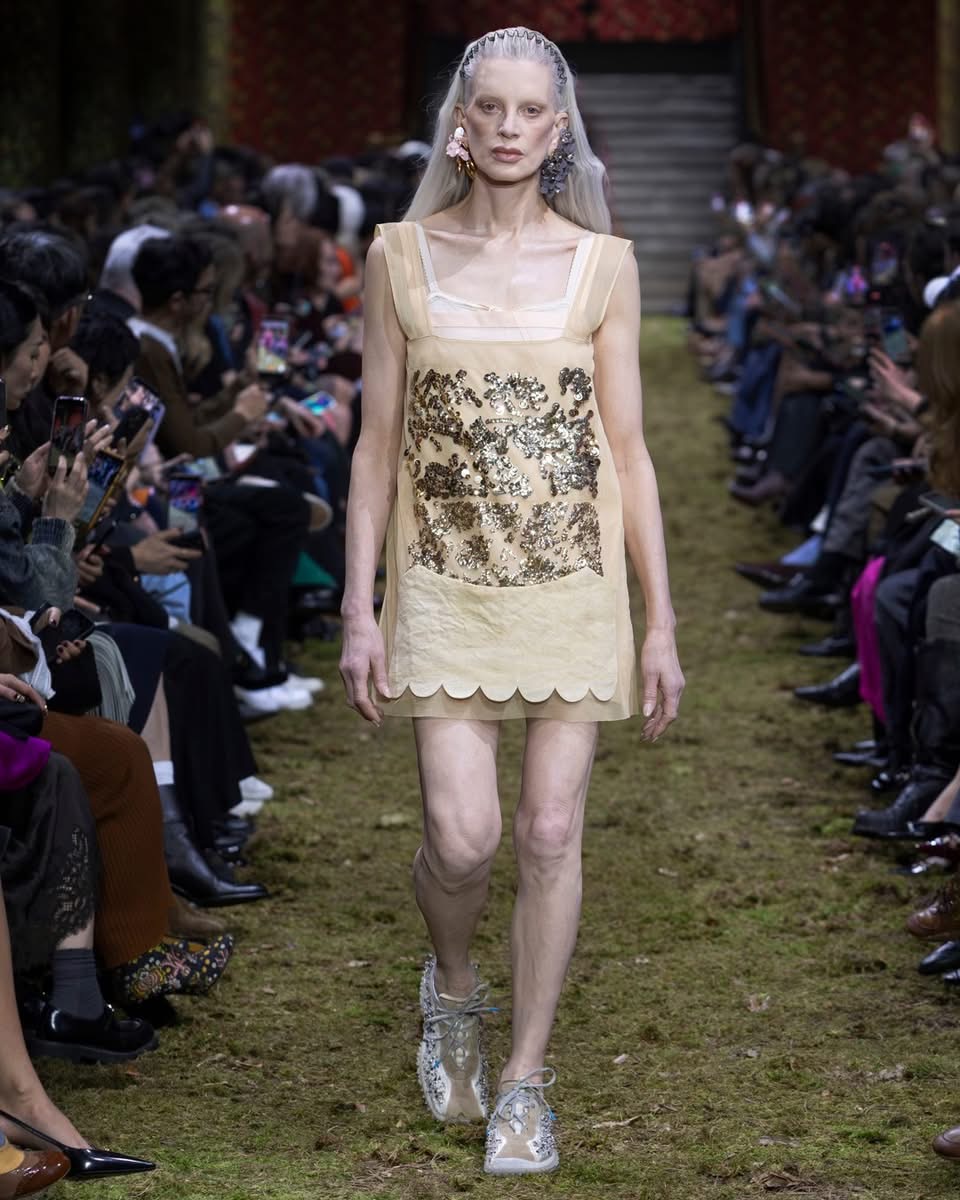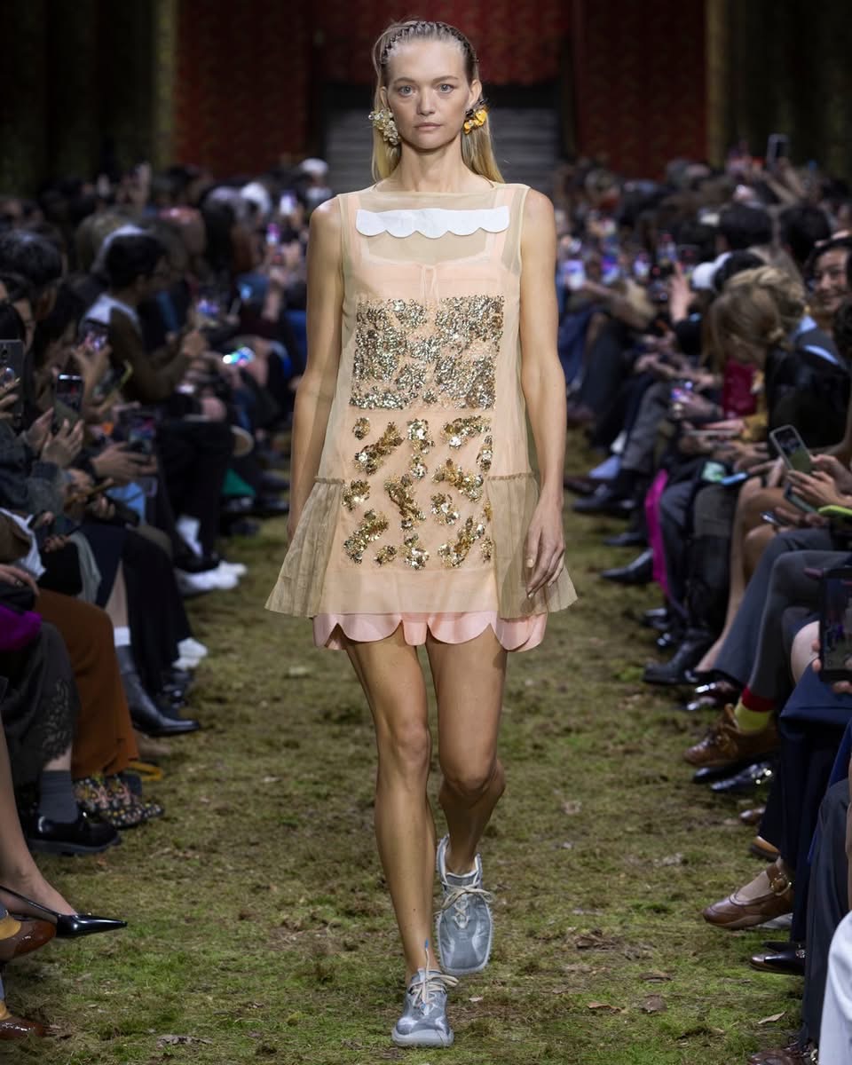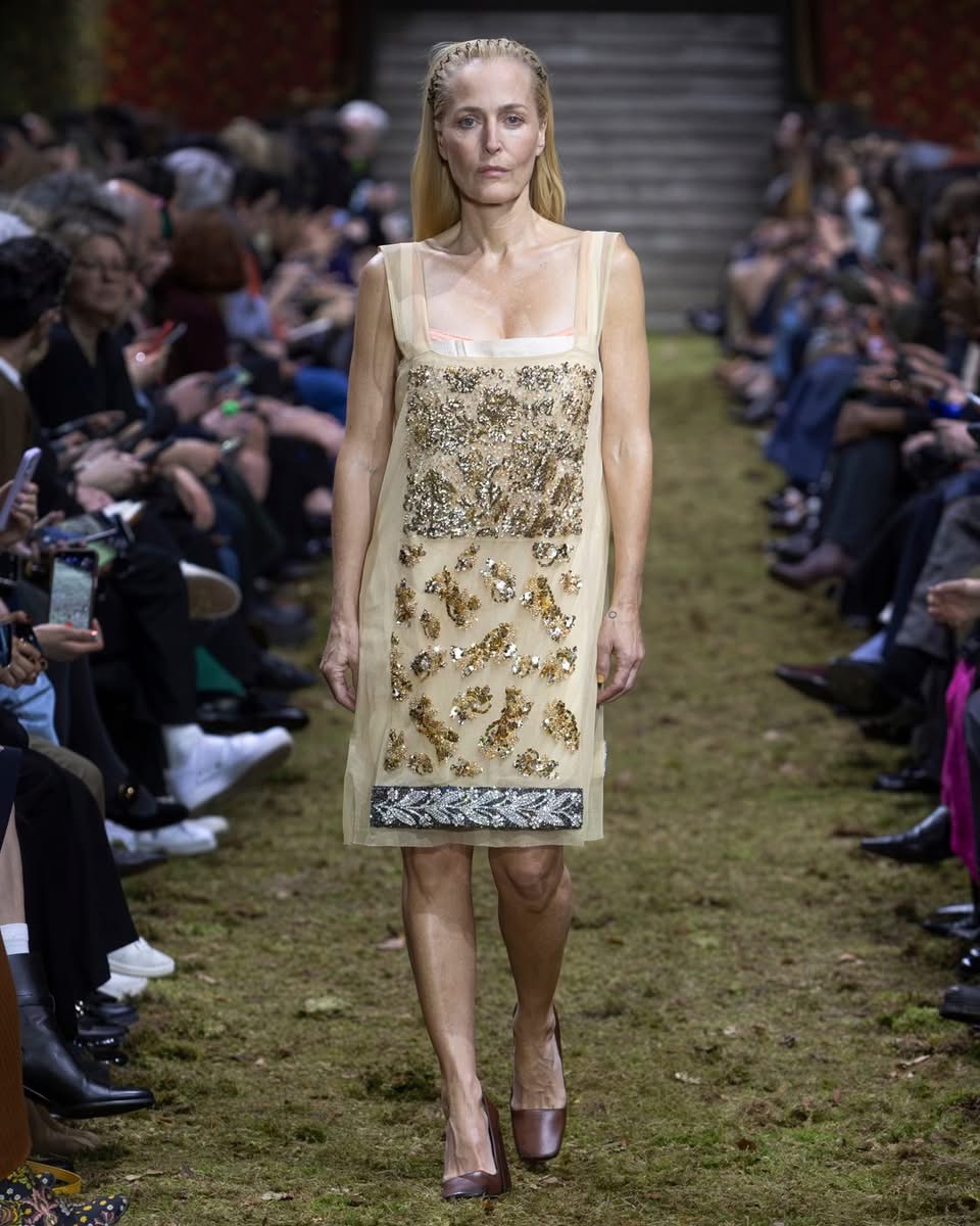 Chloë Sevigny, Gemma Ward, Gillian Anderson et Kristen McMenamy défilent comme des souvenirs vivants. Elles incarnent une époque où Miu Miu jouait avec l’uniforme, la jeunesse, l’irrévérence. Aujourd’hui, elles portent une mélancolie nouvelle, presque résignée.