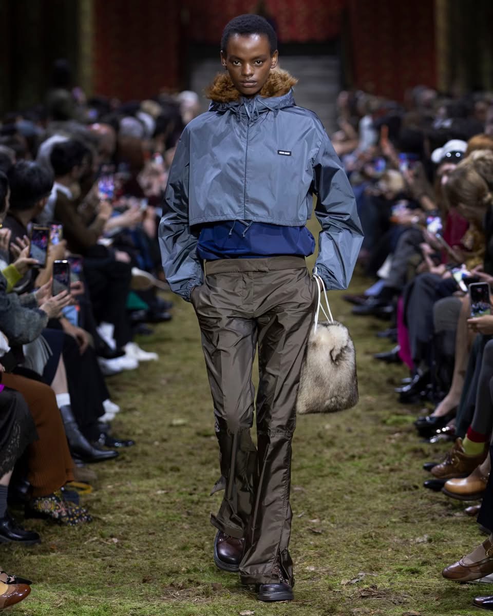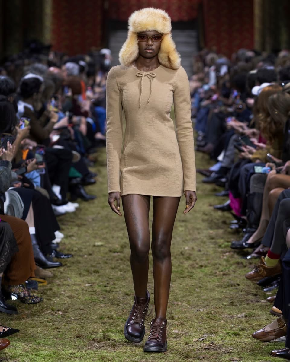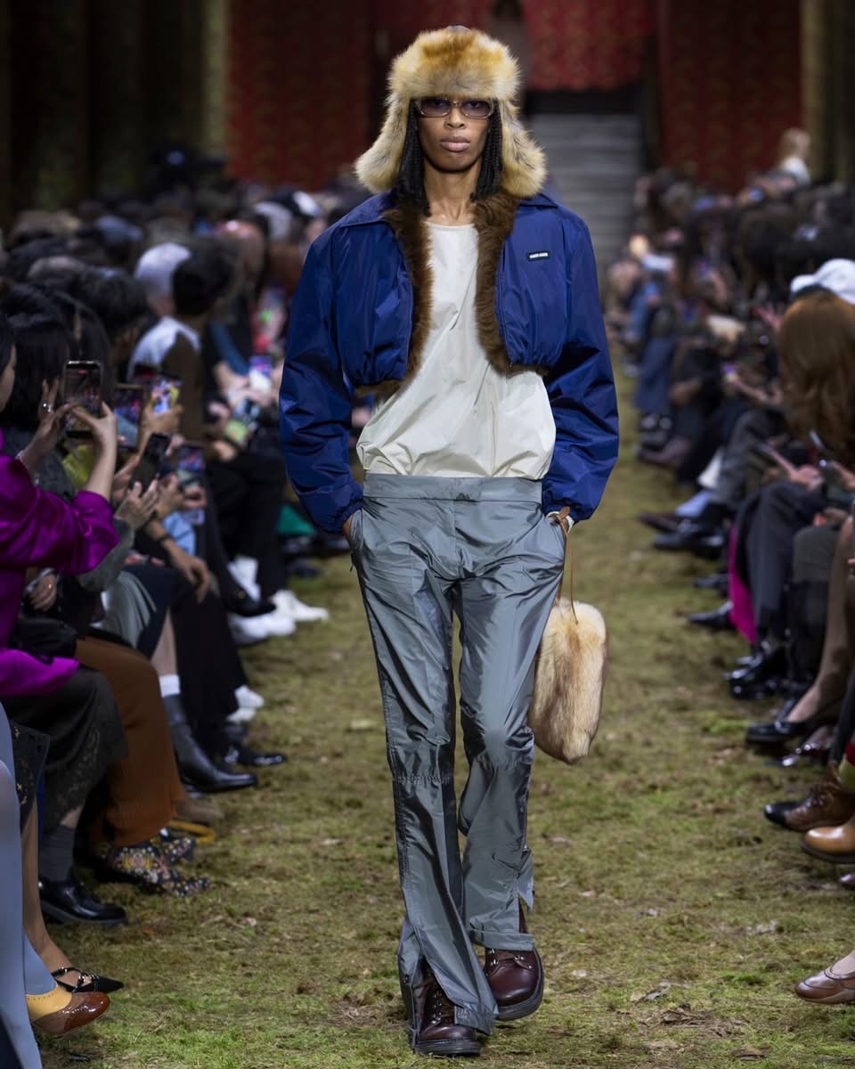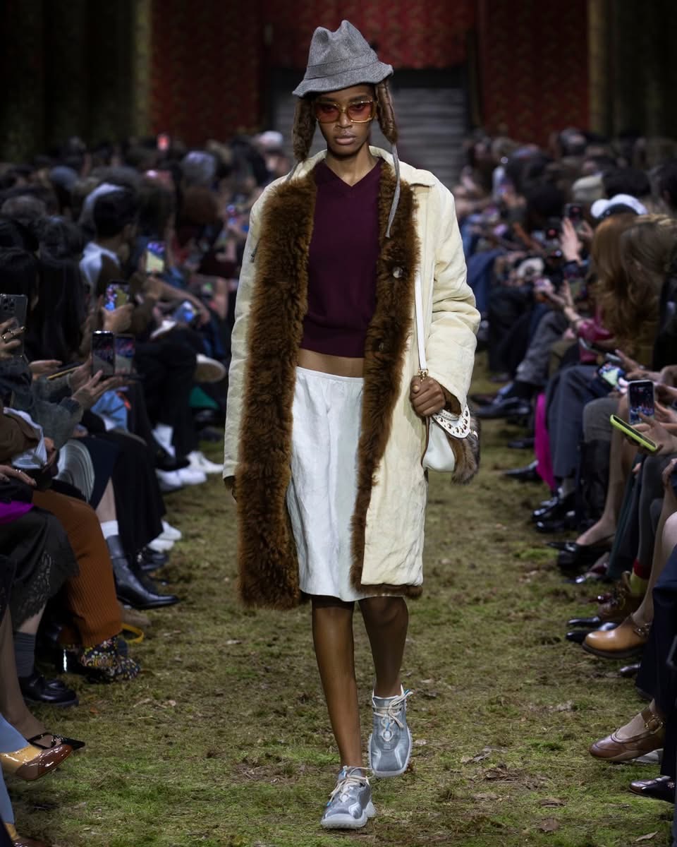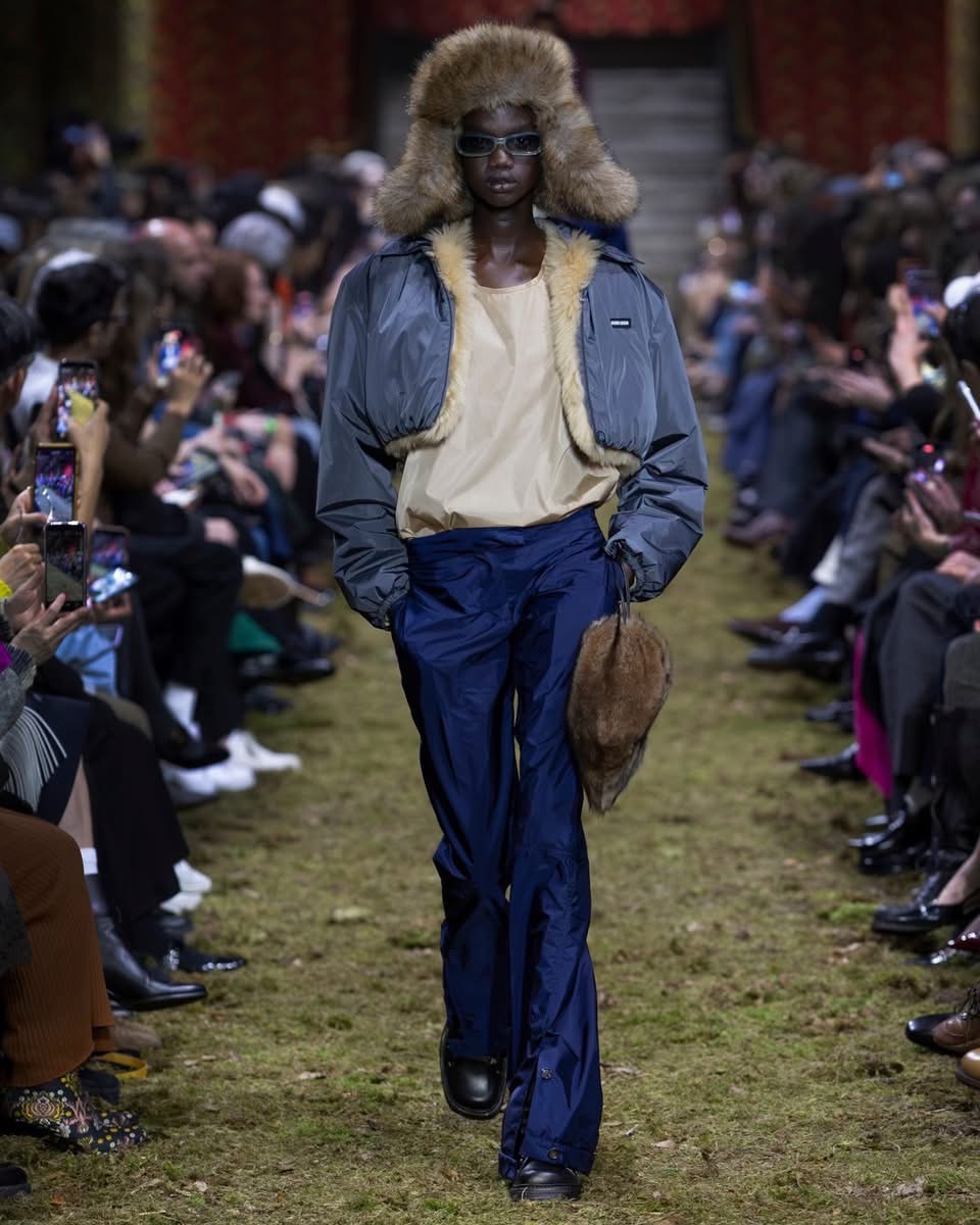 Les silhouettes semblent mal ajustées, les proportions volontairement bancales. Comme si la femme Miu Miu n’avait plus le temps, plus l’envie, plus l’énergie de composer. Elle s’habille pour sortir, pour affronter, pour continuer. La mode devient un acte de survie.