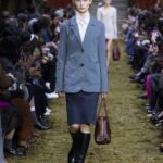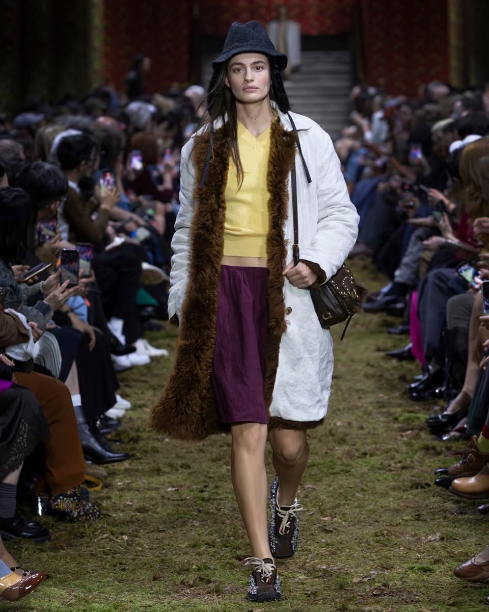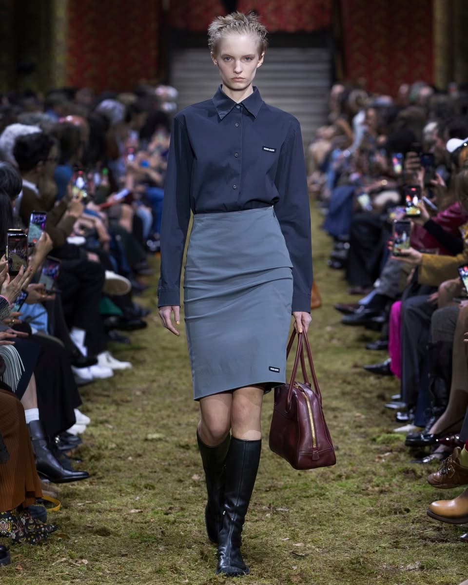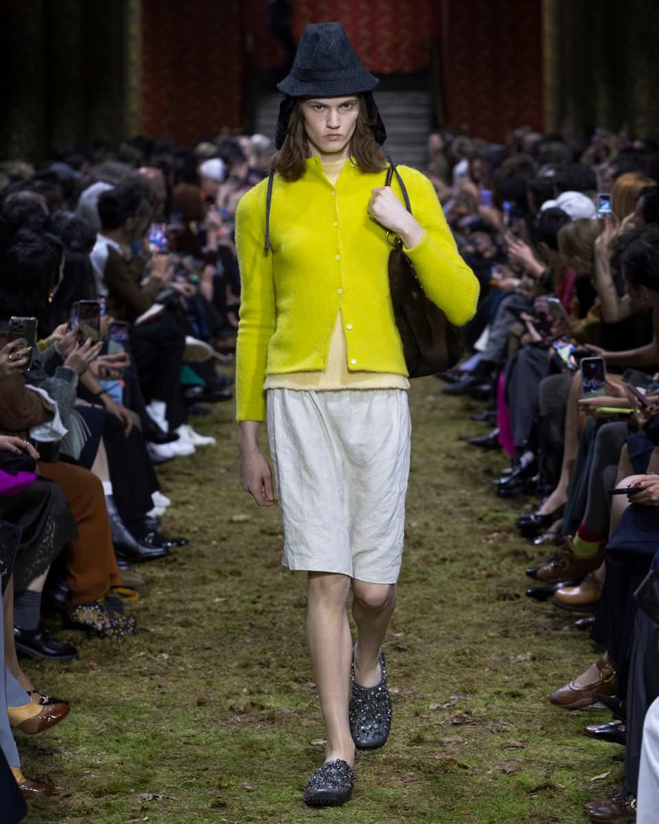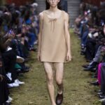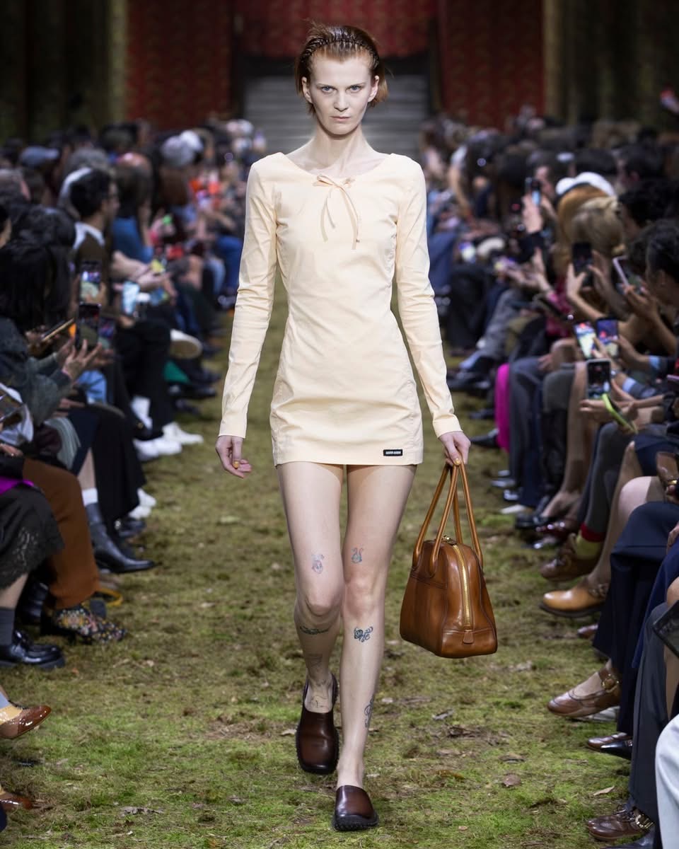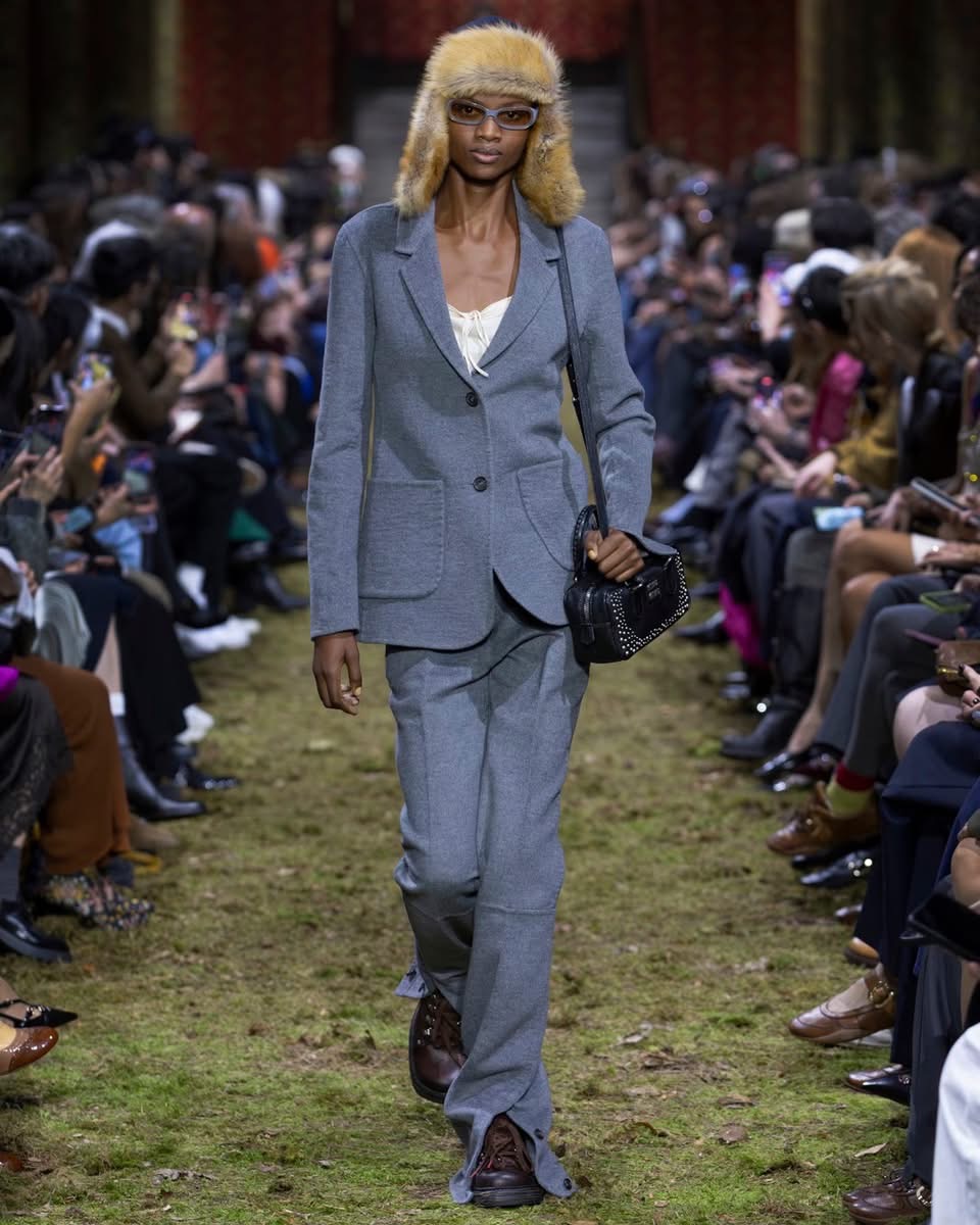 Les silhouettes semblent mal ajustées, les proportions volontairement bancales. Comme si la femme Miu Miu n’avait plus le temps, plus l’envie, plus l’énergie de composer. Elle s’habille pour sortir, pour affronter, pour continuer. La mode devient un acte de survie.