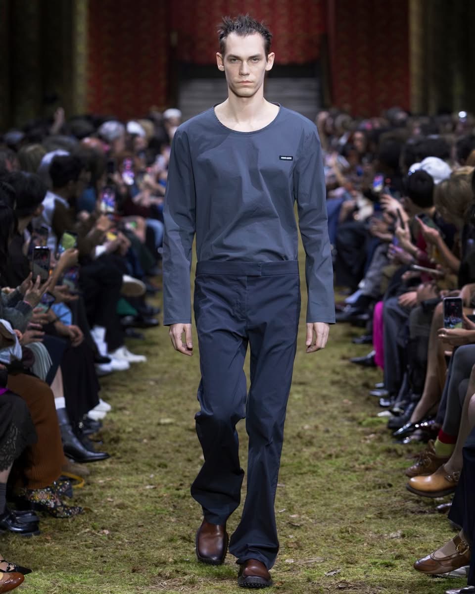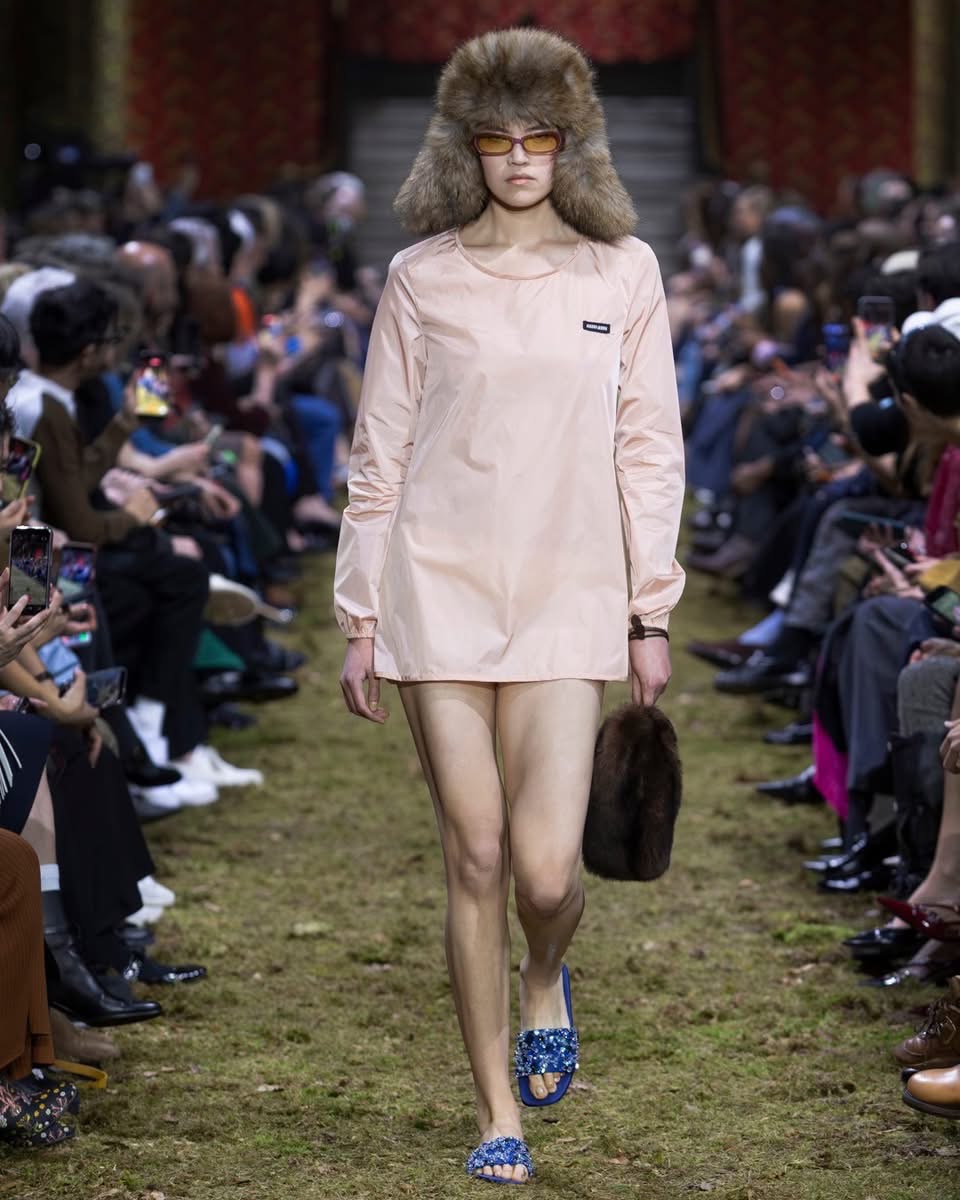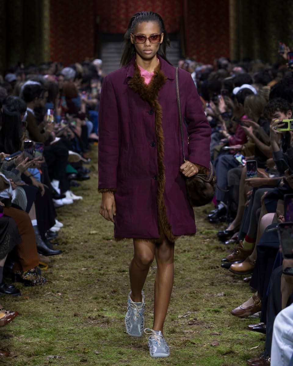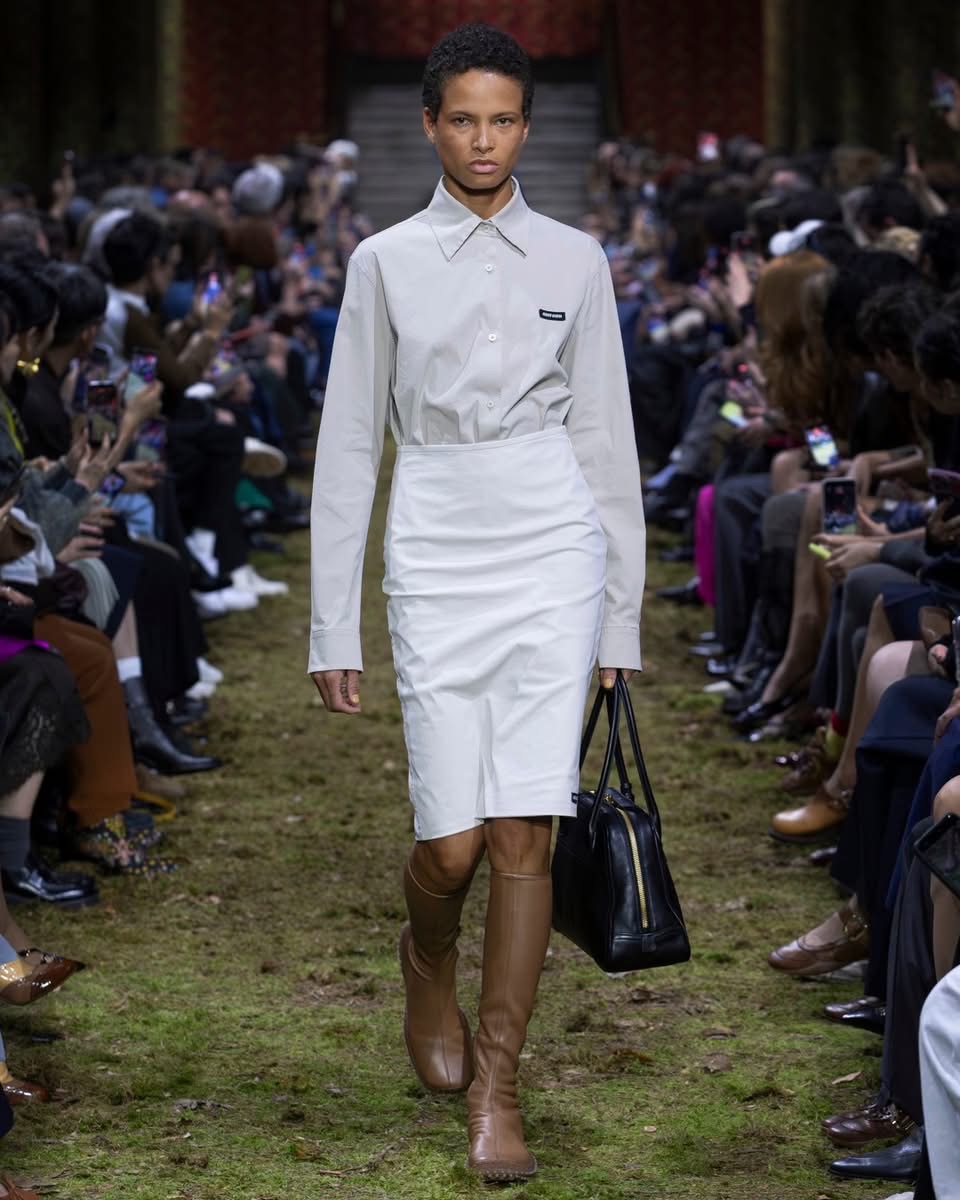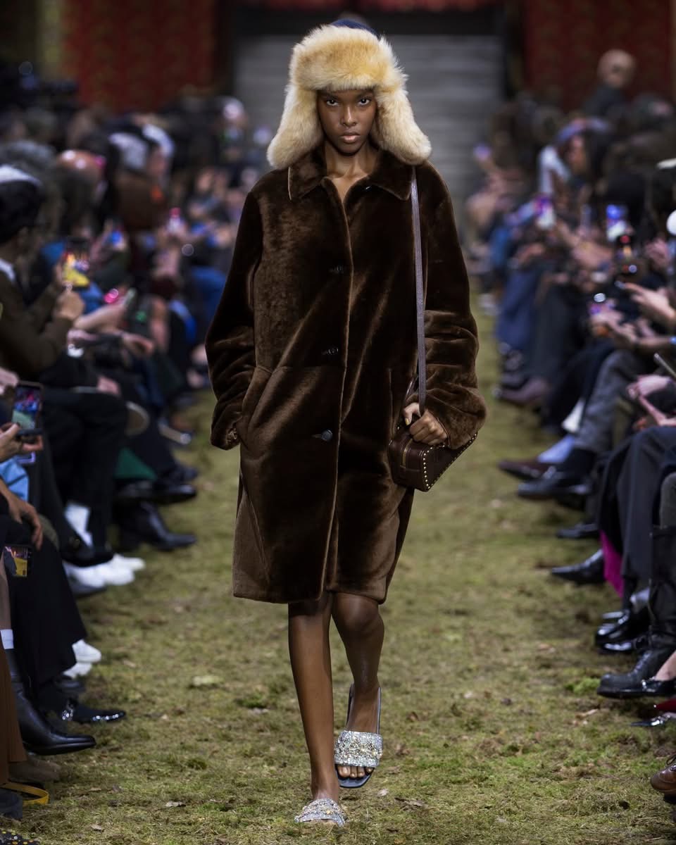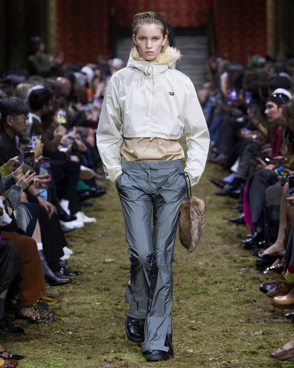 Les silhouettes semblent mal ajustées, les proportions volontairement bancales. Comme si la femme Miu Miu n’avait plus le temps, plus l’envie, plus l’énergie de composer. Elle s’habille pour sortir, pour affronter, pour continuer. La mode devient un acte de survie.