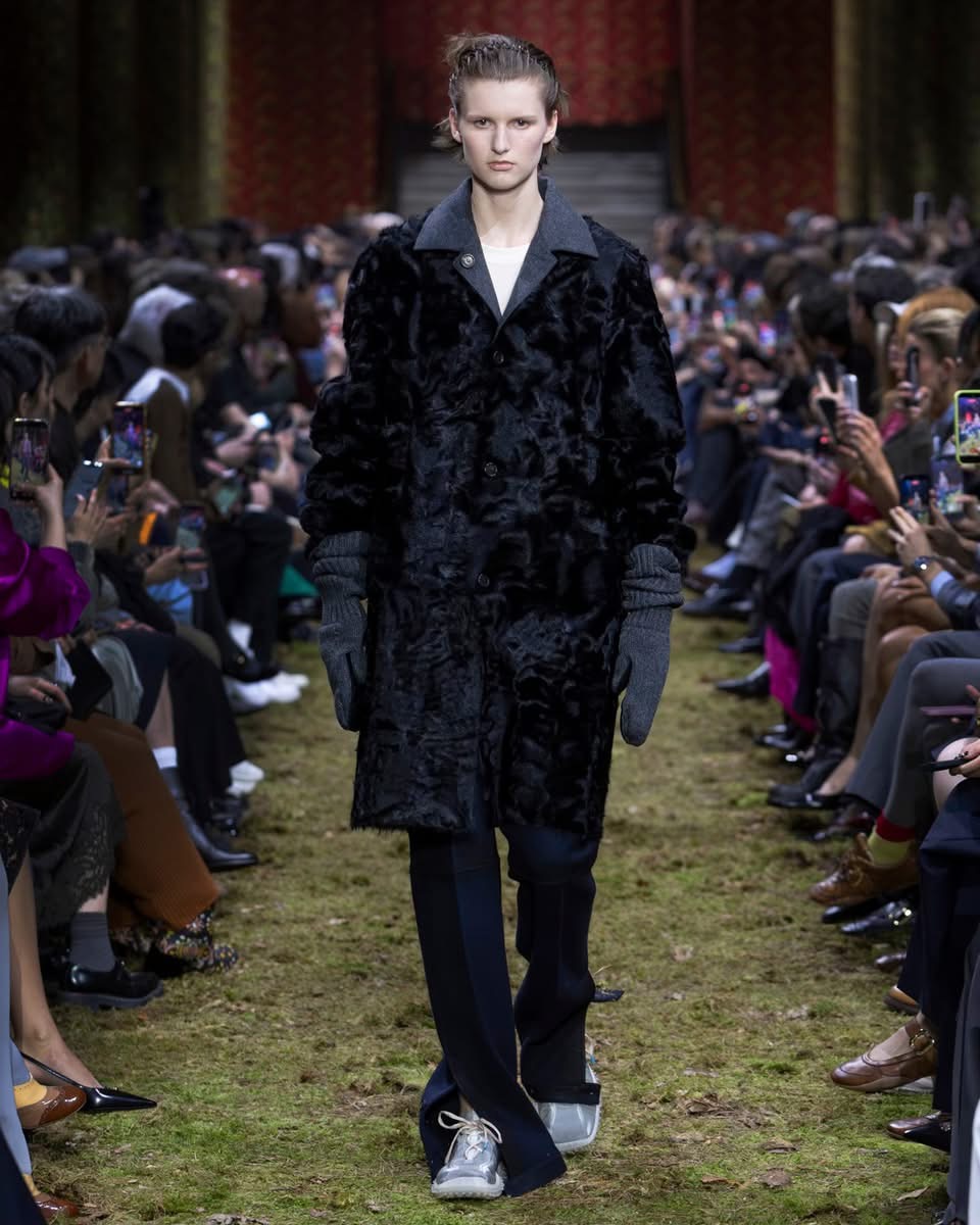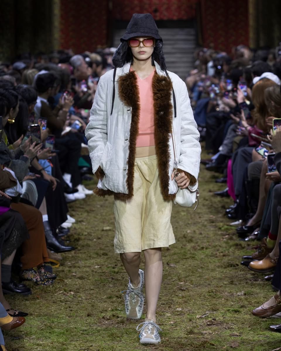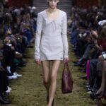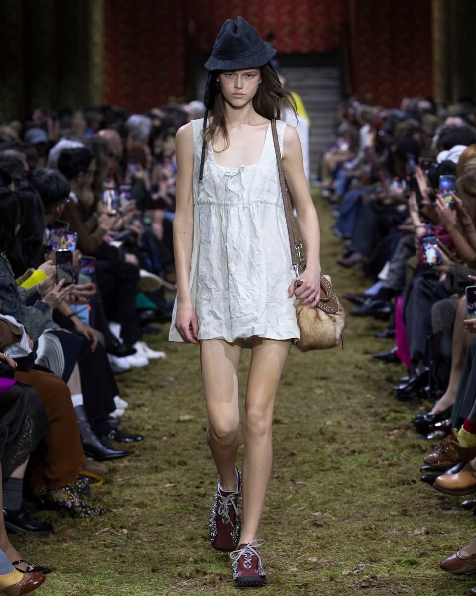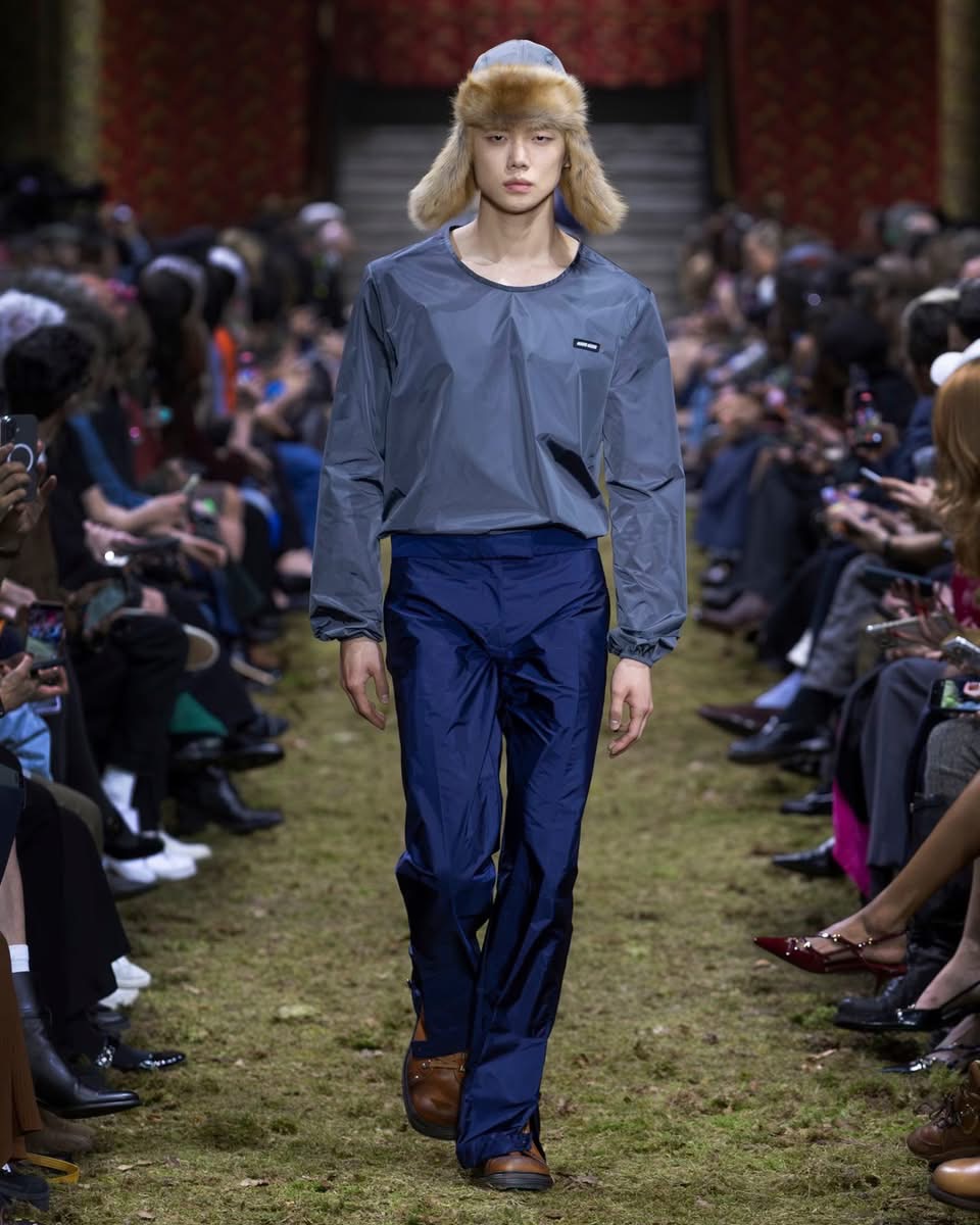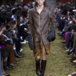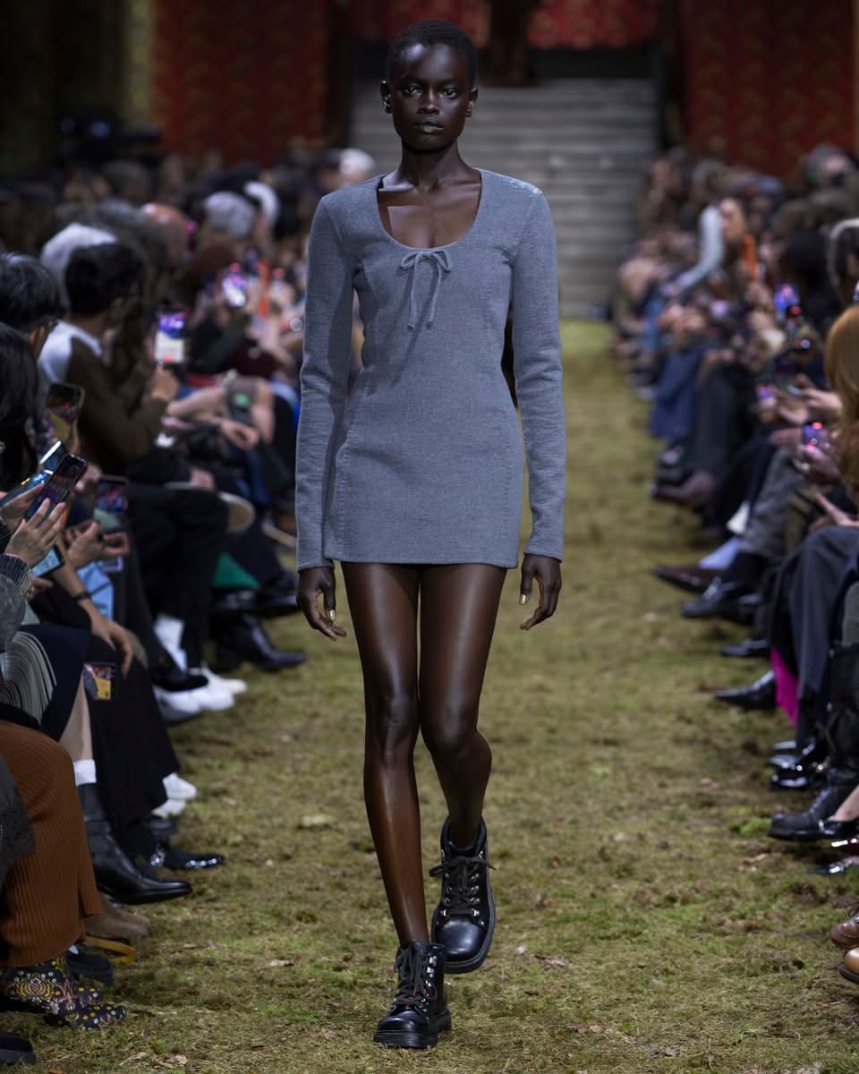 Les silhouettes semblent mal ajustées, les proportions volontairement bancales. Comme si la femme Miu Miu n’avait plus le temps, plus l’envie, plus l’énergie de composer. Elle s’habille pour sortir, pour affronter, pour continuer. La mode devient un acte de survie.