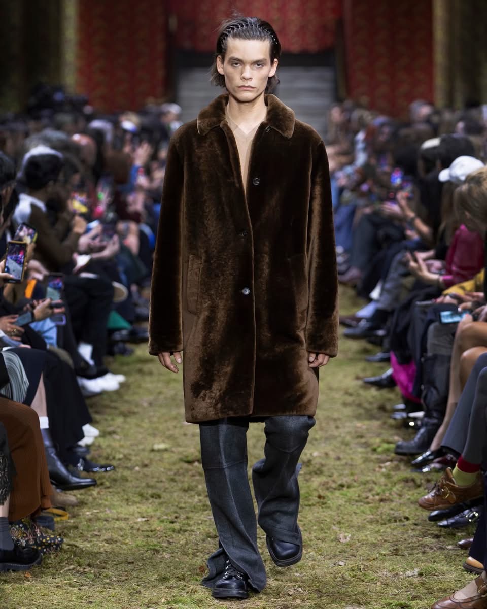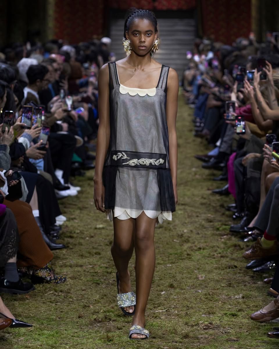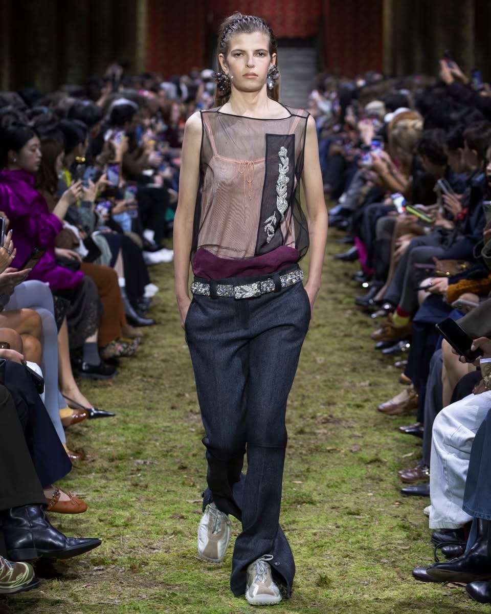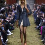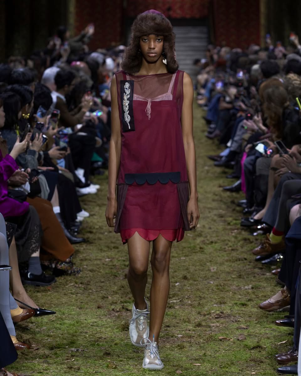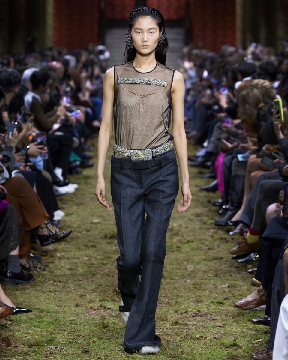 Les silhouettes semblent mal ajustées, les proportions volontairement bancales. Comme si la femme Miu Miu n’avait plus le temps, plus l’envie, plus l’énergie de composer. Elle s’habille pour sortir, pour affronter, pour continuer. La mode devient un acte de survie.