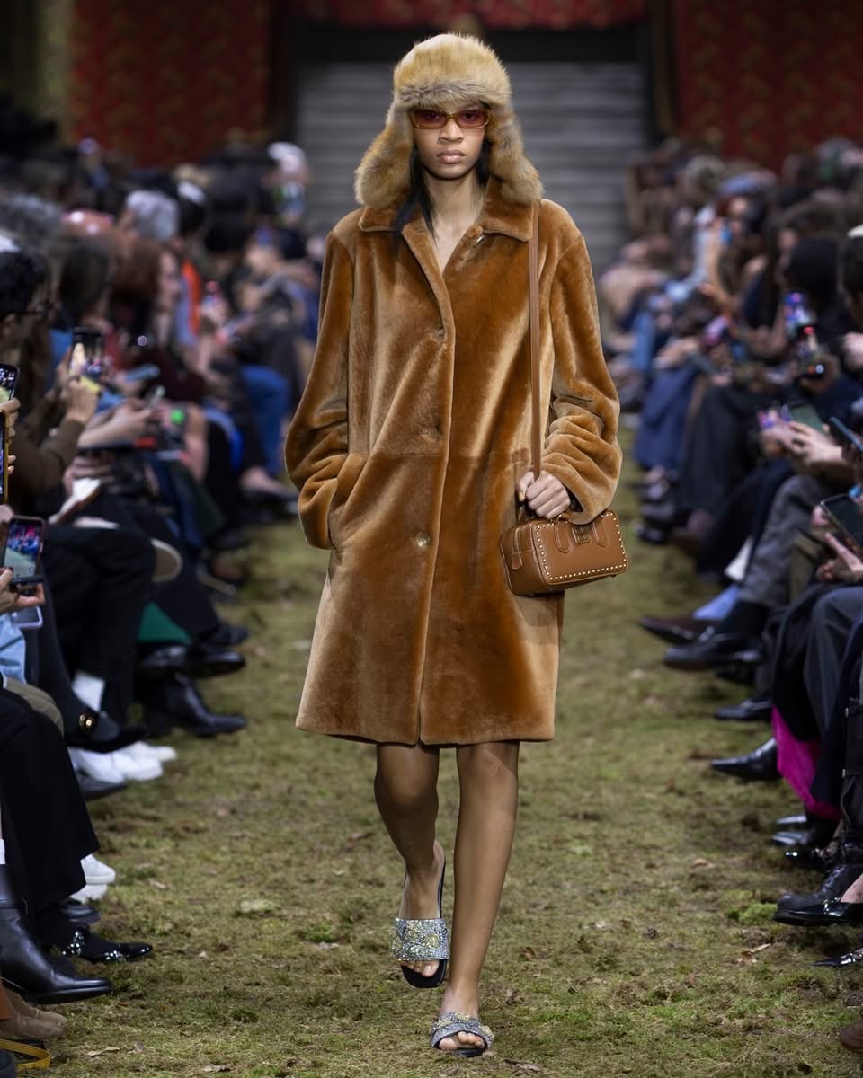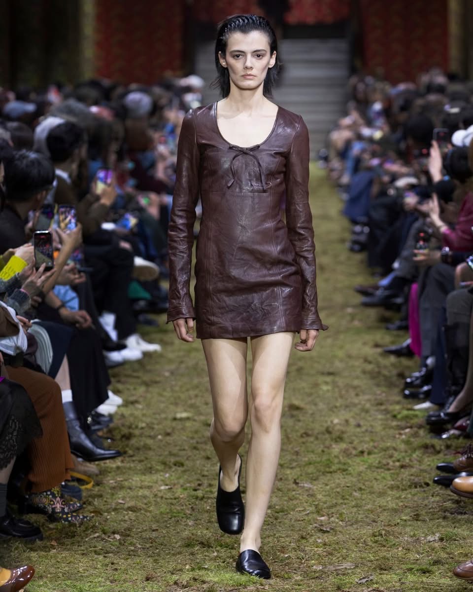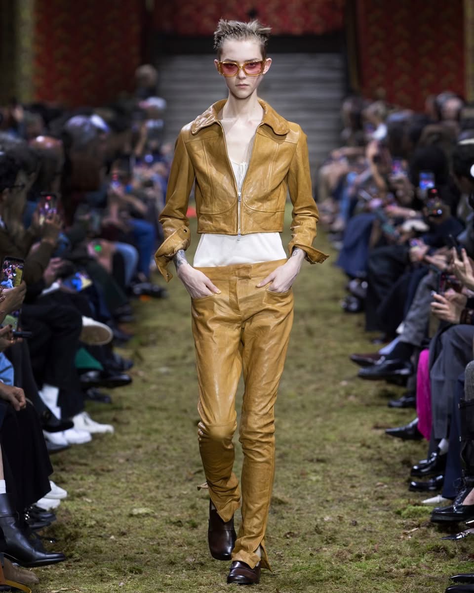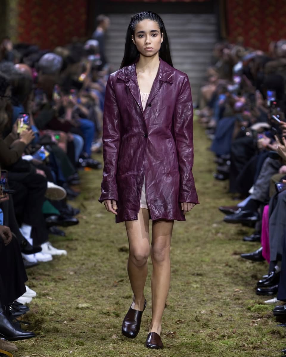 Les vêtements semblent choisis dans la précipitation. Tailleurs en cuir froissé, robes babydoll poudrées, baskets rétro, un unique colbacco en fourrure strassée… le stylisme est réduit à l’essentiel. Les couleurs, elles, oscillent entre bordeaux, beige, moutarde, rose pêche et gris infinis. Rien de joyeux. Rien de frivole.