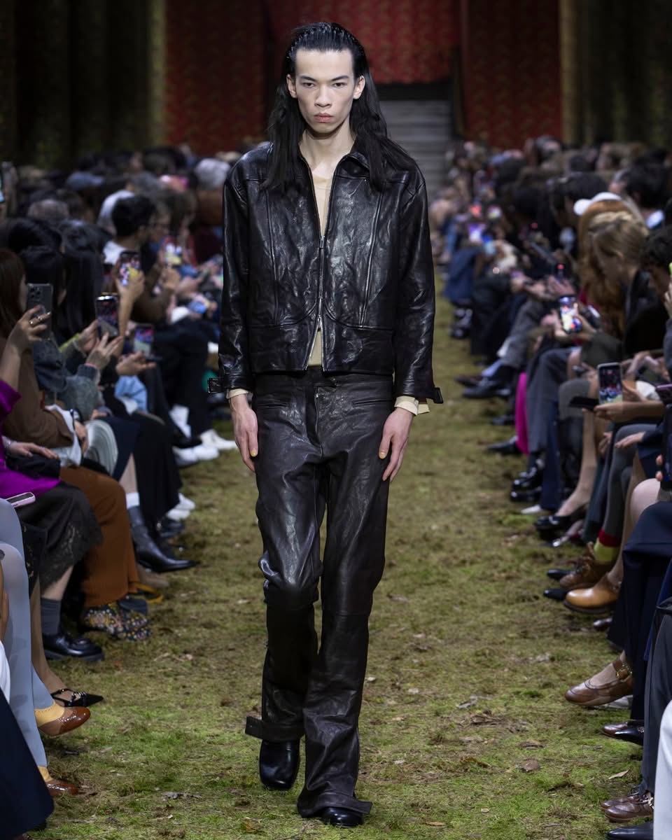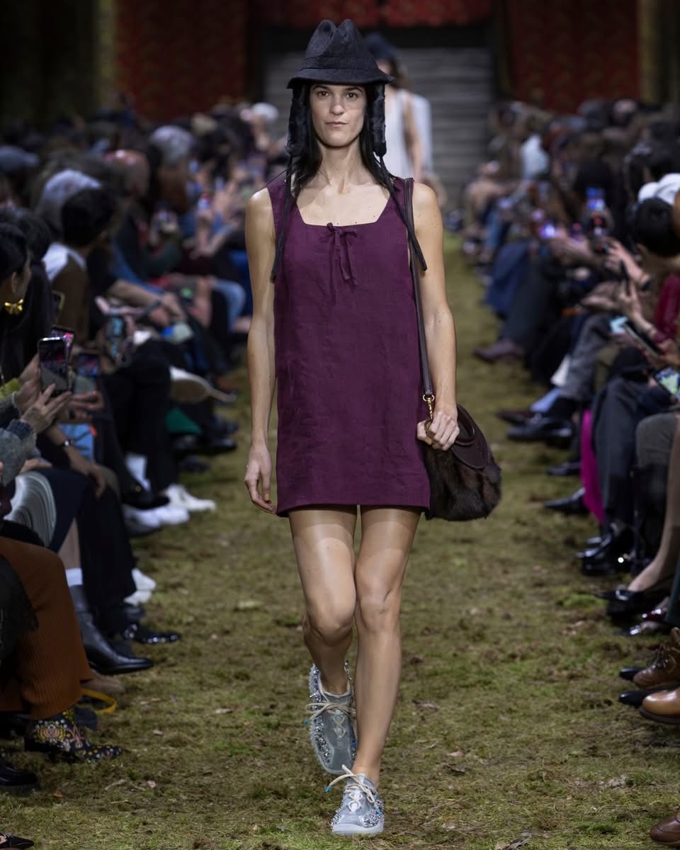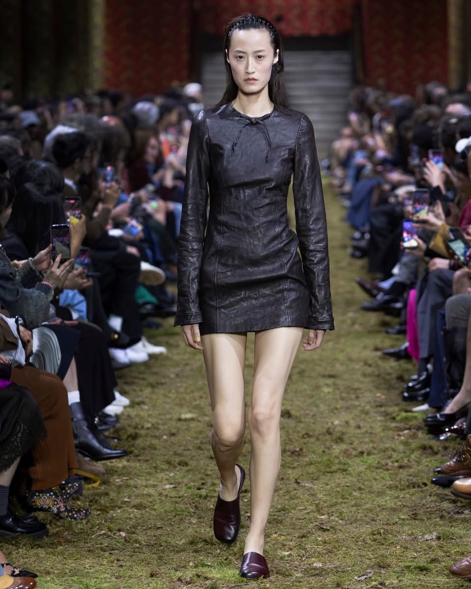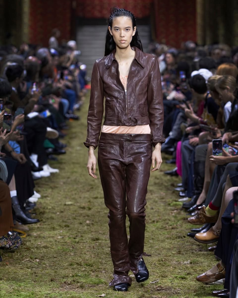 Les vêtements semblent choisis dans la précipitation. Tailleurs en cuir froissé, robes babydoll poudrées, baskets rétro, un unique colbacco en fourrure strassée… le stylisme est réduit à l’essentiel. Les couleurs, elles, oscillent entre bordeaux, beige, moutarde, rose pêche et gris infinis. Rien de joyeux. Rien de frivole.