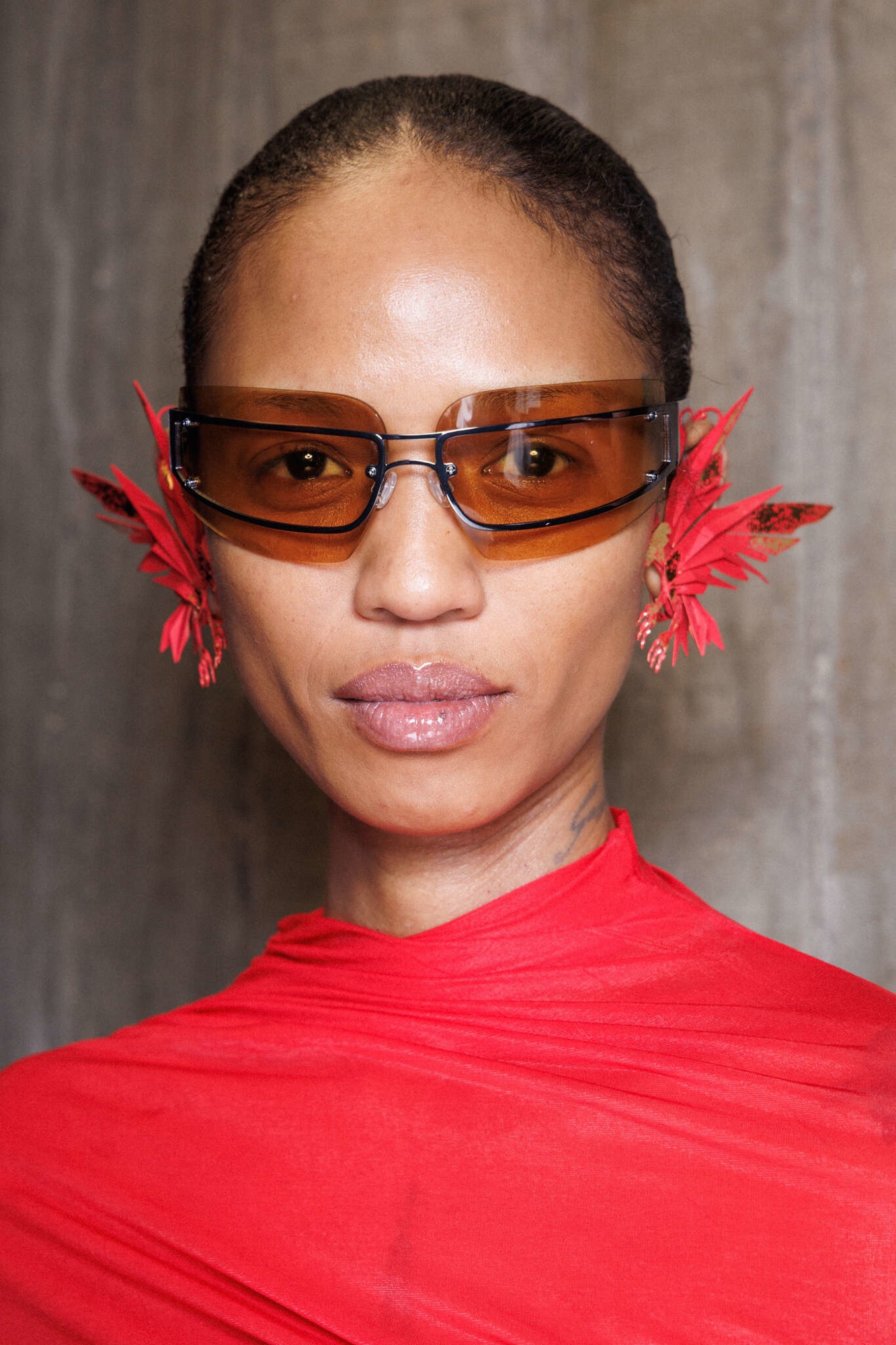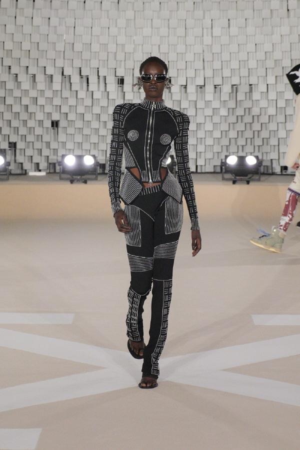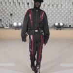 Cette ligne ne s’arrête pas à brouiller les frontières du genre. Les silhouettes masculines explorent des superpositions audacieuses, tandis que les coupes féminines jouent entre structure et sensualité, offrant des designs fluides et affirmés. Les références à l’héritage ghanéen du designer, discrètes, mais présentes, s’expriment à travers des motifs subtils, tels que des étoiles et des aigles. Une palette neutre, dynamisée par des éclats de couleurs vives comme l’aqua et le pourpre, reflète cette recherche d’équilibre entre enracinement et modernité.