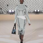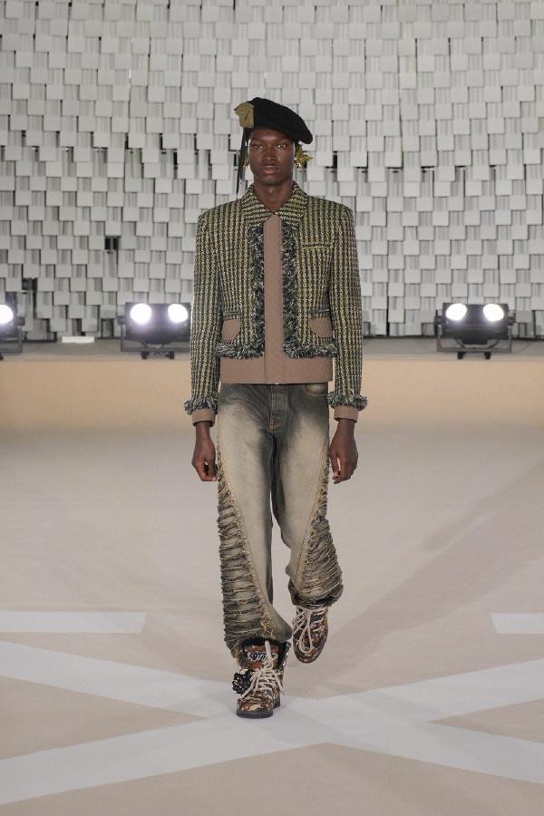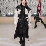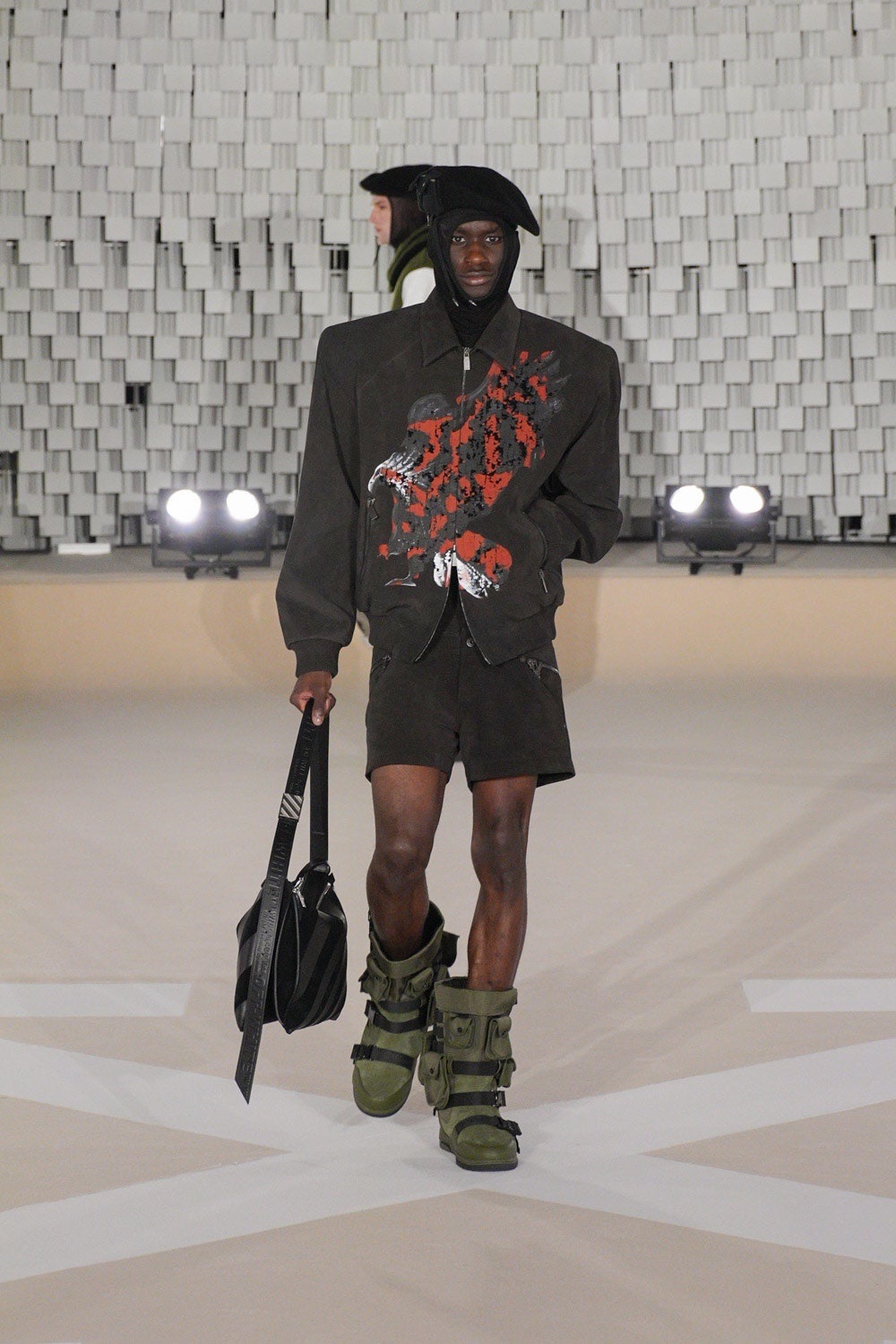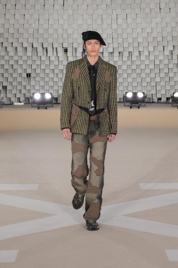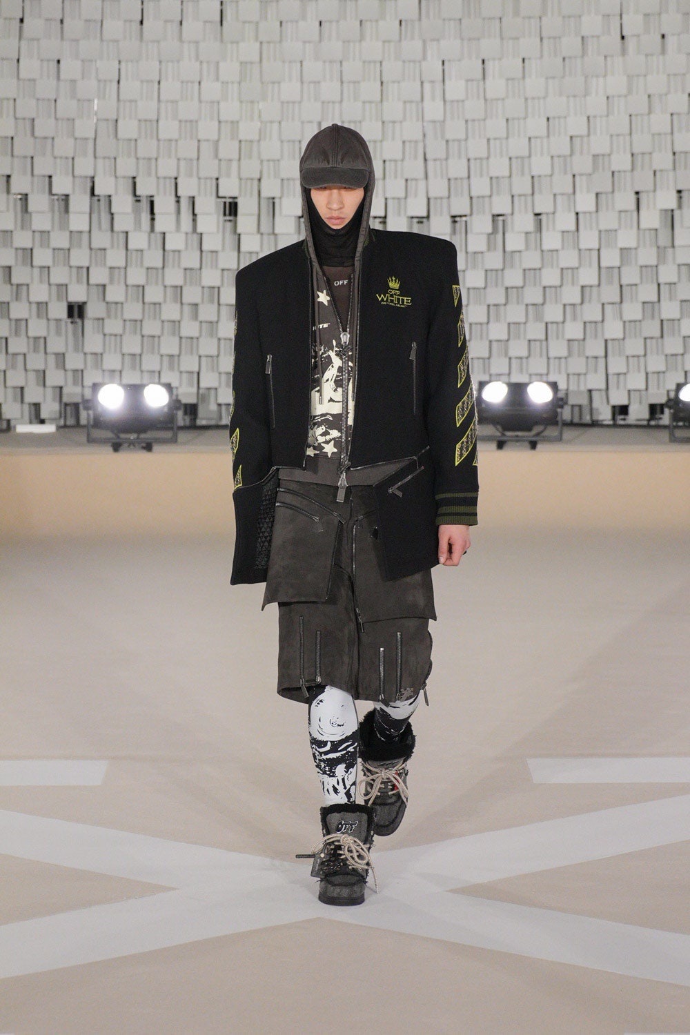 Les textiles choisis dans cette collection expriment une dualité fascinante. Le denim, matière emblématique d’Off-White, se transforme en une texture brute, presque déchiquetée, tandis que tweed et jersey s’entrelacent dans un dialogue entre rigidité et fluidité. Ces contrastes, renforcés par des détails ingénieux comme les zips omniprésents et l’introduction du Sand Bag, montrent une attention minutieuse à chaque élément.
