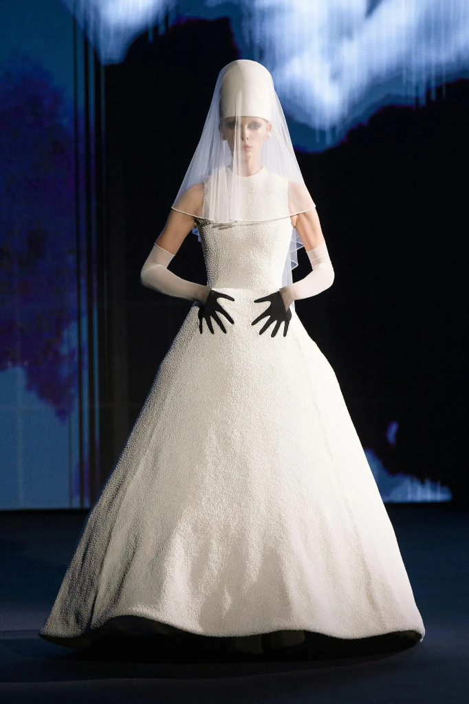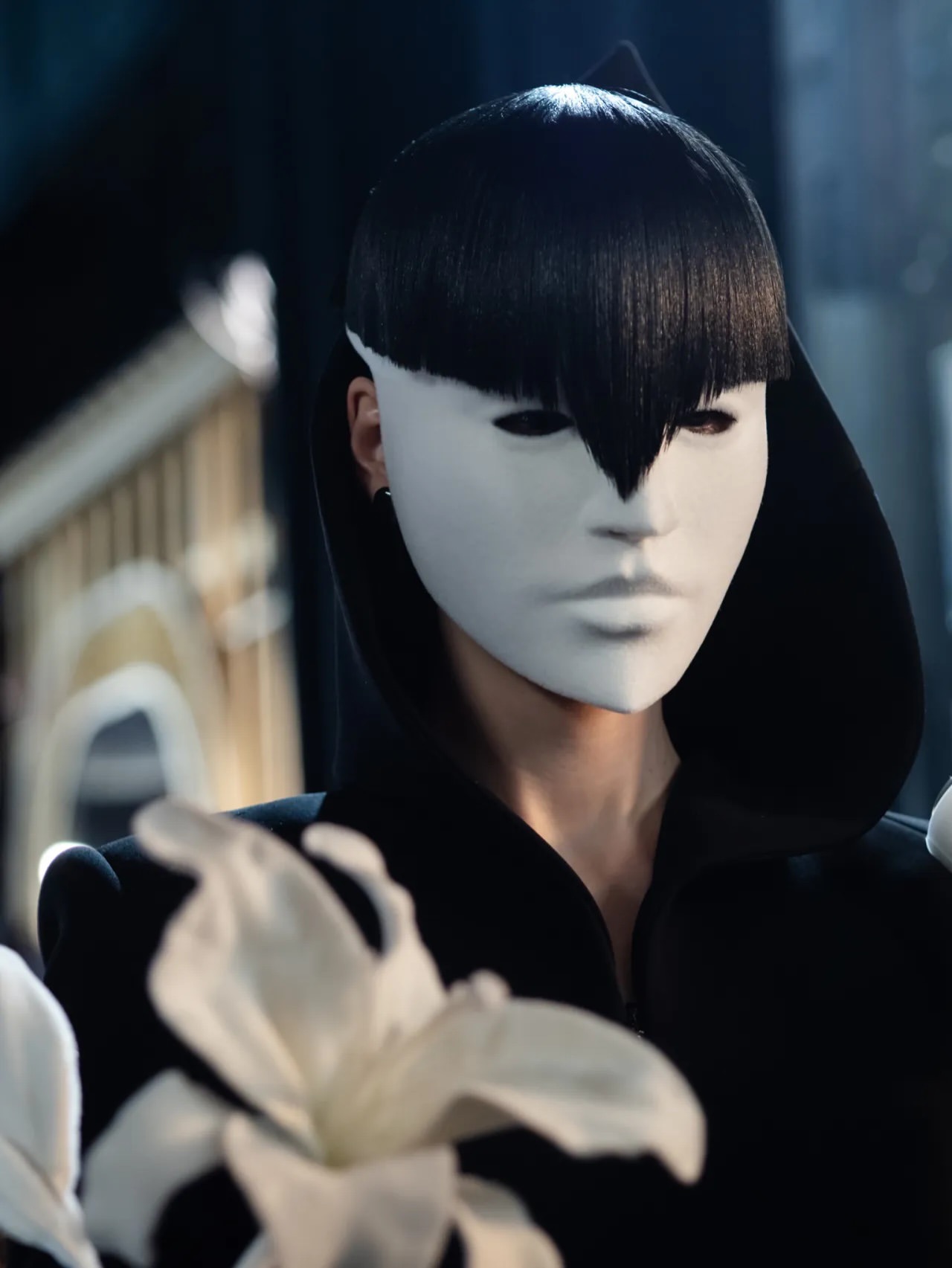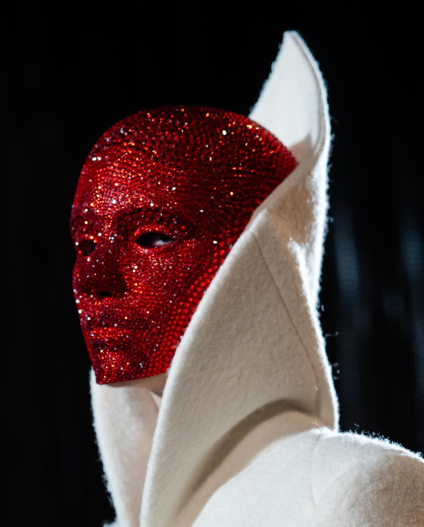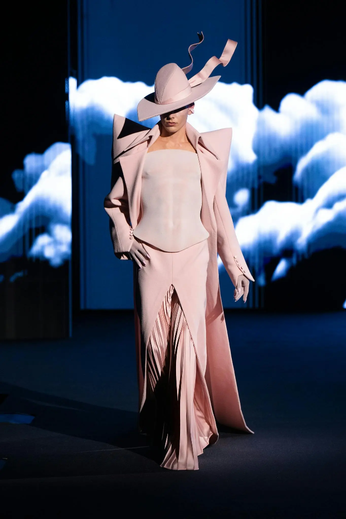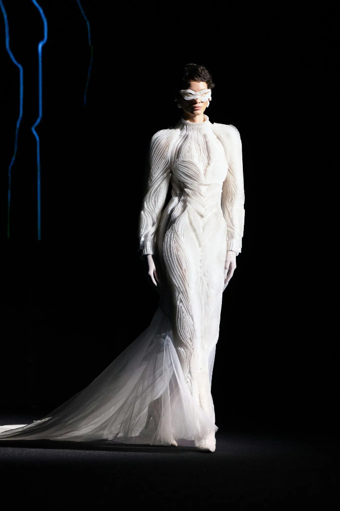 Puis la lumière s’est assombrie. L’orage grondait au-dessus du Lido, et la collection basculait dans „Luxe“ , un chapitre plus dur, plus lucide. Les mannequins avançaient masqués, leurs visages dissimulés sous des éclats de cristal. Comme si l’industrie imposait une armure. Les robes, inspirées des écrins de haute joaillerie, mêlaient corsages rigides et traînes fluides. C’était beau, mais c’était un aveu, celui du créateur qui découvre que le rêve doit composer avec les attentes, les pressions, les compromis.
