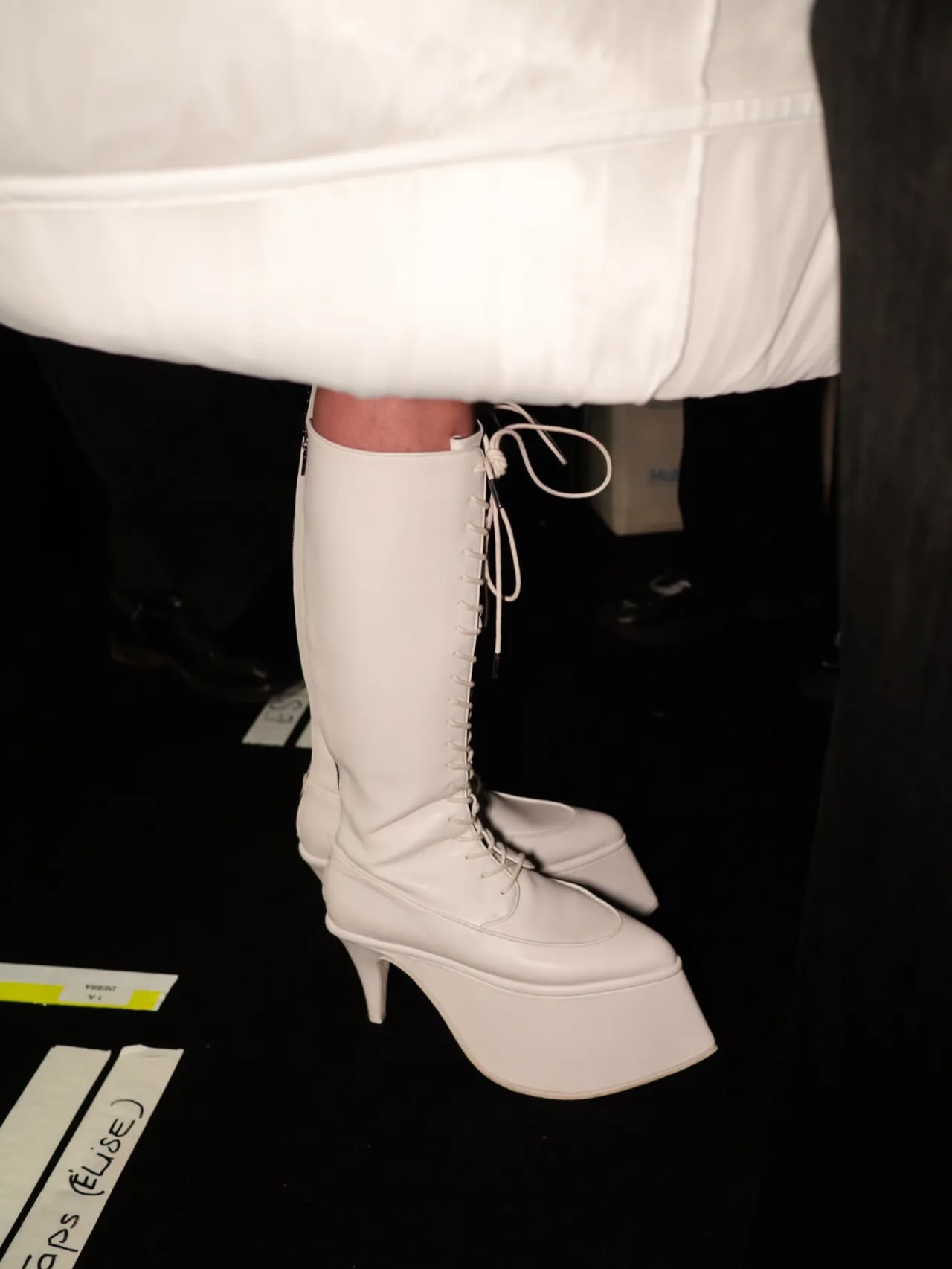 Le premier acte avait la douceur d’un rêve encore intact. „Bibliothèque“ plongeait dans les archives personnelles de Wun, ses croquis d’étudiant, ses premières intuitions. Les silhouettes monochromes semblaient découpées dans du papier : épaules arrondies, corsets galbés, lignes précises comme des études de formes. Une atmosphère studieuse, presque silencieuse, où l’on sentait la naissance d’une idée avant qu’elle ne soit déformée par le monde.