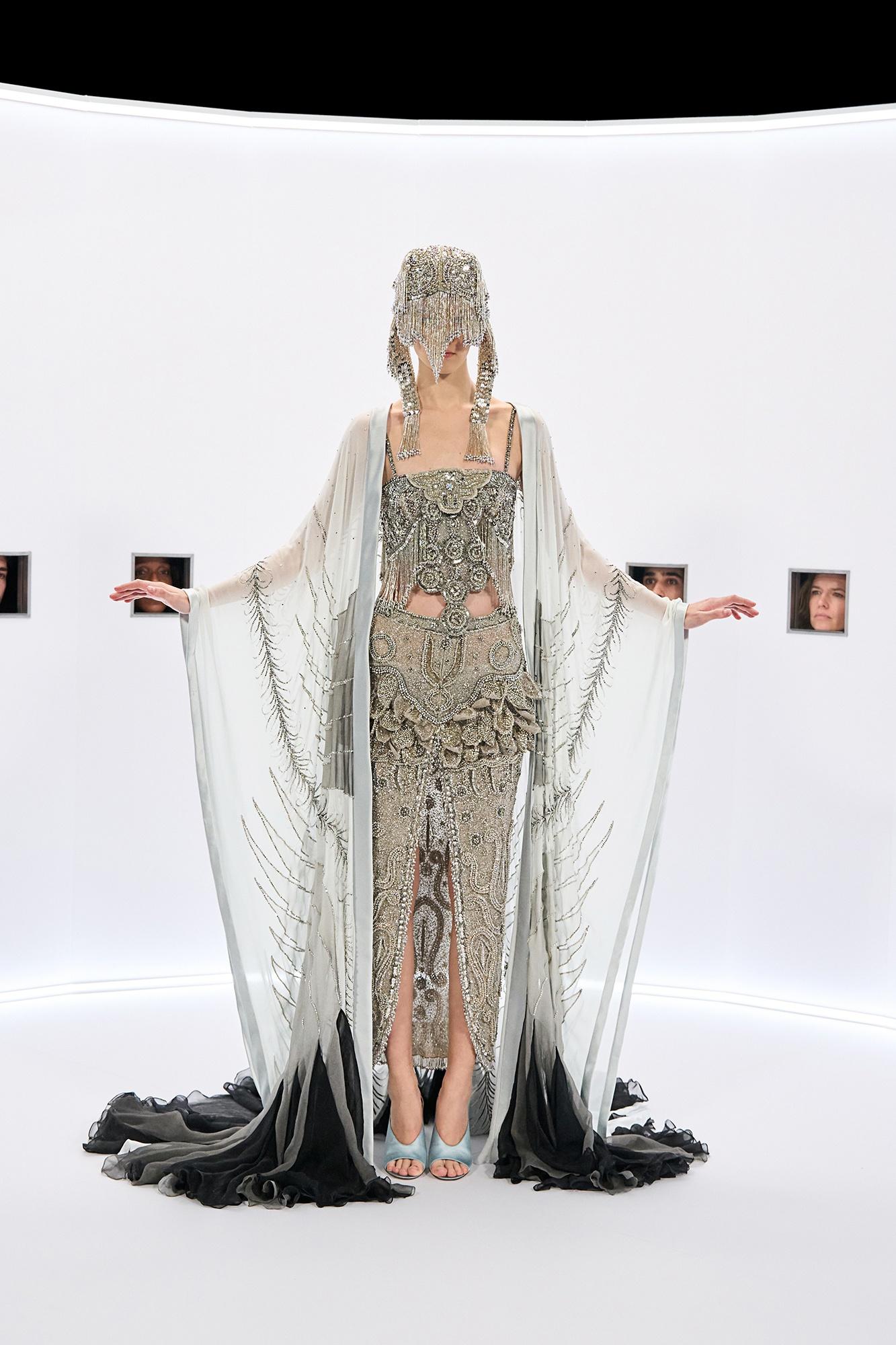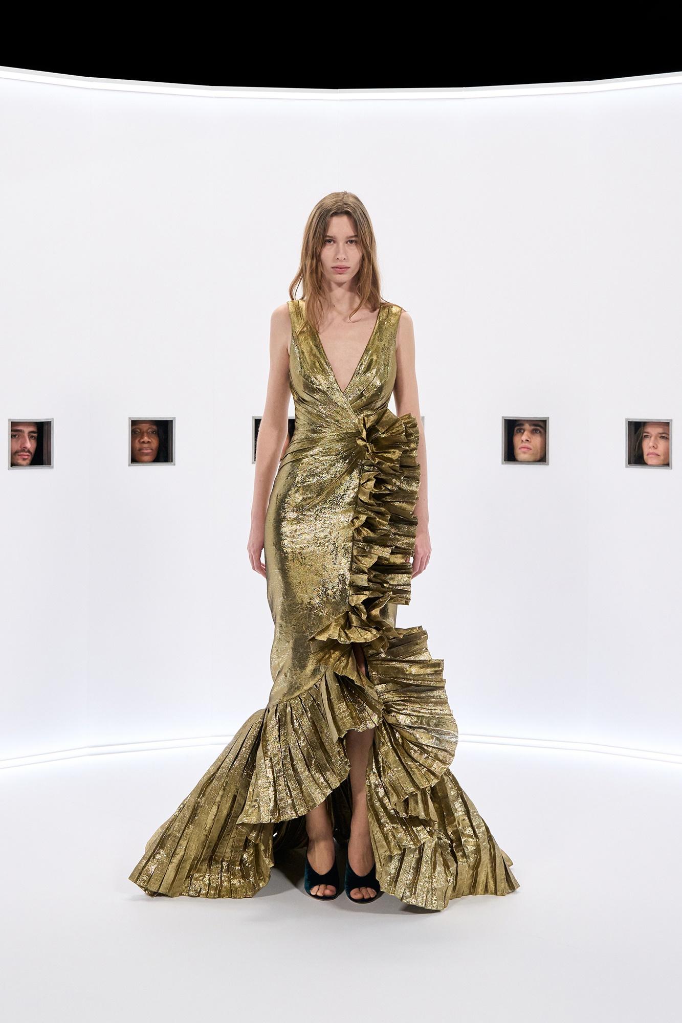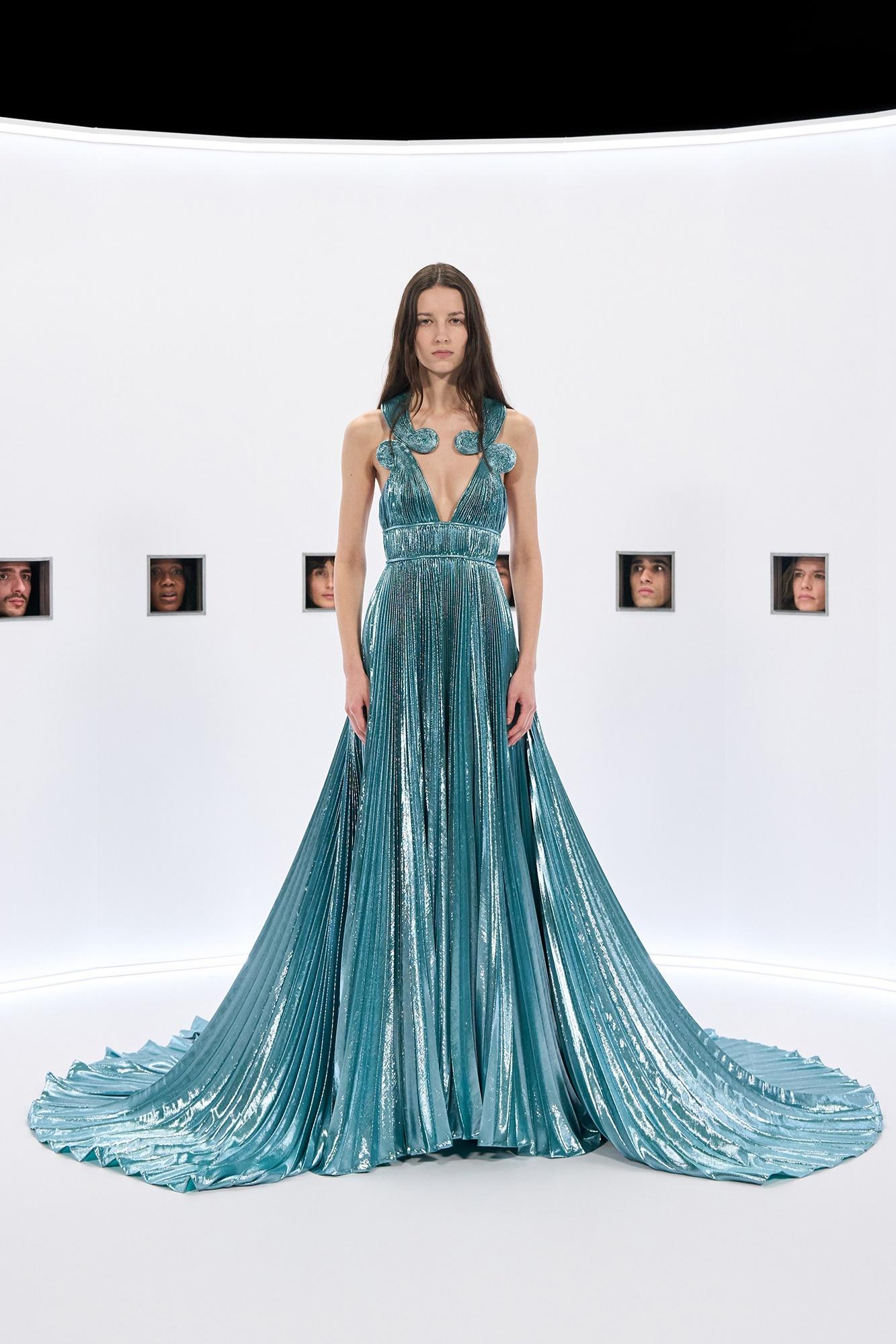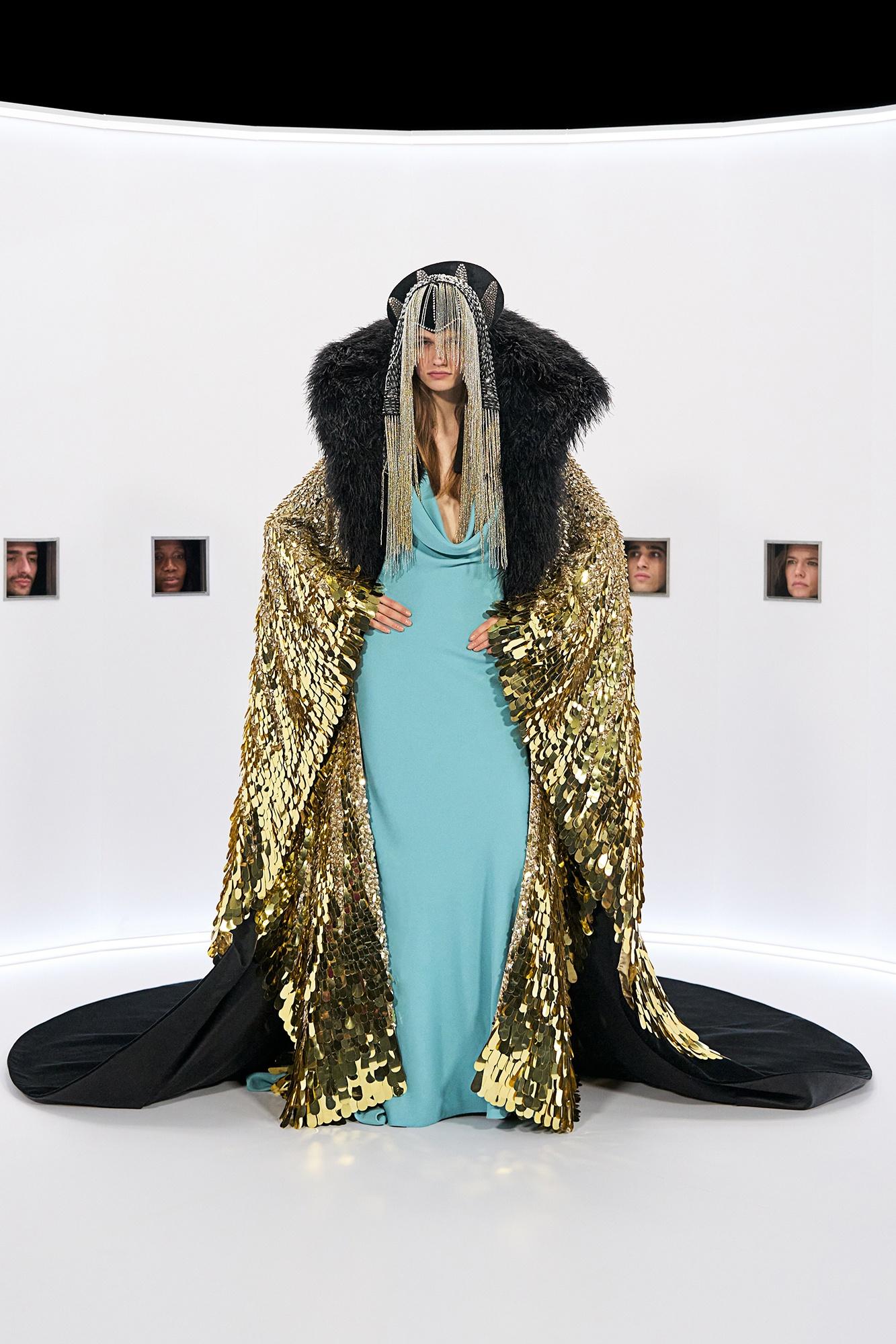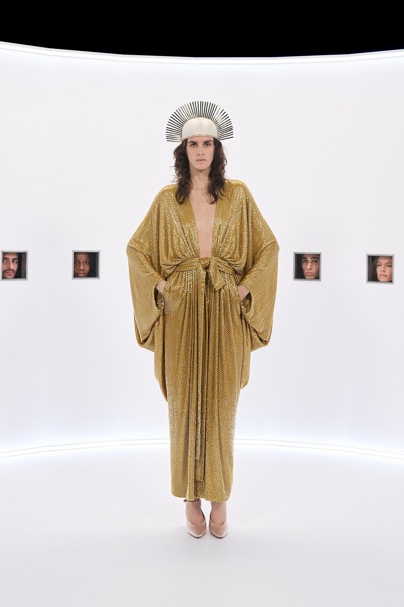 La collection avançait comme une procession d’icônes. Épaules affirmées, tailles basses, velours profonds, surfaces métalliques qui accrochaient la lumière comme des éclats de film nitrate. Les coiffes et capes en résille métallique donnaient aux silhouettes une allure quasi mythologique, comme si les mannequins sortaient d’un péplum oublié. Le mouvement des tissus, lui, était traité comme une sculpture vivante. Les drapés évoquaient la statuaire gréco-romaine, tandis que les tailleurs rigoureux rappelaient la tragédie royale. Gants d’opéra, traînes interminables, silhouettes étirées: tout respirait le drame, mais un drame élégant, maîtrisé, presque cérémoniel.