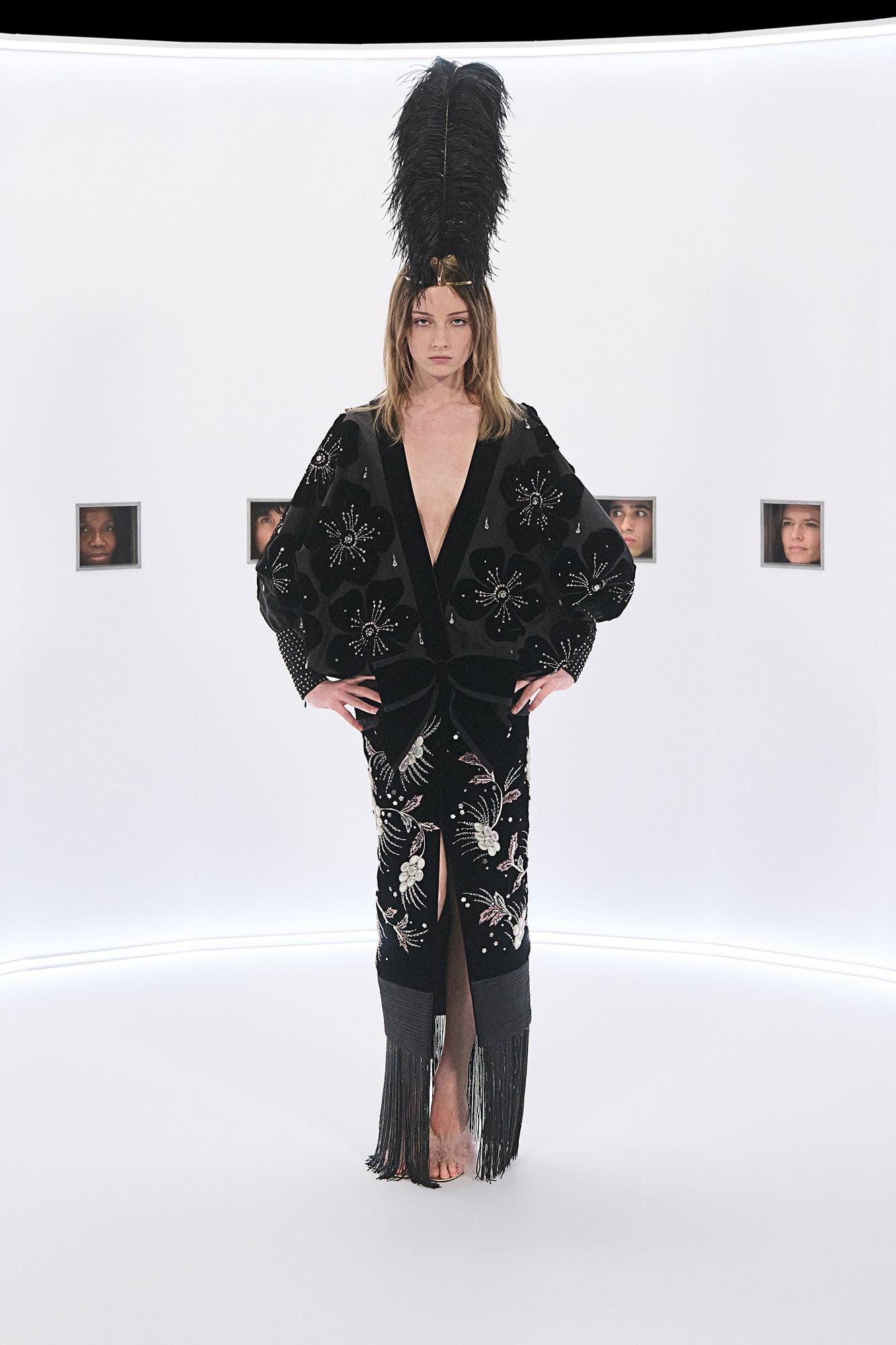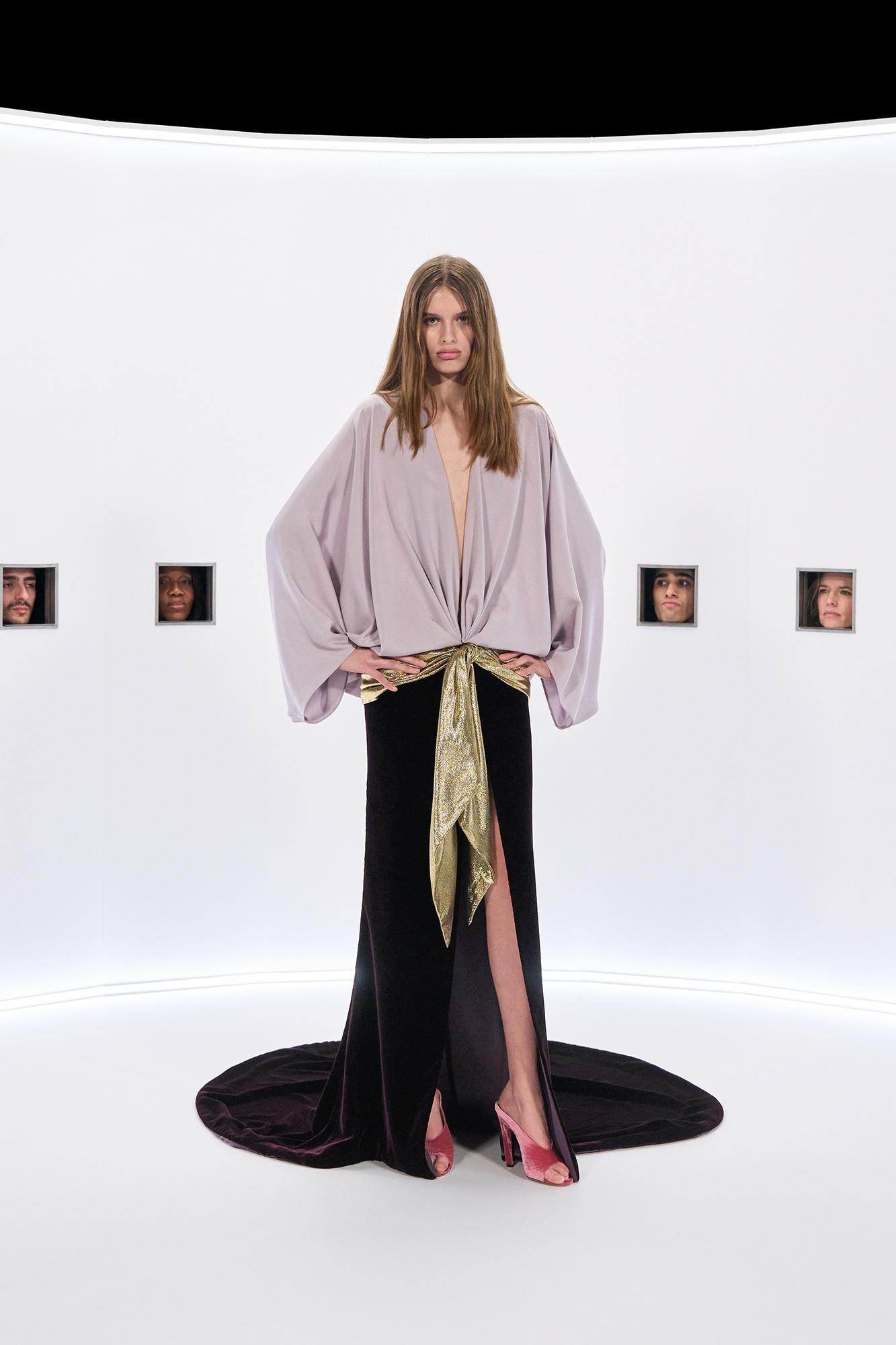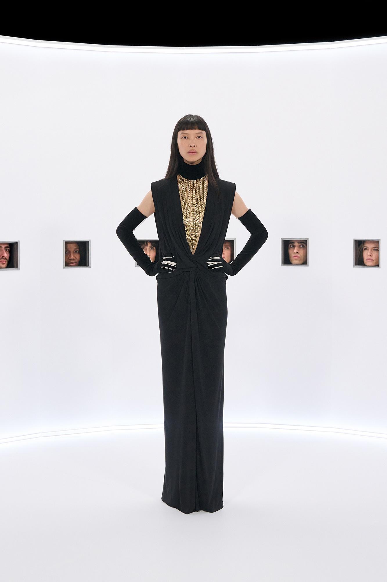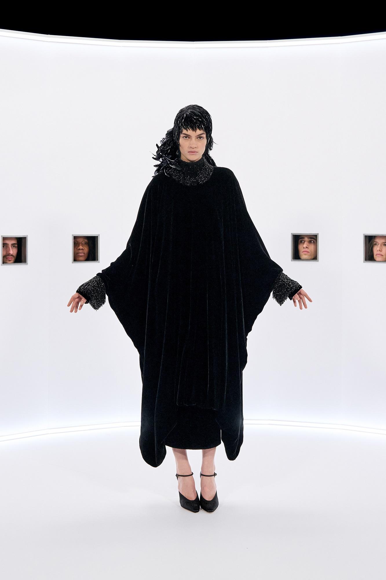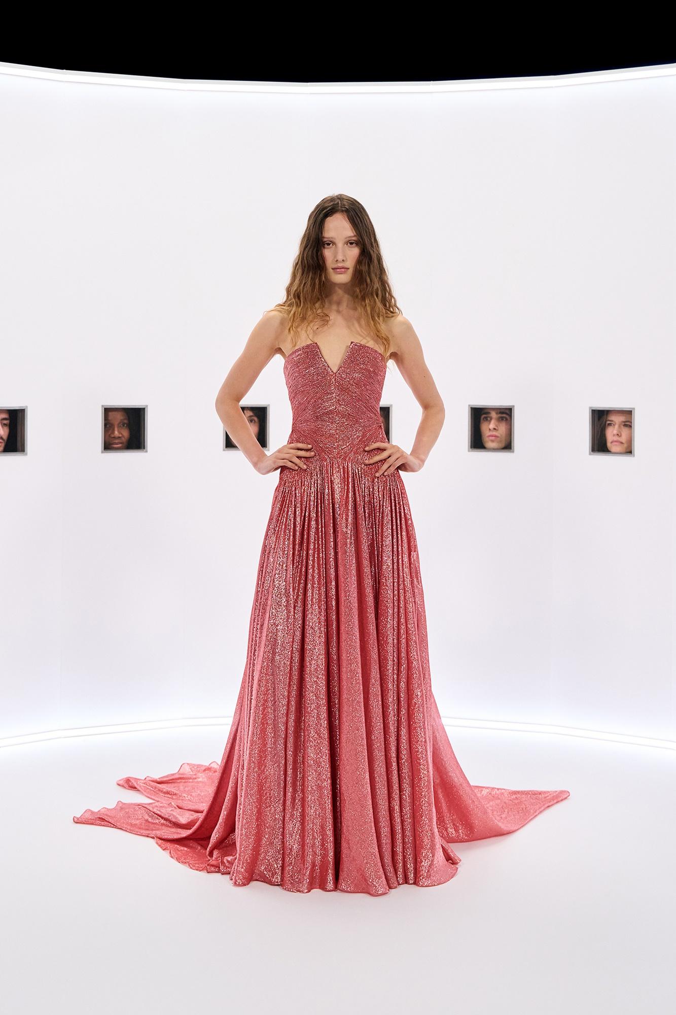 La collection avançait comme une procession d’icônes. Épaules affirmées, tailles basses, velours profonds, surfaces métalliques qui accrochaient la lumière comme des éclats de film nitrate. Les coiffes et capes en résille métallique donnaient aux silhouettes une allure quasi mythologique, comme si les mannequins sortaient d’un péplum oublié. Le mouvement des tissus, lui, était traité comme une sculpture vivante. Les drapés évoquaient la statuaire gréco-romaine, tandis que les tailleurs rigoureux rappelaient la tragédie royale. Gants d’opéra, traînes interminables, silhouettes étirées: tout respirait le drame, mais un drame élégant, maîtrisé, presque cérémoniel.