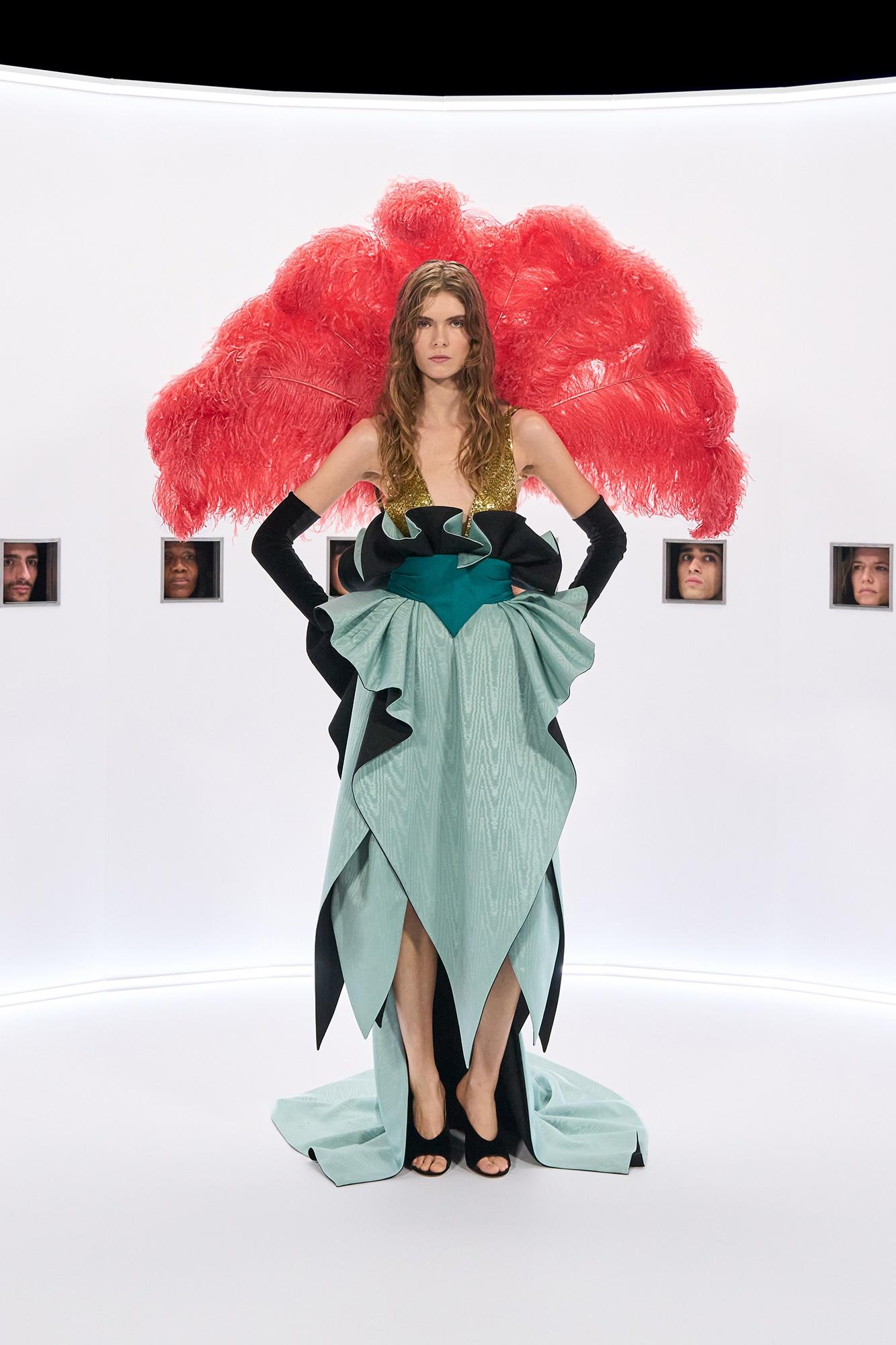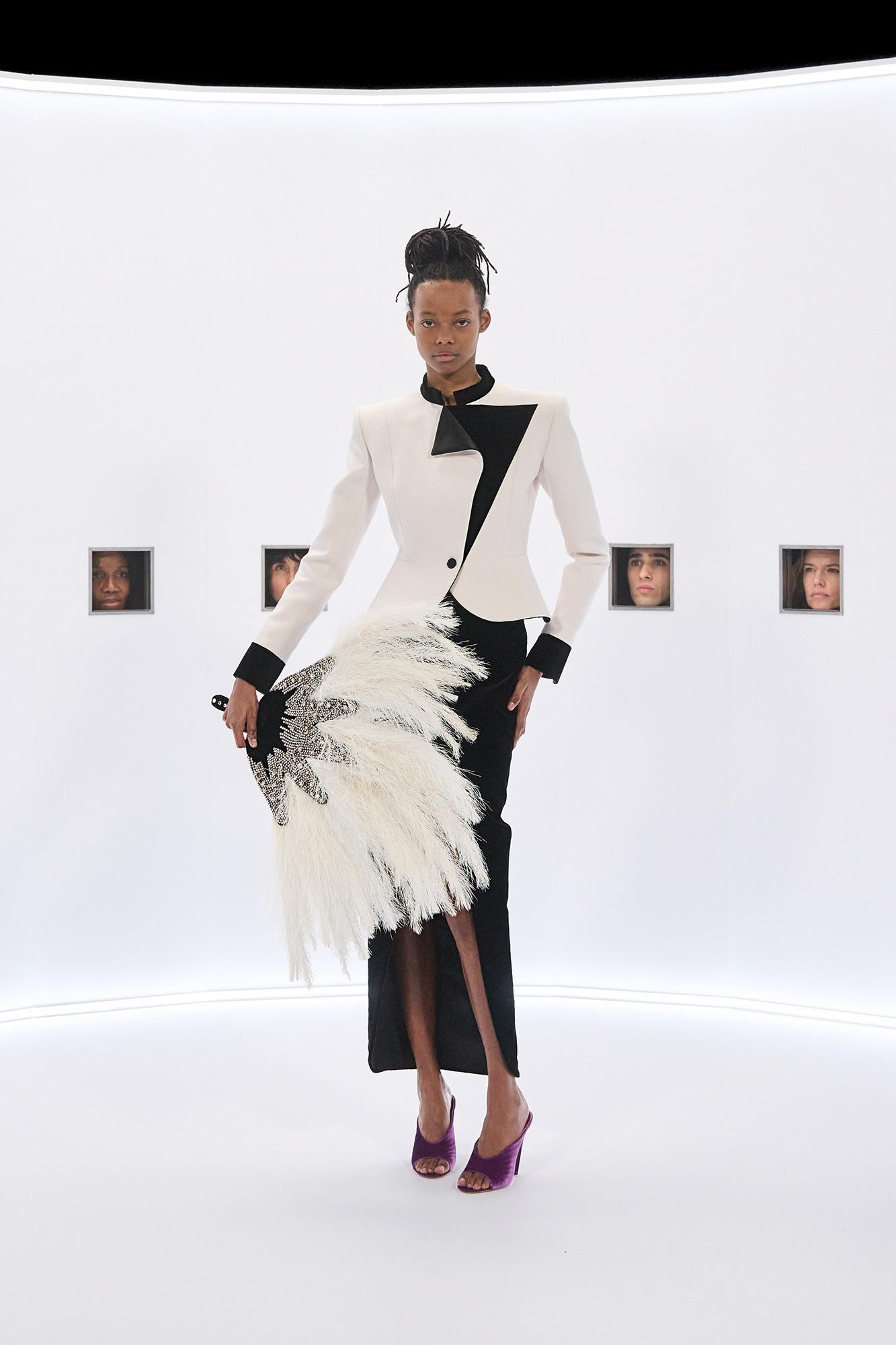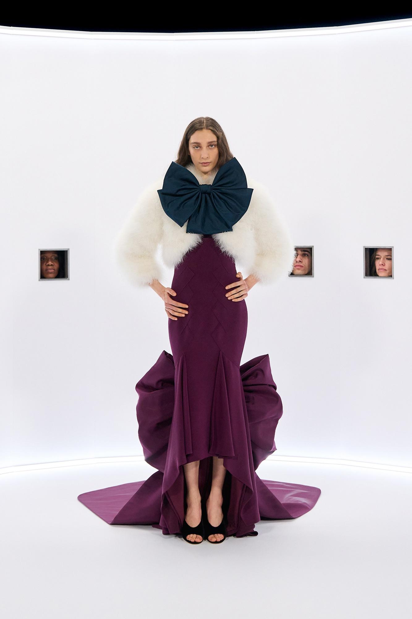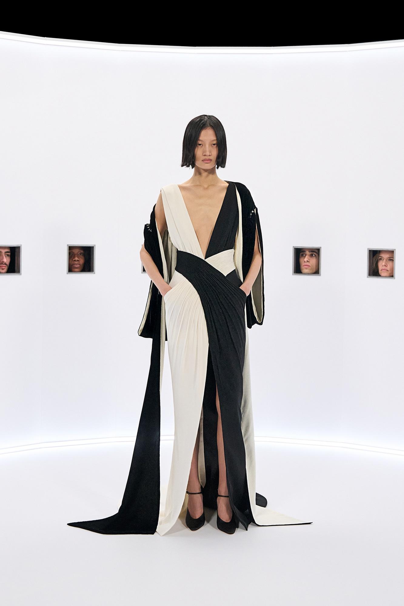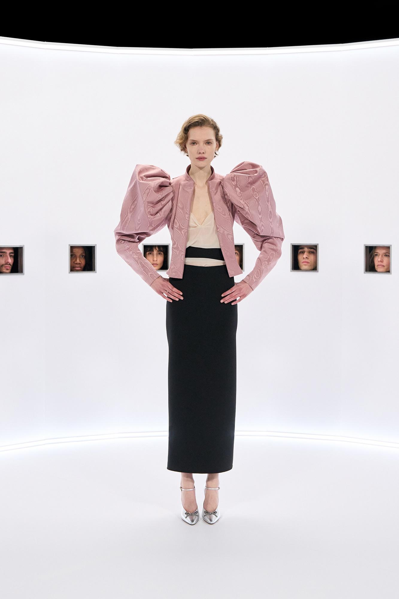 La collection avançait comme une procession d’icônes. Épaules affirmées, tailles basses, velours profonds, surfaces métalliques qui accrochaient la lumière comme des éclats de film nitrate. Les coiffes et capes en résille métallique donnaient aux silhouettes une allure quasi mythologique, comme si les mannequins sortaient d’un péplum oublié. Le mouvement des tissus, lui, était traité comme une sculpture vivante. Les drapés évoquaient la statuaire gréco-romaine, tandis que les tailleurs rigoureux rappelaient la tragédie royale. Gants d’opéra, traînes interminables, silhouettes étirées: tout respirait le drame, mais un drame élégant, maîtrisé, presque cérémoniel.