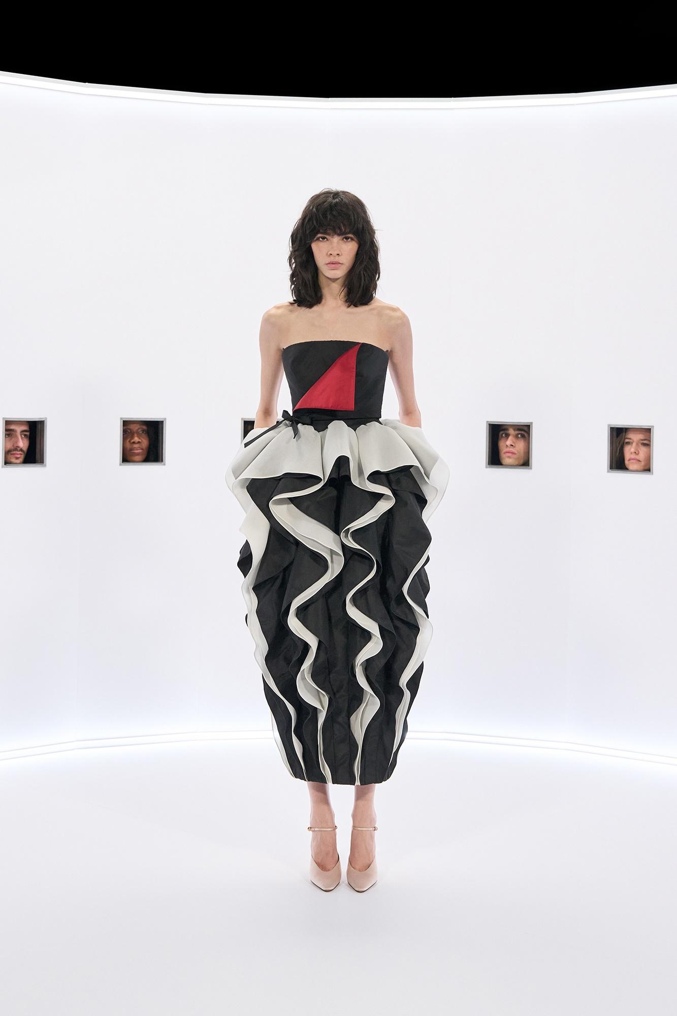 Avant même que les silhouettes n’apparaissent, le designer avait déjà posé son geste. Les spectateurs ne voyaient pas le défilé dans son ensemble, mais à travers de petites fenêtres percées dans un mur circulaire, réplique contemporaine du Kaiserpanorama du XIXᵉ siècle. Une vision fragmentée, volontairement limitée. Un ourlet surgissait avant un visage. Une manche glissait dans le champ avant que la silhouette ne se révèle. Les broderies n’apparaissaient qu’un instant, comme un souvenir qu’on attrape du coin de l’œil. Cette mise en scène imposait une lenteur, une attention presque méditative. Elle rappelait les premiers temps du cinéma, quand l’image n’était pas encore un flux continu mais une succession de visions fugaces. Chacun construisait son propre film, sa propre lecture. Une mode qui ne s’impose pas, mais qui se laisse deviner.