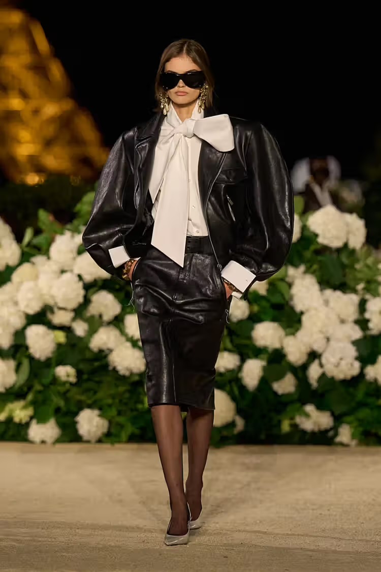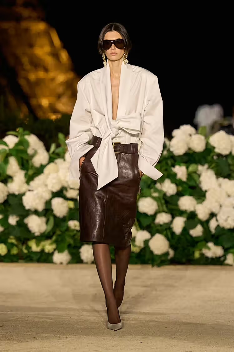 Le décor est un rêve en blanc. Des hortensias à perte de vue, un jardin YSL où le logo mythique devient motif floral. On pense à Cassandre, à Laetitia Casta en bikini de roses, à l’exubérance des années 90. Mais ici, la douceur du décor est un leurre. Car ce que le créateur belge fait défiler, ce sont des guerrières. Elles arrivent en cuir noir, épaules carrées, allure conquérante. Robert Mapplethorpe rôde, discret mais présent. Les silhouettes sont tendues, presque agressives, comme des armures modernes. Puis, sans prévenir, le cuir cède la place à des robes parachutes aux couleurs vives, à des trenchs qui flottent comme des drapeaux. C’est la « Rive Gauche » qui revient, mais avec une ironie douce. Une manière de dire que la liberté ne se porte pas, elle se revendique.