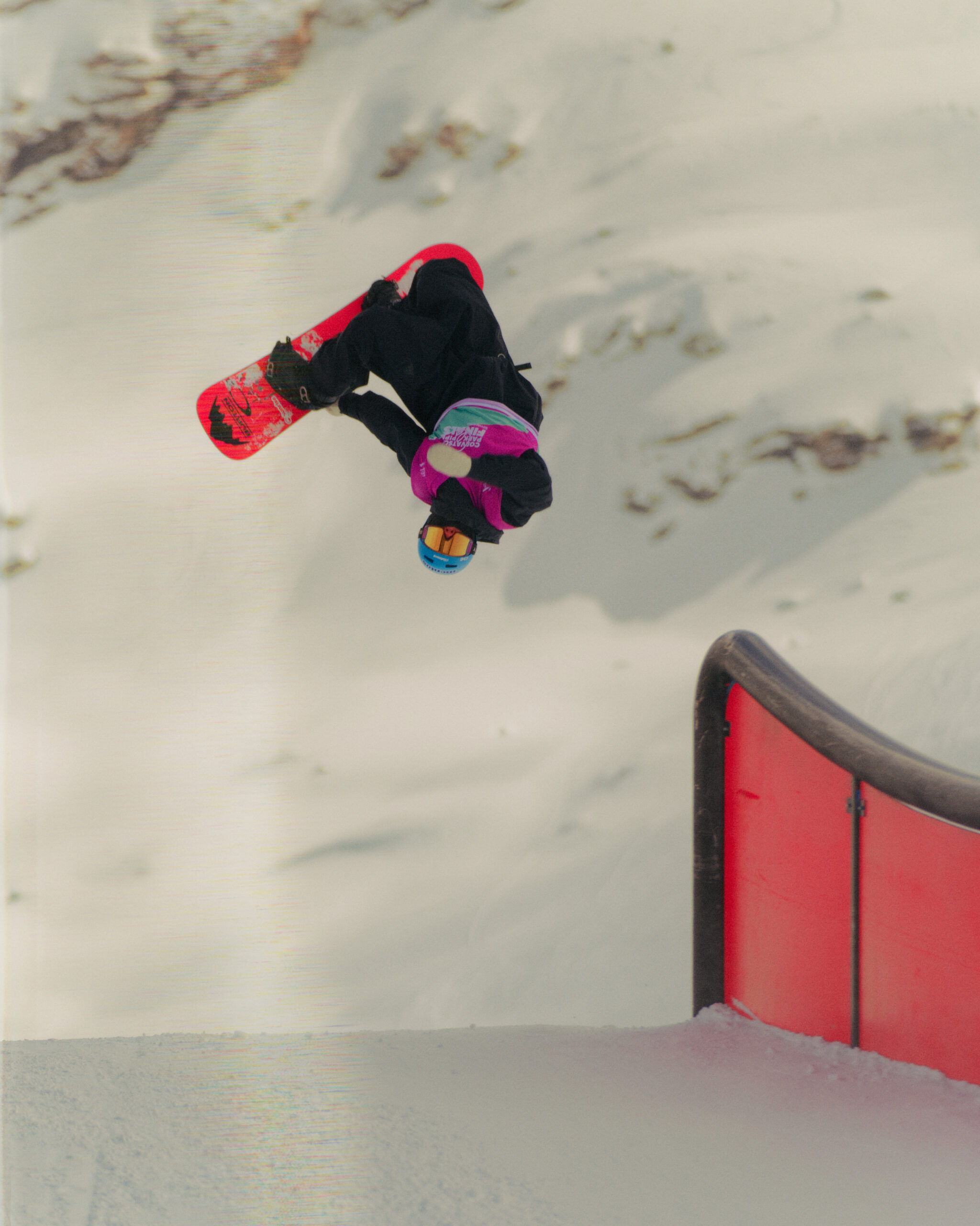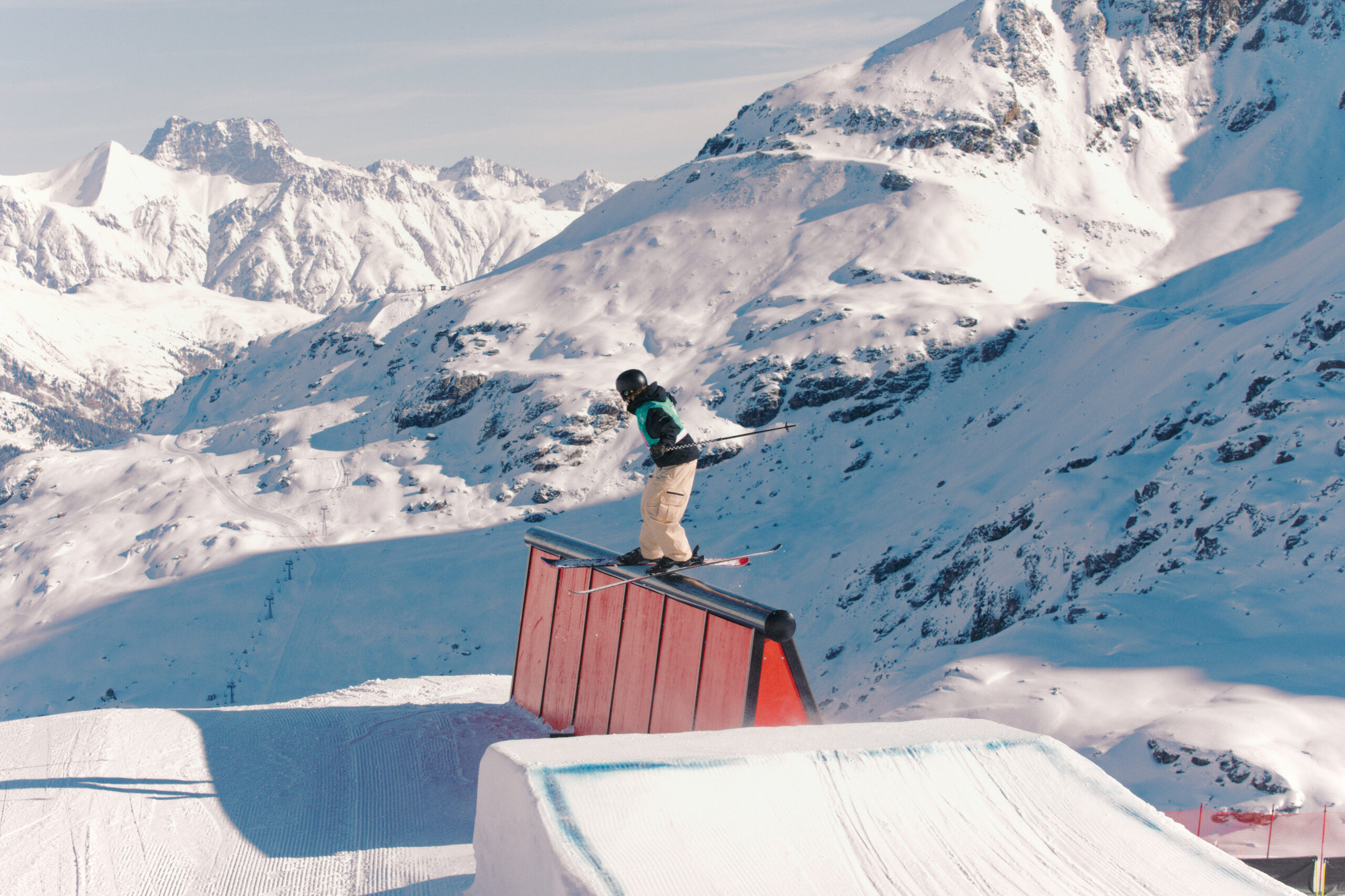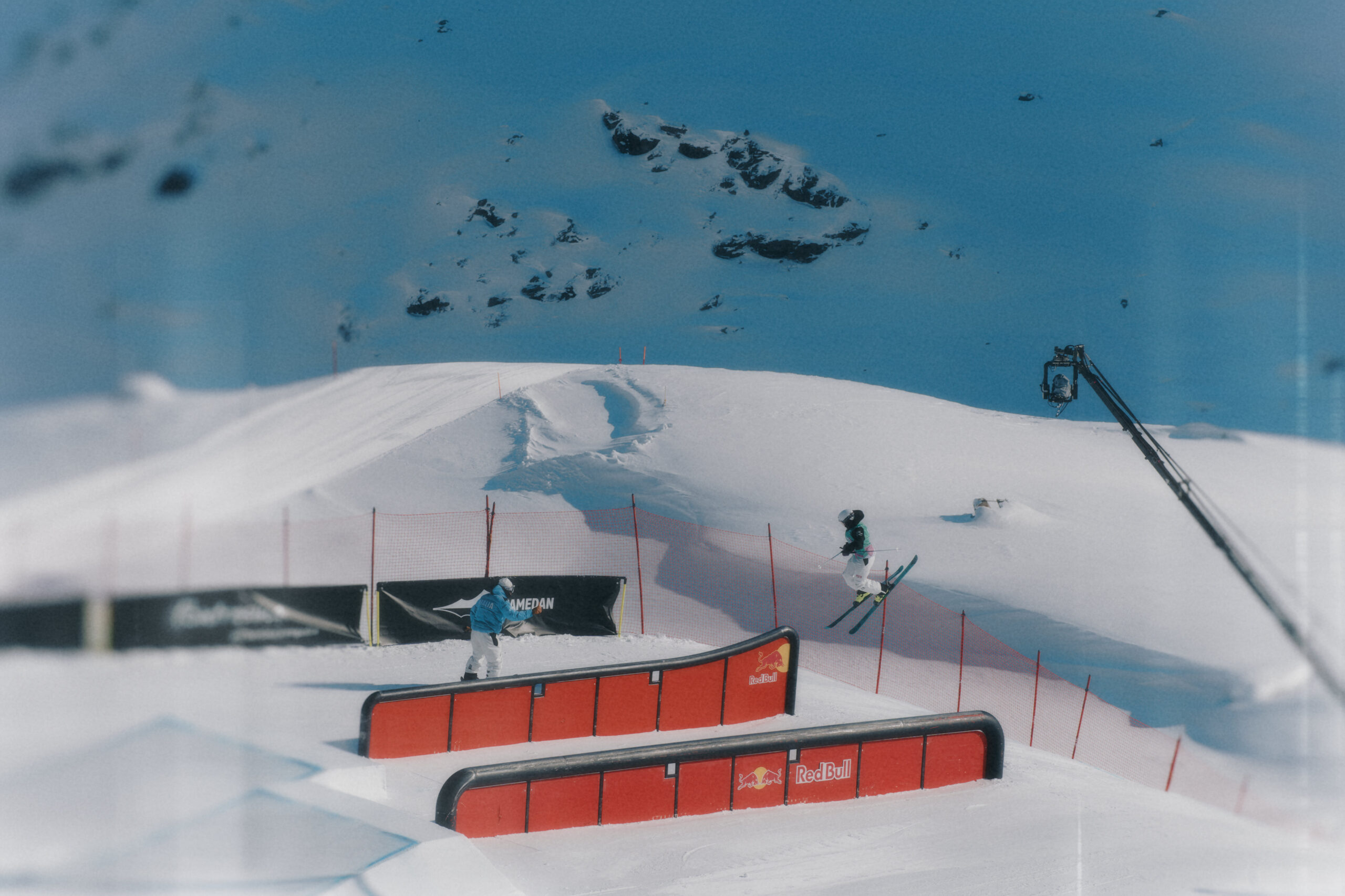 Kobi Würsch, le maître shaper du Corvatsch Park, a encore frappé fort. Rails créatifs, kickers massifs, transitions parfaites. Le matin, la neige filait comme une lame. L’après-midi, elle devenait douce, presque joueuse. Le terrain rêvé pour envoyer, tenter, oser. Autour, les DJ faisaient vibrer les terrasses, les riders s’offraient des sunset sessions, et la montagne semblait sourire.