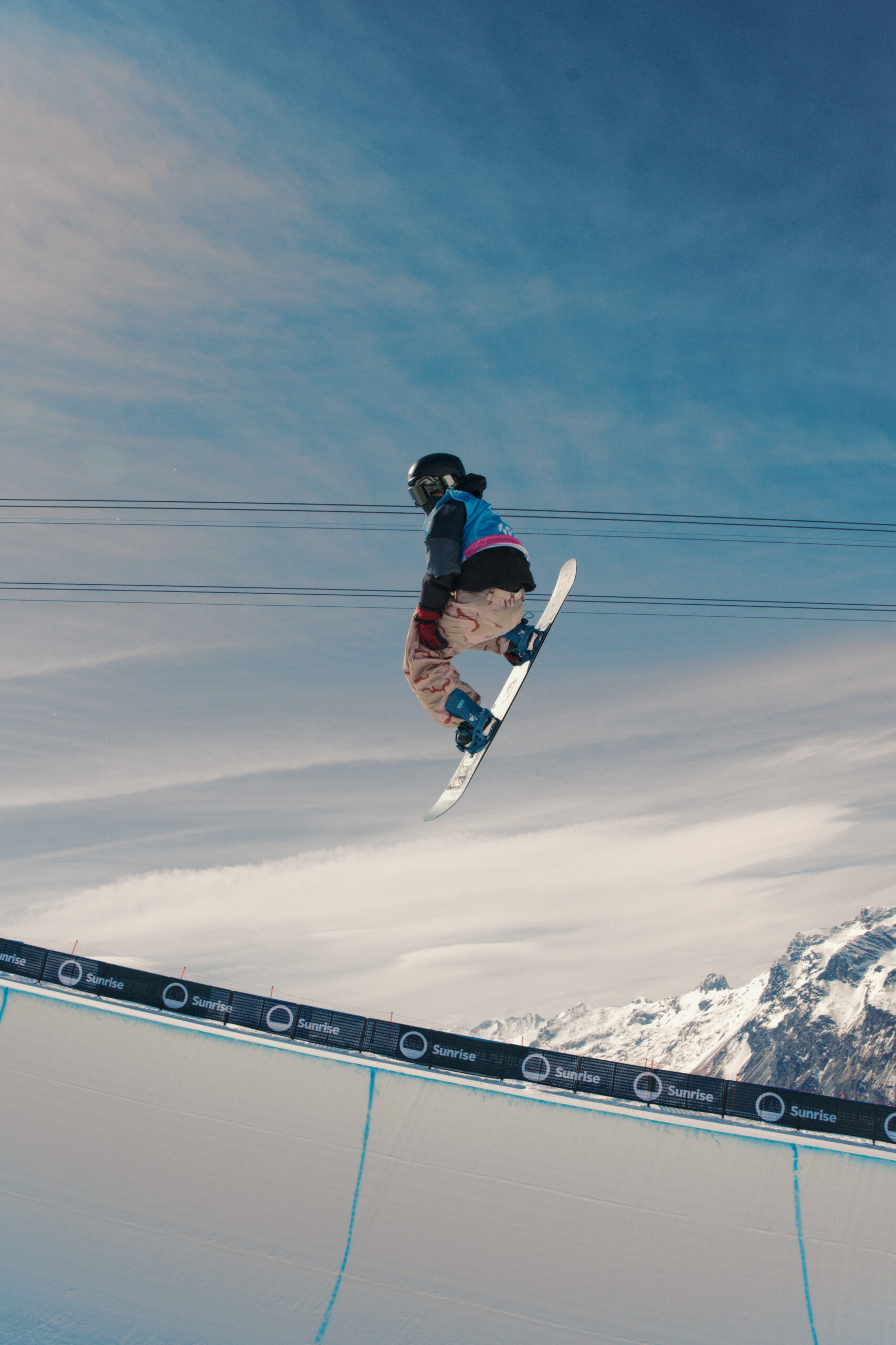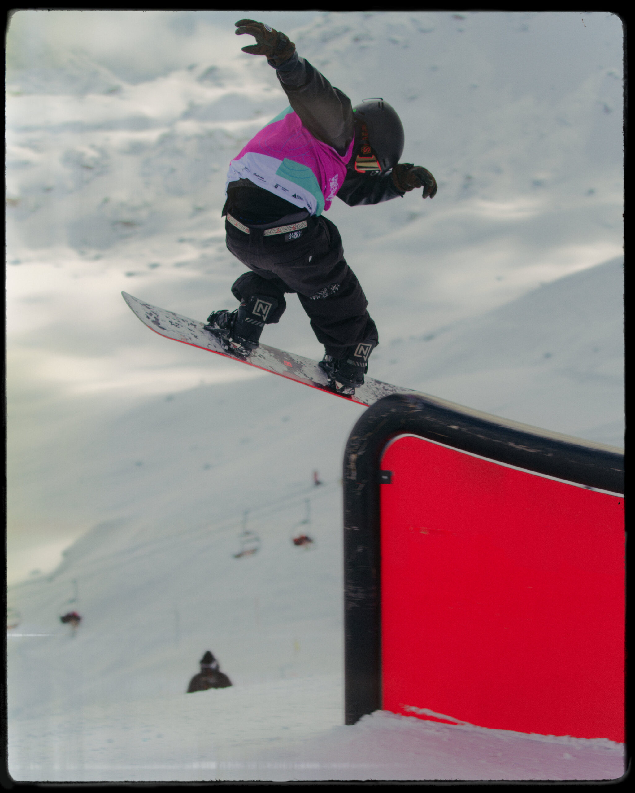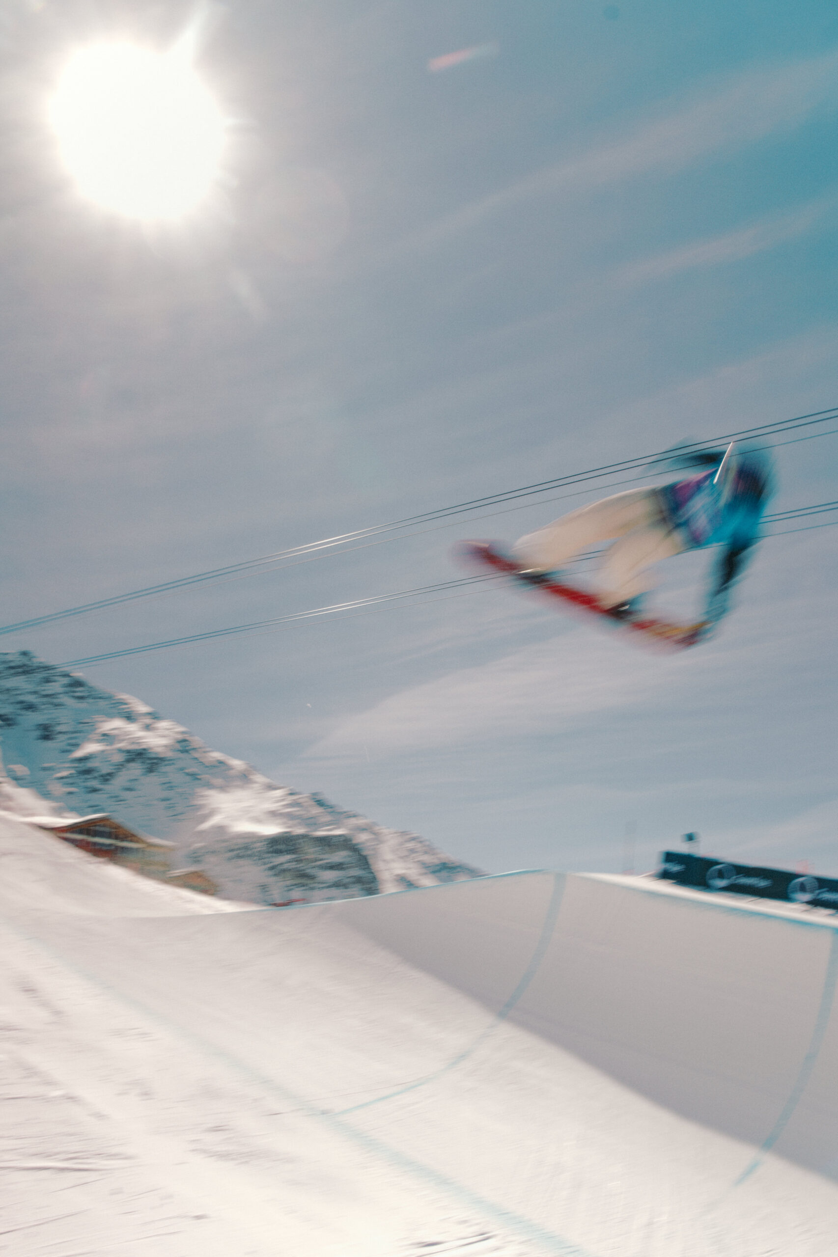 Kobi Würsch, le maître shaper du Corvatsch Park, a encore frappé fort. Rails créatifs, kickers massifs, transitions parfaites. Le matin, la neige filait comme une lame. L’après-midi, elle devenait douce, presque joueuse. Le terrain rêvé pour envoyer, tenter, oser. Autour, les DJ faisaient vibrer les terrasses, les riders s’offraient des sunset sessions, et la montagne semblait sourire.