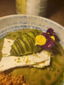 Le dessert arrive comme une respiration. Un souffle clair, presque aérien. Agrumes, basilic, pâte de pistache pure, crumble doré. Un jeu de textures et de températures qui évoque la fraîcheur d’un matin d’hiver, quand la lumière glisse doucement sur les toits. On y retrouve la Thaïlande des marchés parfumés, mais aussi la précision de la pâtisserie française, celle qui va droit à l’essentiel. C’est un final lumineux, un sourire en fin de soirée, une manière douce de refermer la nuit.