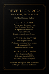 Avec ce menu, Paul Santana Dufour ne cherche pas à impressionner. Il cherche à raconter. Raconter une double culture, un parcours, une sensibilité. Raconter que la fête n’est pas seulement un moment de faste, mais un moment de vérité, où la cuisine devient un langage intime. Ce menu Réveillon porte la signature d’un chef qui connaît ses racines, maîtrise ses codes et ose tracer ses propres chemins. Une cuisine qui ne choisit pas entre plusieurs cultures, mais qui les unit, les élève, les célèbre. Une nuit où tout s’équilibre. Une nuit où tout s’éclaire. Une nuit qui ressemble à un voyage.