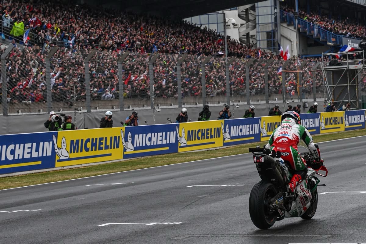 À quatre tours de l’arrivée, Johann Zarco dispose de 16 secondes d’avance sur Marc Marquez. Le public sarthois retient alors son souffle, espérant que le leader puisse rallier l’arrivée sans encombre. Johann Zarco ne sera finalement pas inquiété. Il remporte ainsi un Grand Prix de France de MotoGP complètement fou, pour devenir le premier vainqueur français en catégorie reine au Mans. Il décroche également la 100e victoire française dans la discipline. Le dernier français à avoir remporté le GP de France était avant ça Pierre Monneret, au cours de l’année 1954. Marc Marquez et Fermin Aldeguer (Ducati Gresini) complètent le podium. Ce dernier tout comme son compatriote Pedro Acosta enregistrent leur meilleur résultat cette saison. Revenu à la compétition pour une Wildcard avec Honda, Takaaki Nakagami (Honda) profite des conditions exceptionnelles pour décrocher une superbe 6ᵉ place. Derrière Raul Fernandez (Aprilia Trackhouse), 7e, et Fabio Di Giannantonio (Ducati VR46), 8e, Lorenzo Savadori (Aprilia) décroche la 9e place, son premier top-10 de la saison.