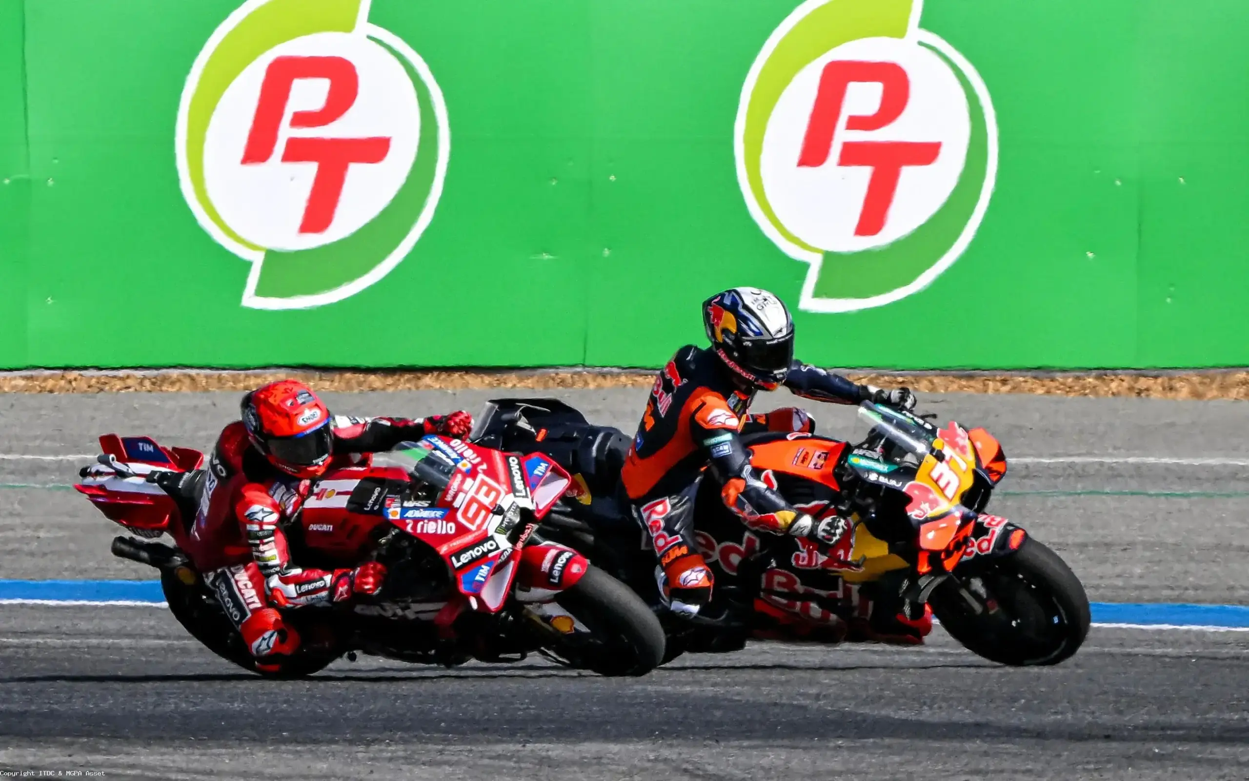 À Buriram, personne n’imaginait que Pedro Acosta (KTM) décrocherait sa première victoire MotoGP lors du Sprint. Le jeune prodige de KTM s’élançait certes parmi les favoris, mais c’est Marc Márquez (Ducati) qui réalisait le holeshot, prenant immédiatement les commandes devant Marco Bezzecchi. Les deux hommes se livrent alors un duel de folie, roue contre roue, jusqu’à ce que le leader transalpin parte à la faute après seulement 3 tours. Une chute qui semblait ouvrir un boulevard à Marc Márquez… mais c’était sans compter sur l’insolence de talent du jeune pilote KTM.