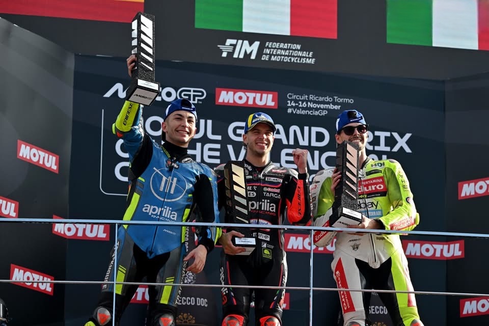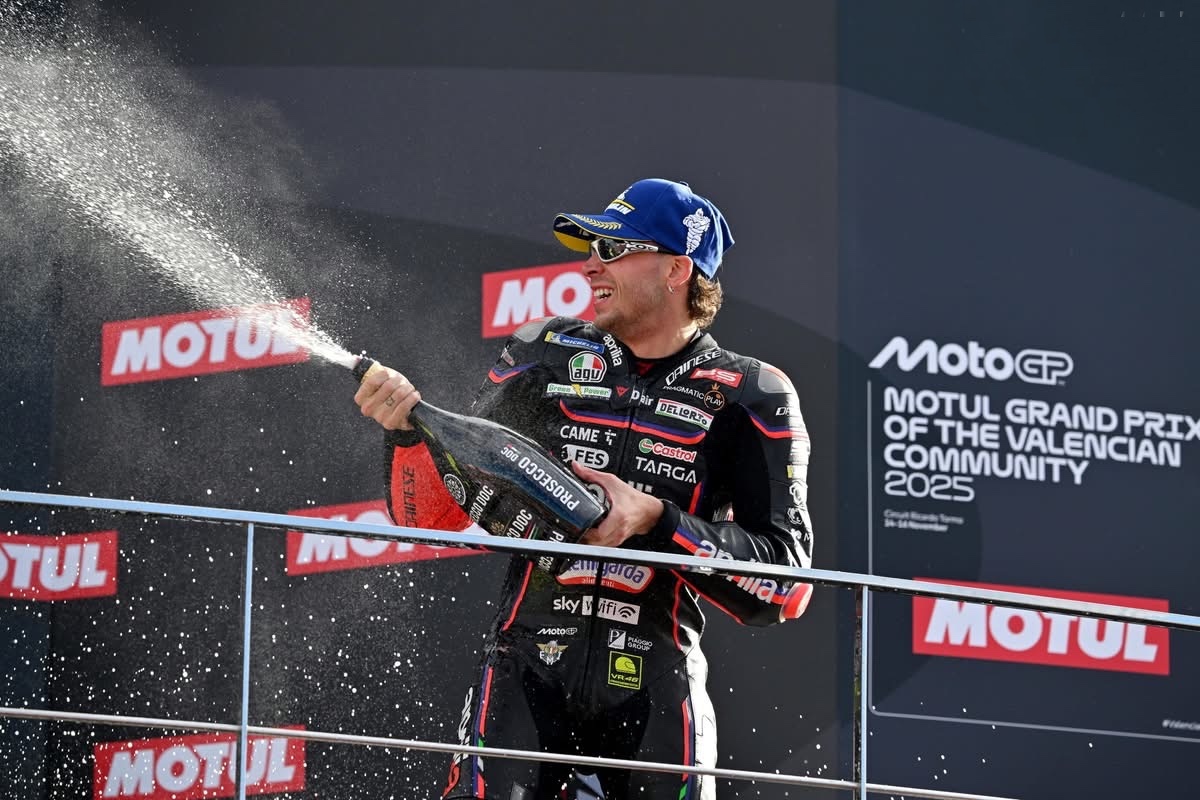 Le rideau est tombé sur la saison MotoGP 2025 à Valence. Marco Bezzecchi a offert à Aprilia un doublé historique en course principale, accompagné de Raúl Fernández, tandis qu’Álex Márquez s’est imposé dans le dernier Sprint de l’année. Entre victoires éclatantes, chutes spectaculaires et adieux émouvants, le Circuit Ricardo Tormo a été le théâtre d’une clôture riche en symboles. Par Khalad