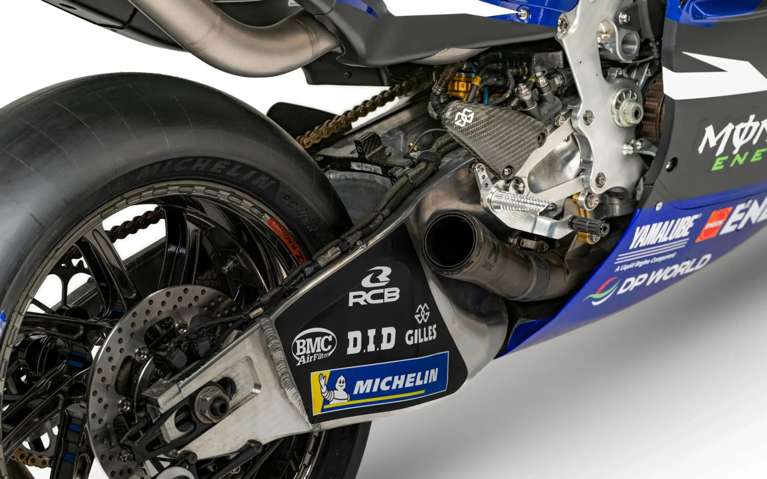 Avec l’arrivée de DP World, géant mondial de la logistique, un partenaire stratégique, la YZR‑M1 2026 adopte une livrée modernisée, dominée par le bleu et le blanc, tout en conservant le motif camouflage introduit l’an passé. Mais la véritable révolution se situe sous le carénage : Yamaha poursuit la transition vers un moteur V4, un défi technique relevé pour la première fois en parallèle de la compétition.