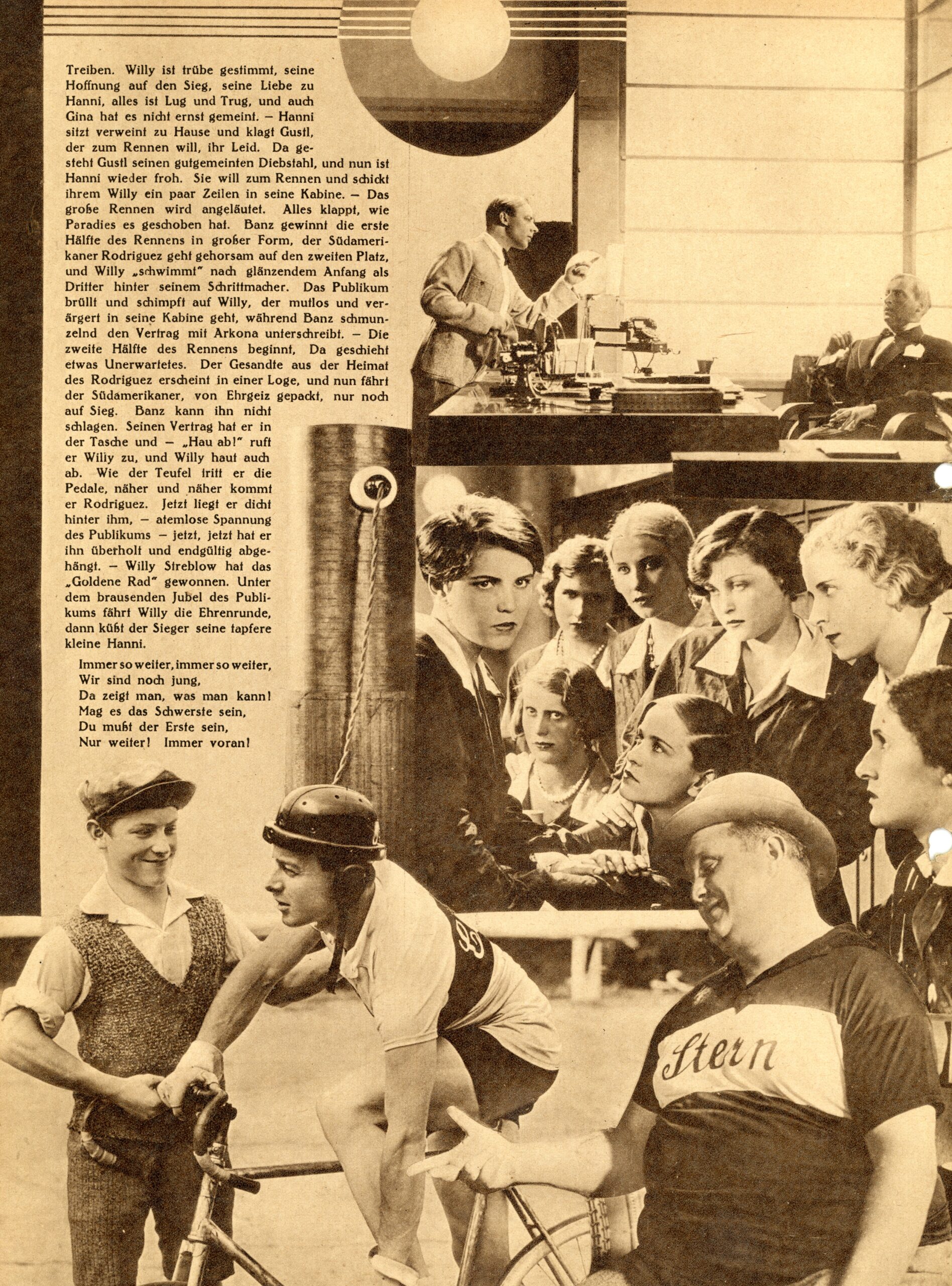 Heinz R¸hmann als Radrennfahrer Willy Streblow (Mitte auf Fahrrad) in der Filmkomˆdie ‚Strich durch die Rechnung‘ von Alfred Zeisler. Die Handlung des Films basiert auf dem Roman von Fred Antoine Angermayer.