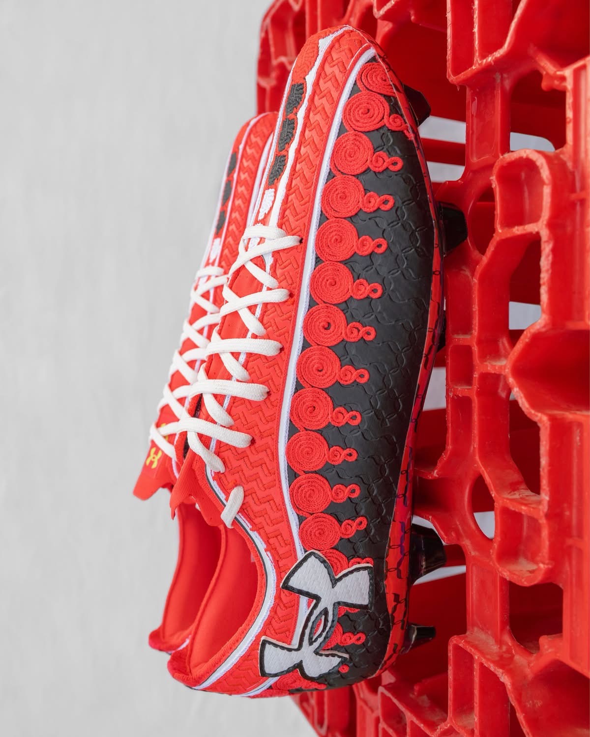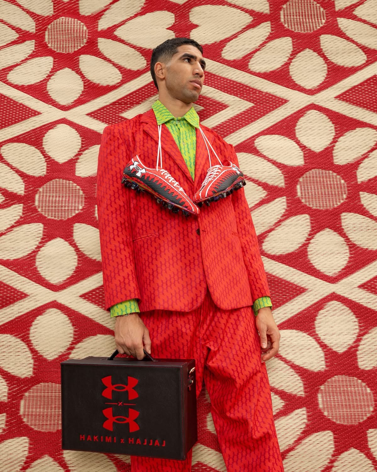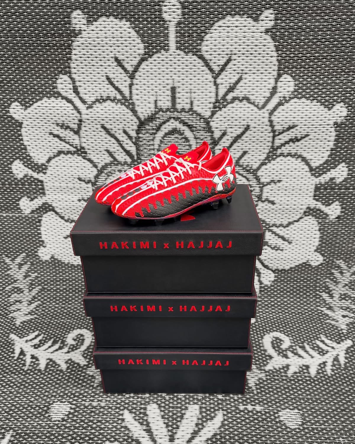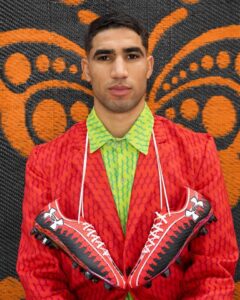 Mais la rencontre entre Hassan Hajjaj et Achraf Hakimi ne s’arrête pas à un café. Elle se prolonge sur la pelouse, ou plutôt juste à côté, dans une paire de crampons qui a déjà fait couler beaucoup d’encre. Les Under Armour Shadow 3, créées spécialement pour le joueur, sont bien plus qu’un accessoire sportif. Ce sont trente paires seulement, façonnées à la main, calibrées à la pointure exacte du joueur, emballées dans des boîtes artisanales venues de Marrakech. Visuellement, elles frappent. Rouge et noir, lacets blancs, détails inspirés du sfifa, ce tressage délicat qui borde les djellabas. On dirait presque une pièce de costume, un clin d’œil à un Maroc qui se réinvente sans jamais renier ses racines. Hassan Hajjaj y glisse sa signature, ce mélange de pop, de tradition et d’audace qui transforme chaque objet en histoire. Techniquement, la chaussure reste fidèle à Under Armour : légèreté, maintien, réactivité. Mais ce qui fascine, c’est ce qu’elle raconte. Elle dit qu’un joueur peut porter son pays autrement qu’en chantant un hymne. Elle dit que le football n’est pas qu’un sport, mais un langage. Elle dit qu’un crampon peut devenir un symbole.